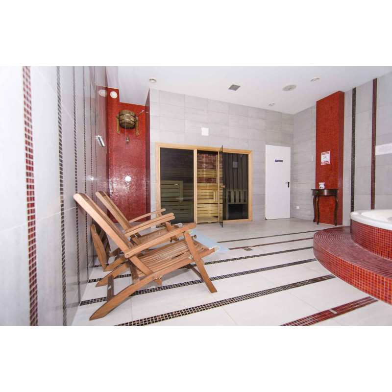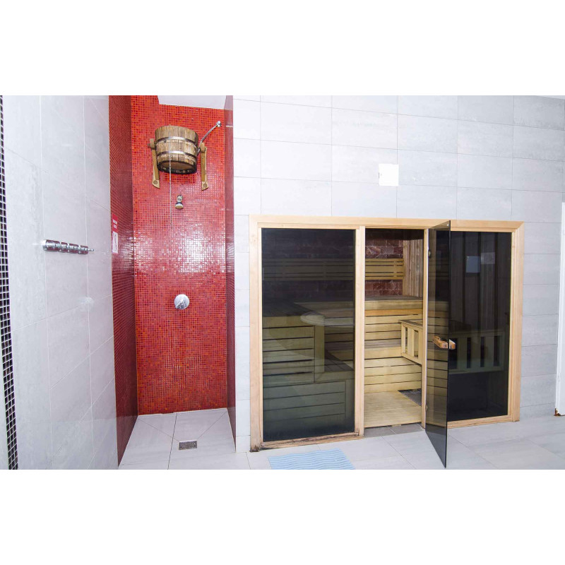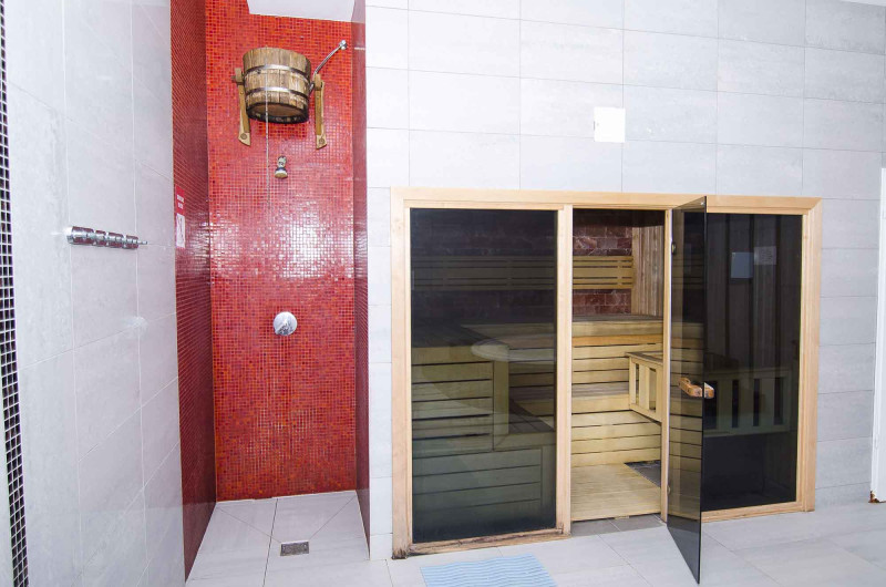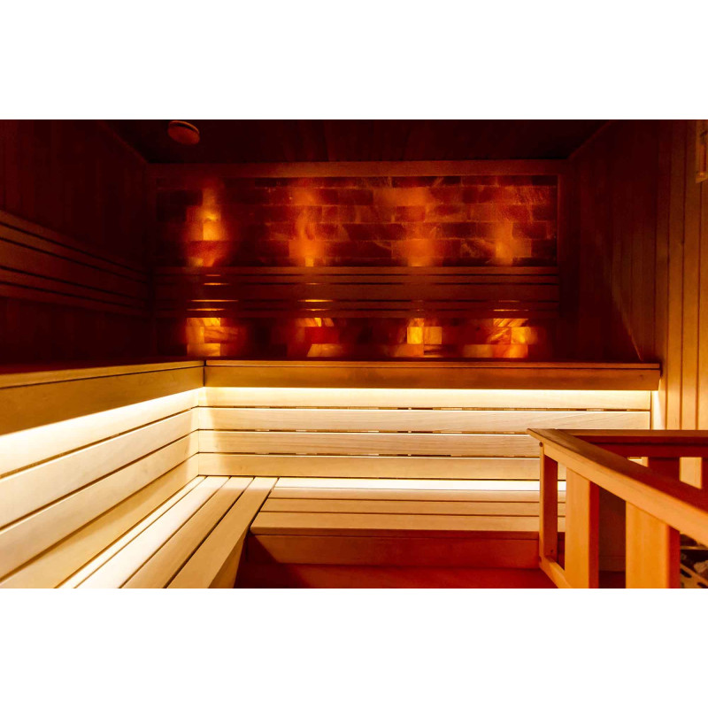 За да доставя удоволствие не само на тялото, но и на очите, е монтирана стена от гладки тухли от хималайска сол, осветена от полилеи, монтирани под облегалката.