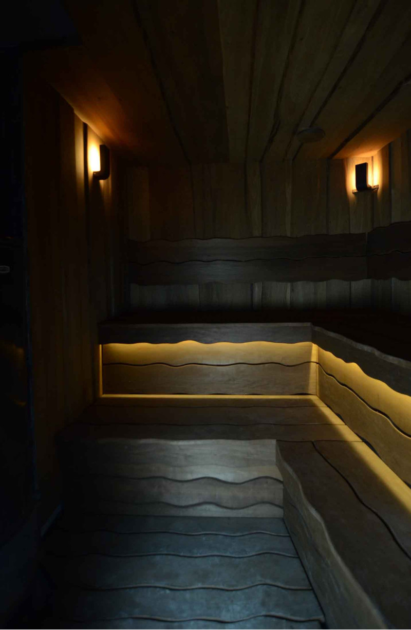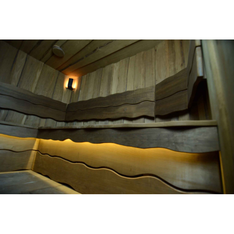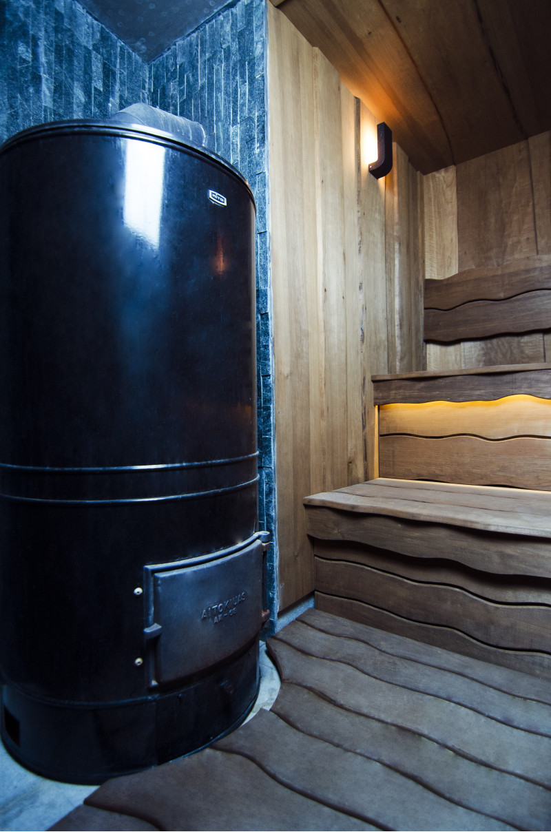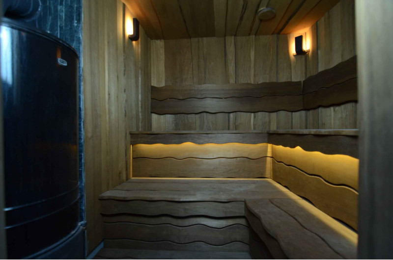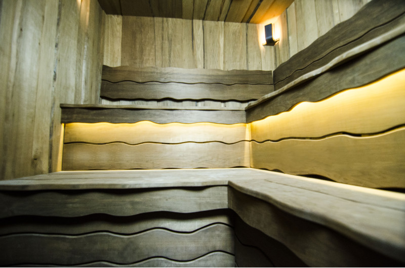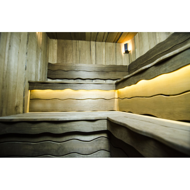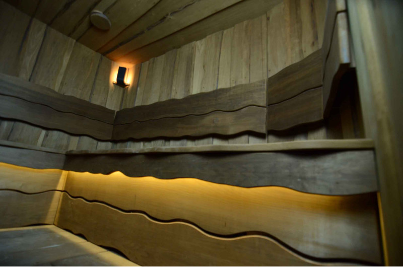 За украса на стените и тавана на сауната, както и пейките и облегалките е използвано изгорено трепетликово дърво. За да придадат на сауната уют и естественост, са избрани рендосани еднорязани дъски.