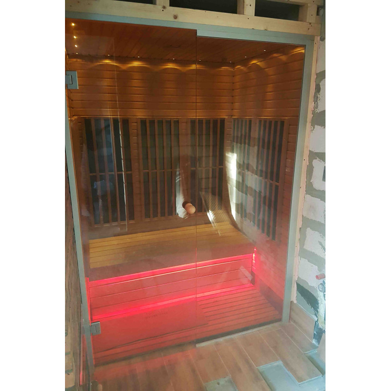 Оборудване за сауна: Инфрачервен нагревател HARVIA CARBON със защитна решетка, контролен панел Harvia Griffin Infra CG170I. Този панел може да се използва за управление на времето на работа, температурата, осветлението и вентилацията. Таймерът може да се използва, за да настроите кога сауната трябва да е готова. Хромираният цифров контролен панел е идеално съвместим с друго модерно оборудване за сауна.