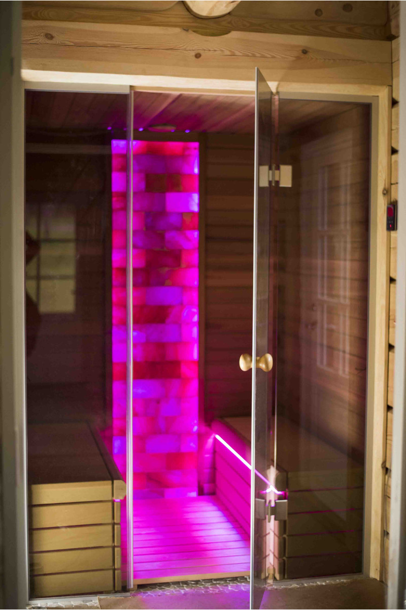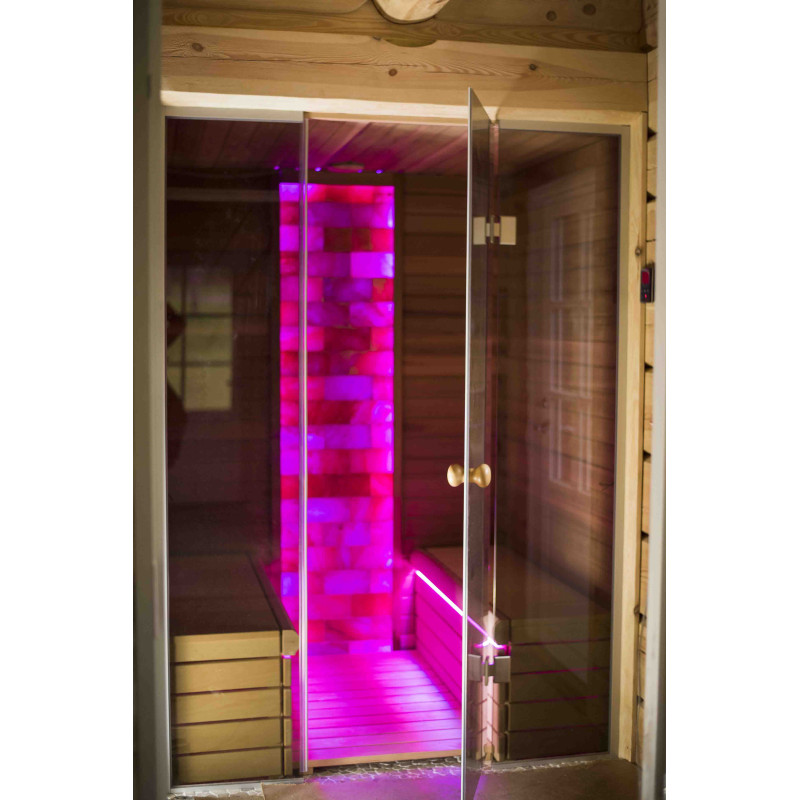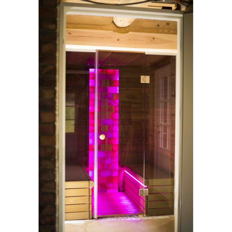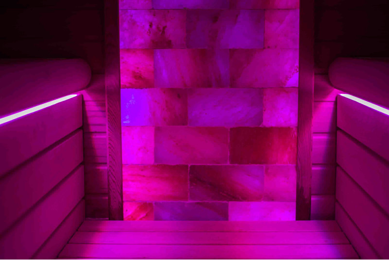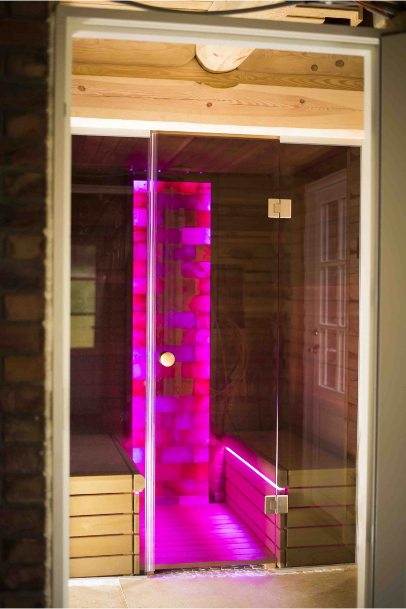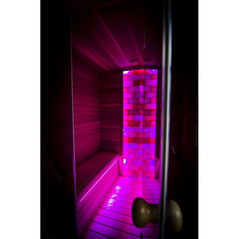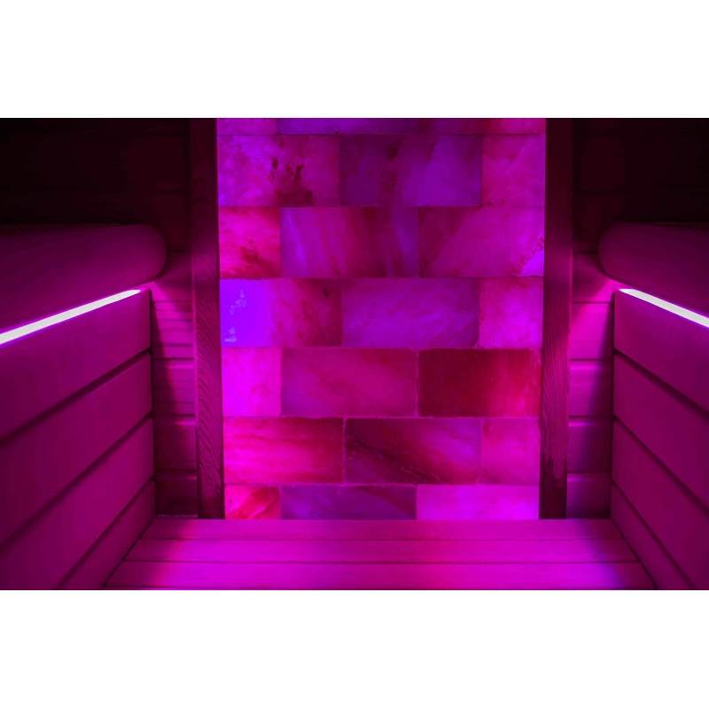 Стената от тухла от хималайска сол, избрана за декорация на сауната с вградено цветно RGB осветление, управлявано от безжичен смяна на цветовете, създава уютна среда и допълнително засилва ефекта на сауната.