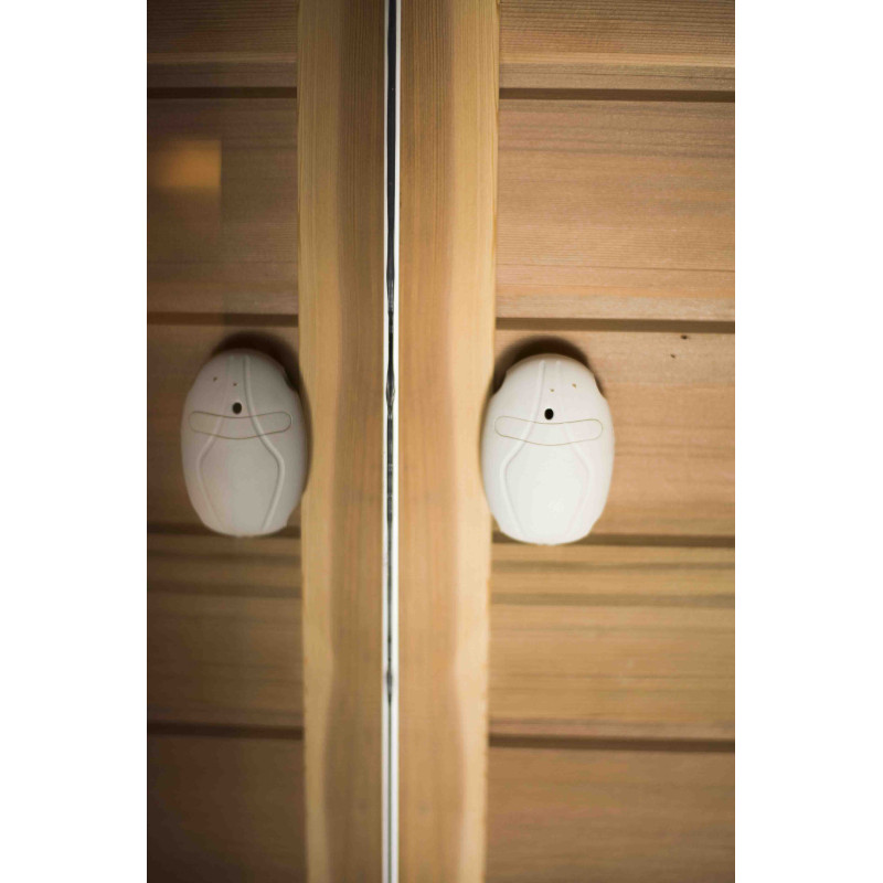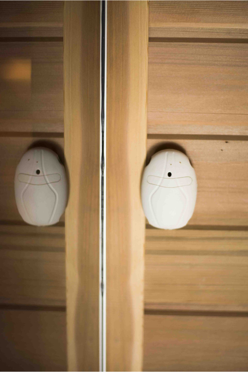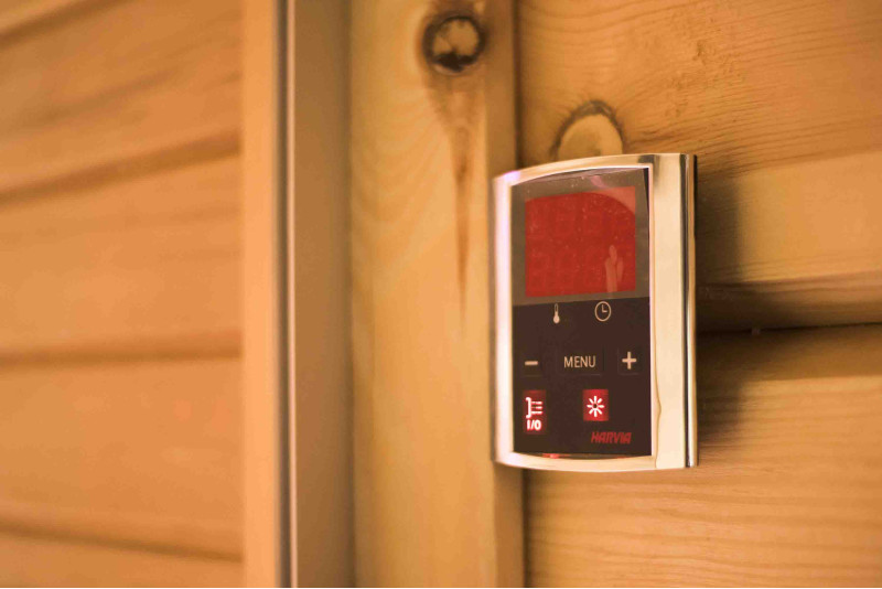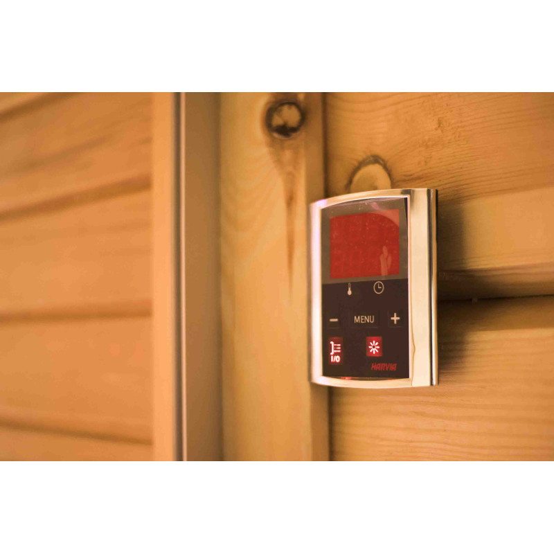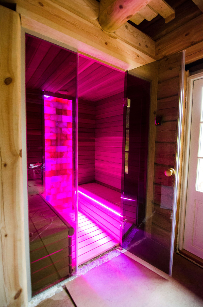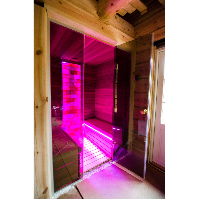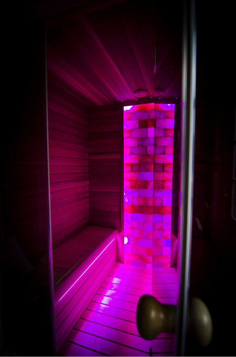 Стената от тухла от хималайска сол, избрана за декорация на сауната с вградено цветно RGB осветление, управлявано от безжичен смяна на цветовете, създава уютна среда и допълнително засилва ефекта на сауната.