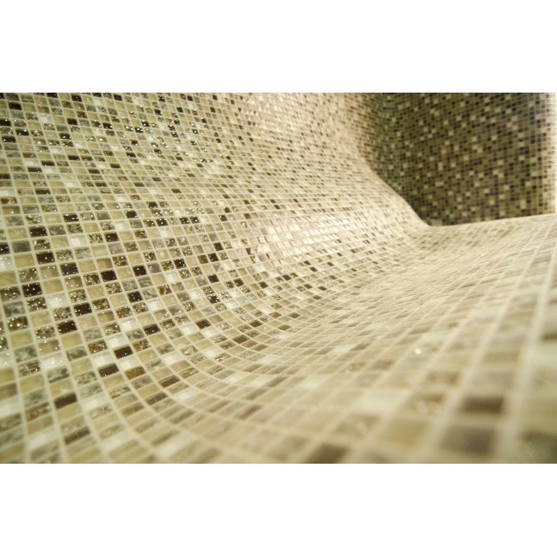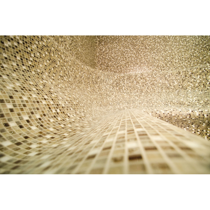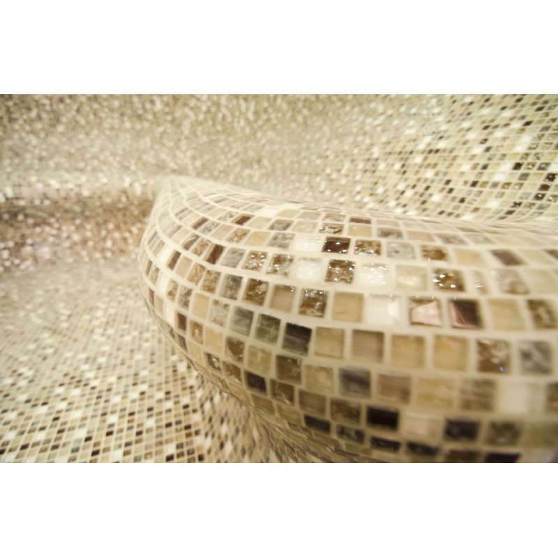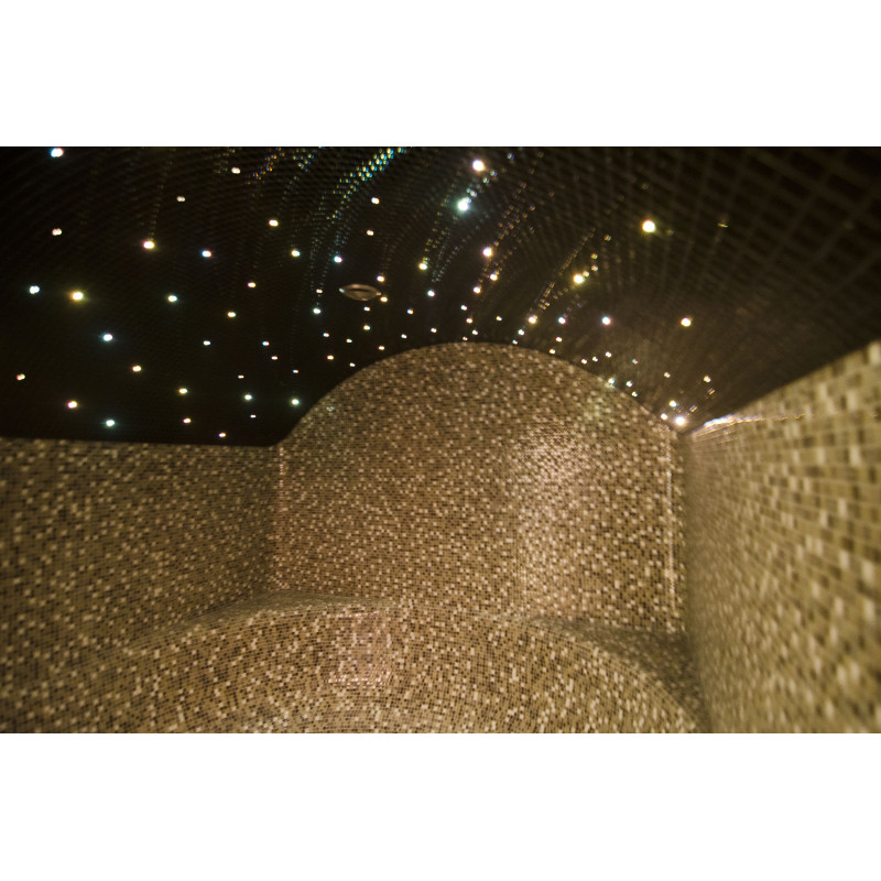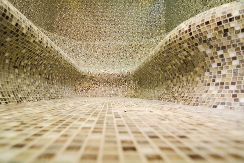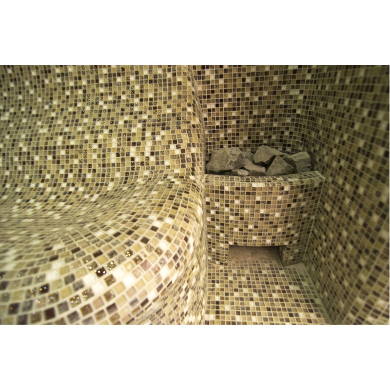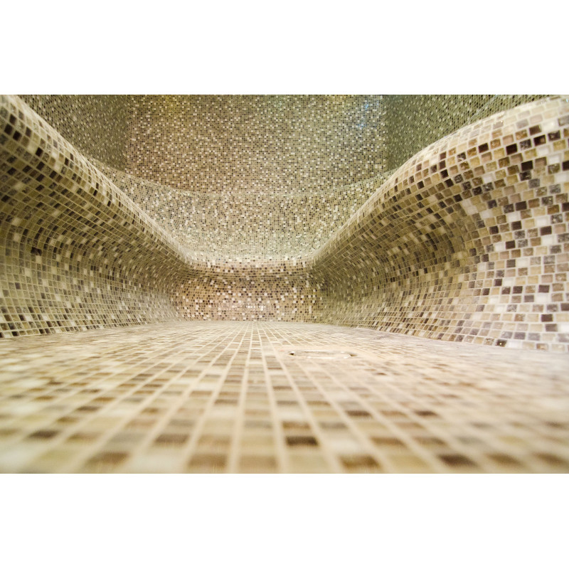 Вратите от закалено стъкло, устойчиви на влага и температурни колебания, което е особено важно при парните бани. Каса на вратата - бежов мрамор.