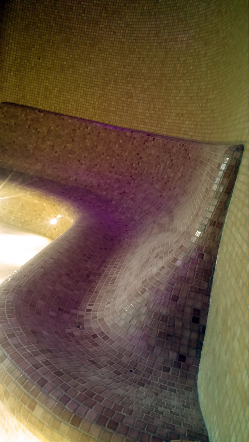 Довършителни работи - подове, стени, пейки, декорирани с натрошени стъклени мозаечни плочки.