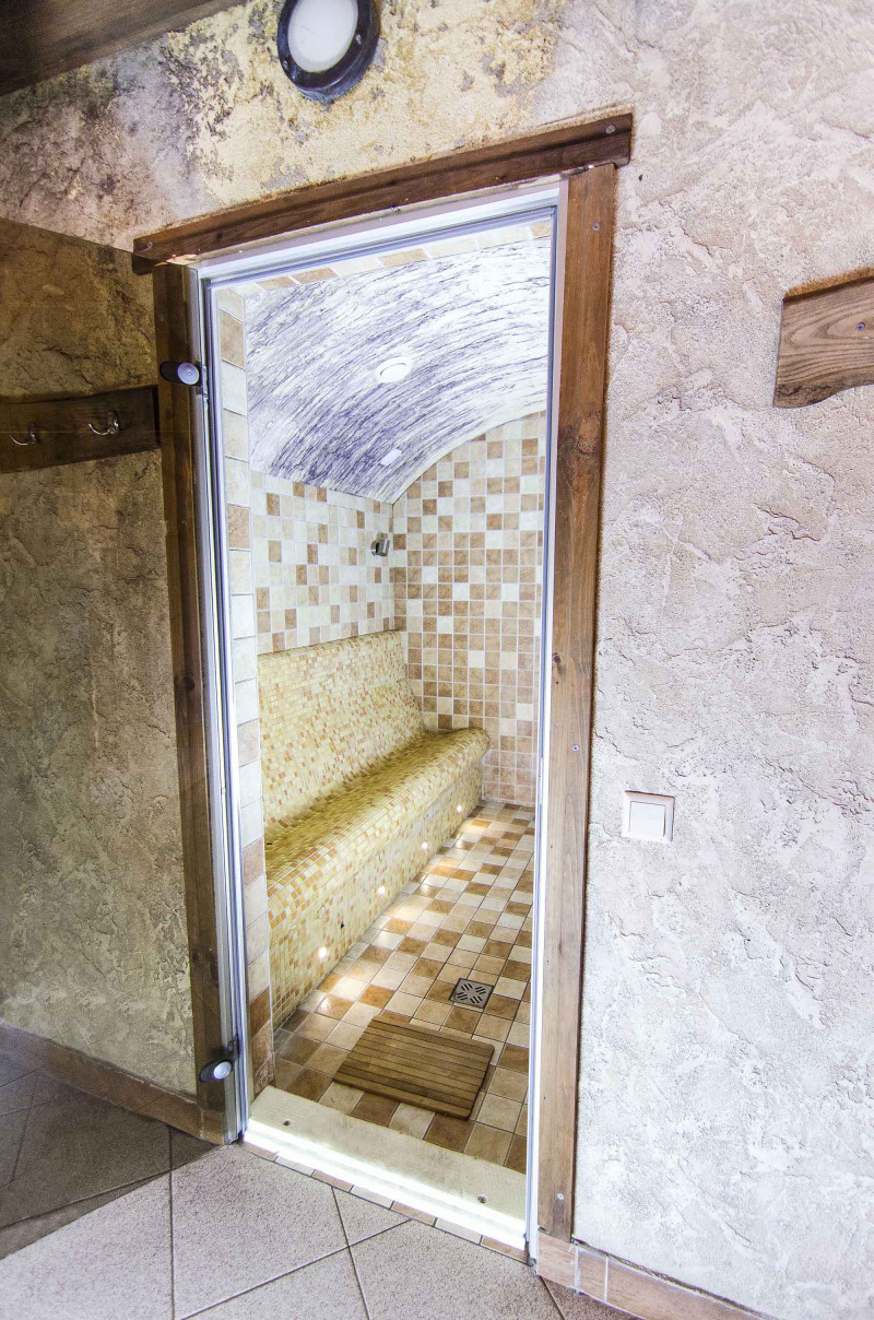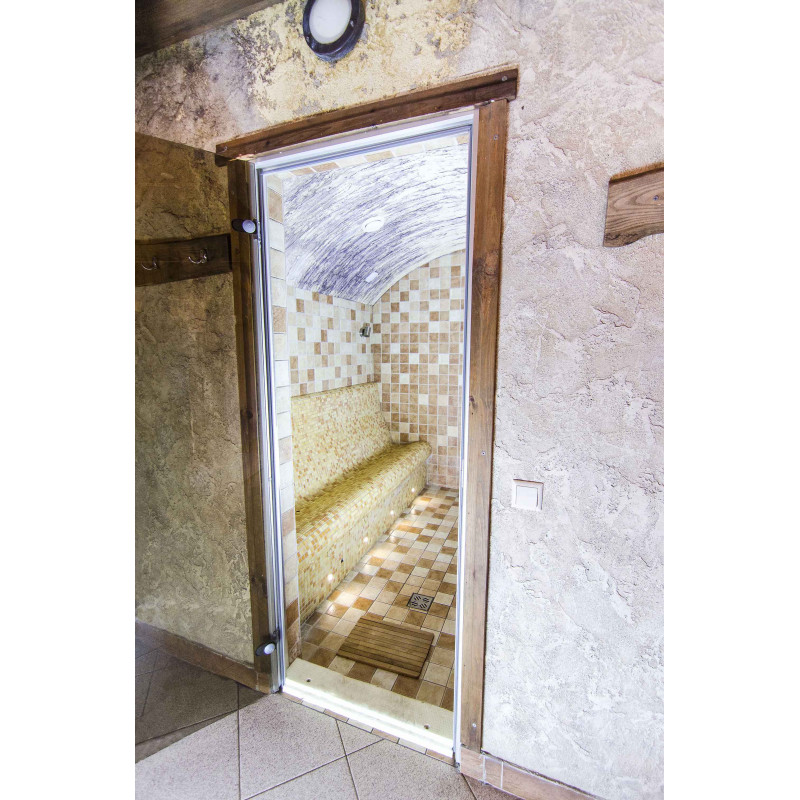 Вратите със старата дървена каса бяха сменени с подходящи за парна сауна - с алуминиева каса, тонирано, закалено стъкло. Този тип врати и каса са устойчиви на топлина и влага, температурни колебания, не се изкривяват.