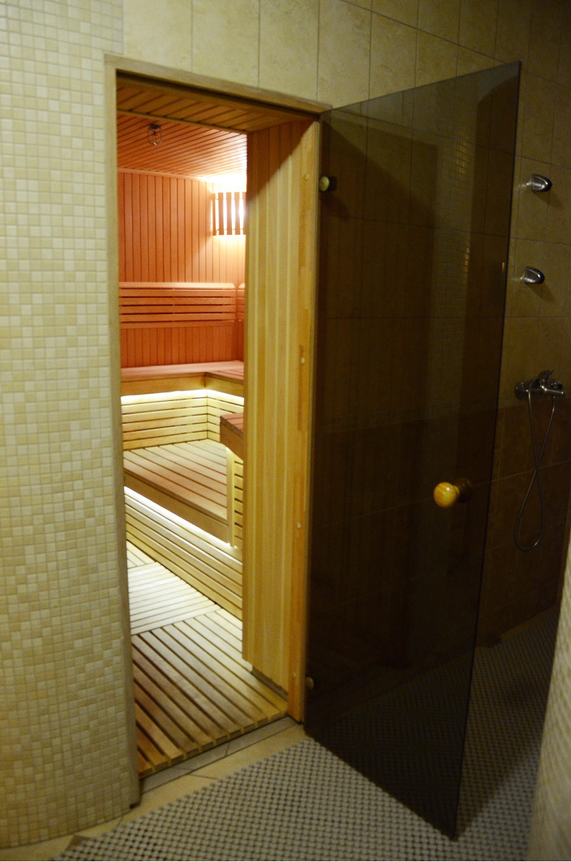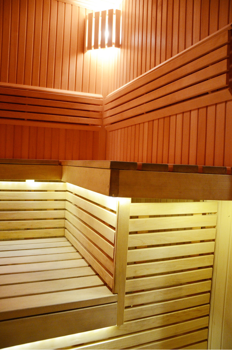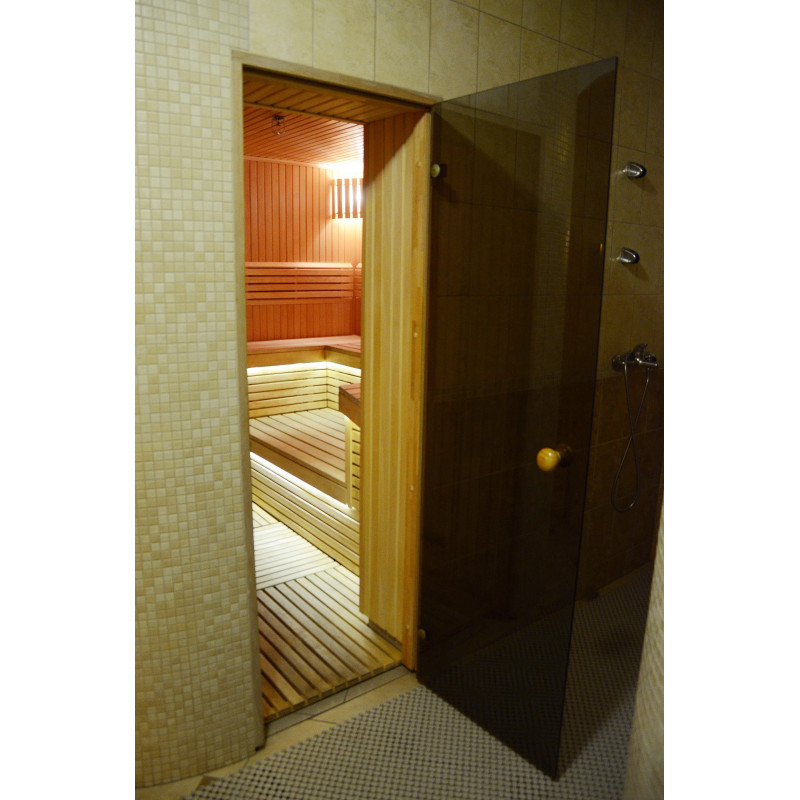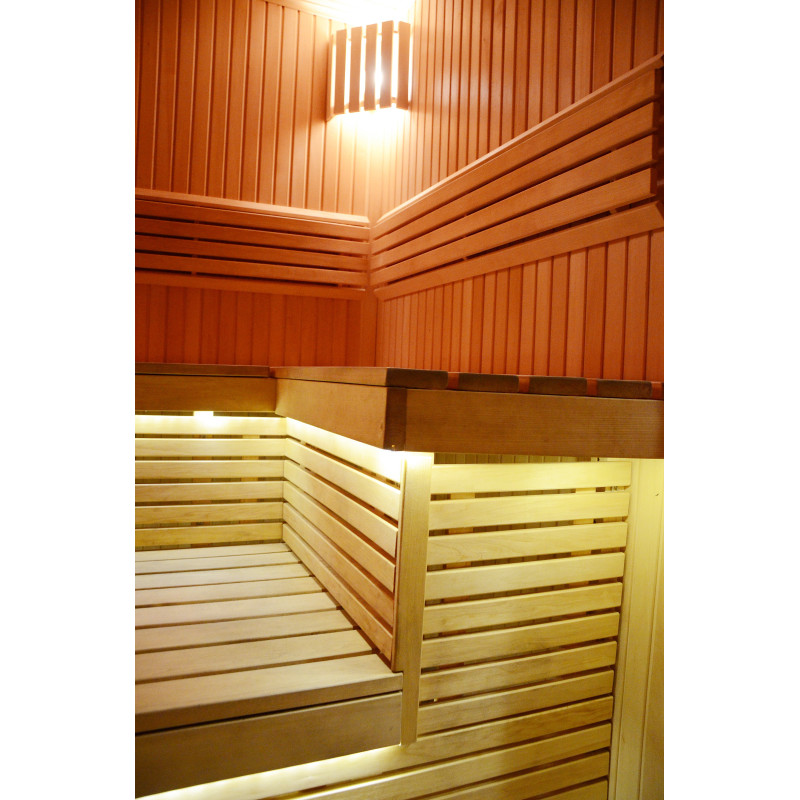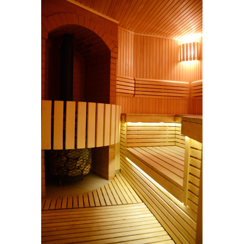 Стените и пейките на сауната са изработени от най-висококачествена ламперия от липа, която се отличава със своя ярък, красив цвят и излъчва приятен естествен аромат. От дърво са изработени и капаци на осветителни тела, облегалки и оригинална защитна ограда около нагревателя.