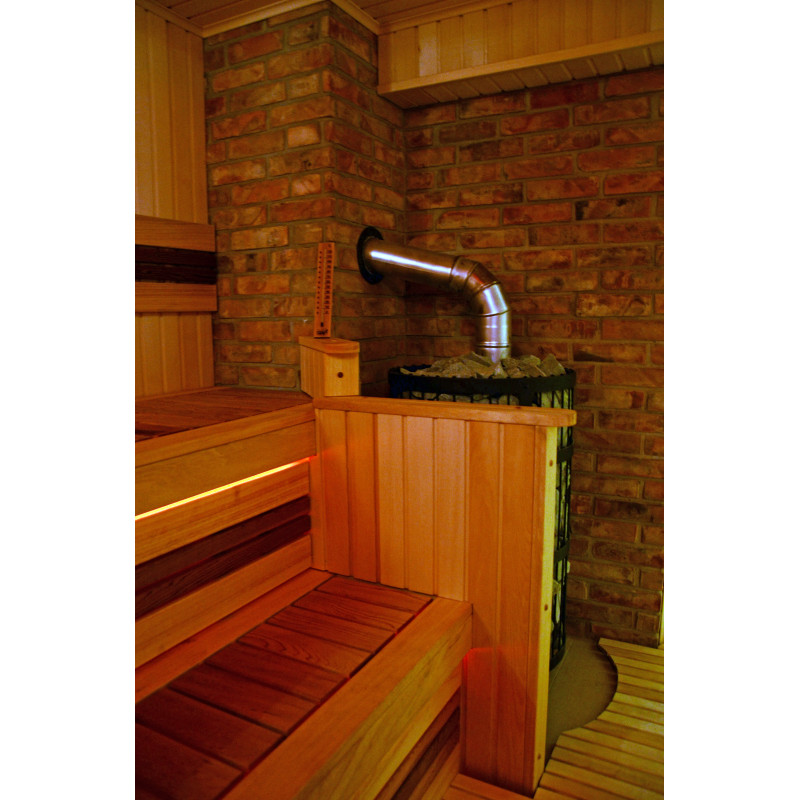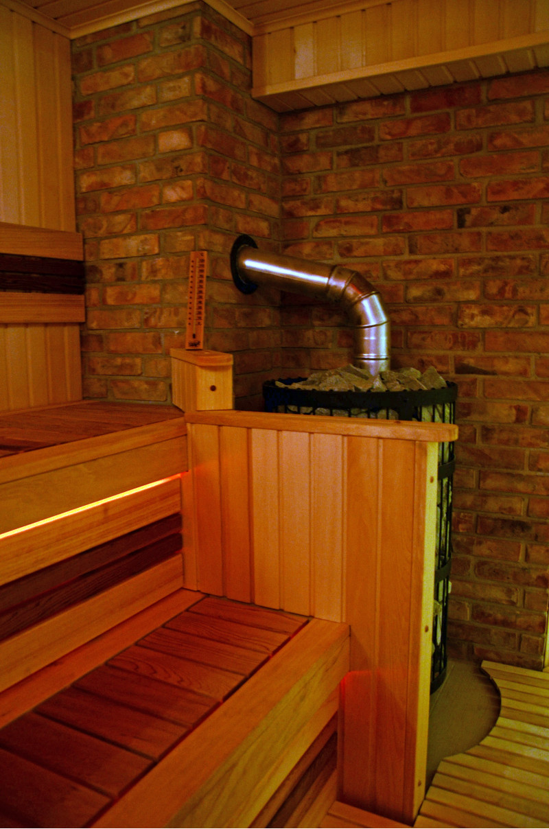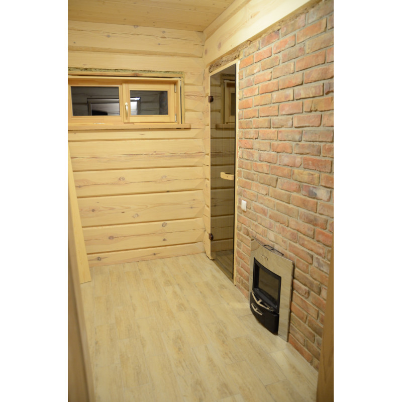 Оборудване - нагревател на дърва Harvia Legend 300 Duo. Черната стоманена рамка на нагревателя побира голямо количество камъни, което ви позволява да се насладите на топлината, която излъчват дори при липса на високи температури. Топлината няма да изчезне дори след угасване на огъня. Благодарение на модерната структура на скара дървата за огрев горят по-ефективно в нагревателите Legend. Намаленото изискване за безопасно разстояние за запалими материали в сравнение с конвенционалните нагреватели улеснява планирането на стая за сауна.