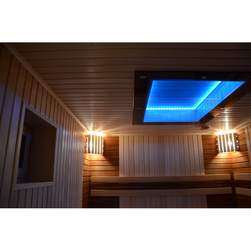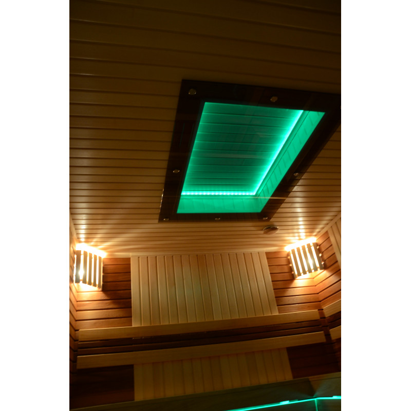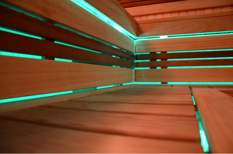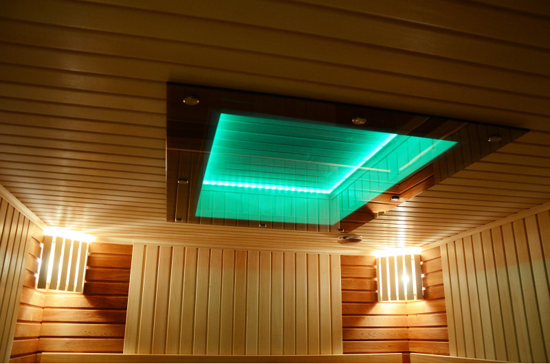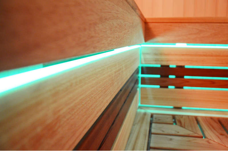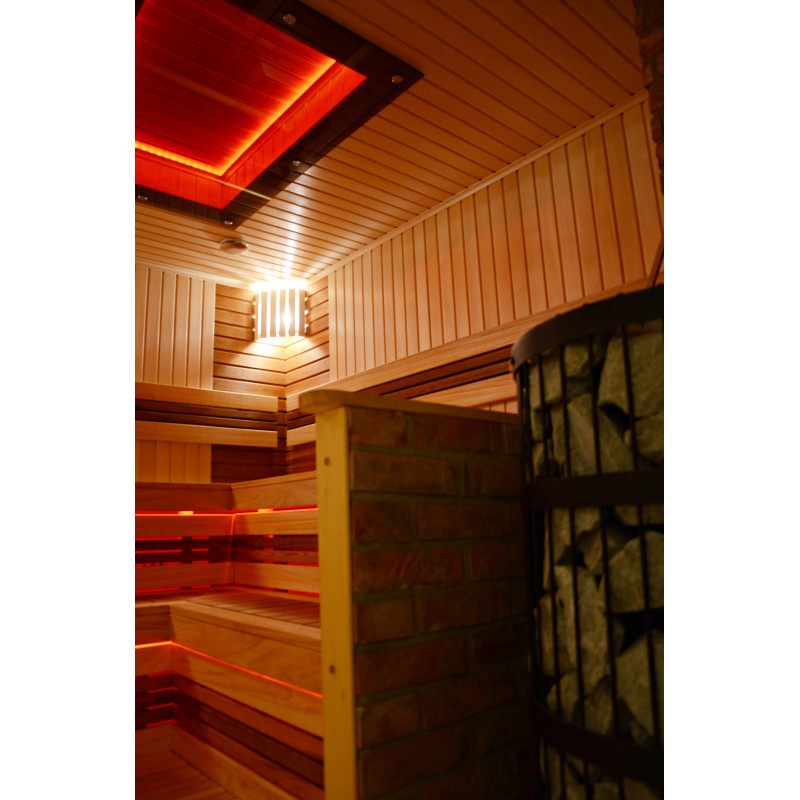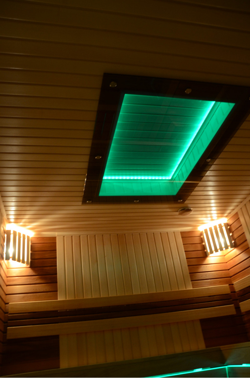 На тавана и под пейките - LED RGB цветно осветление, чиито цветове могат да се сменят за създаване на подходяща атмосфера и настроение. Стенно осветление - LED бели топъл цвят лампи с дървени капаци. Завивките помагат за затъмняване на светлината, добавят повече уют в сауната. Освен това предпазва осветителните тела от вода, пара и топлина.