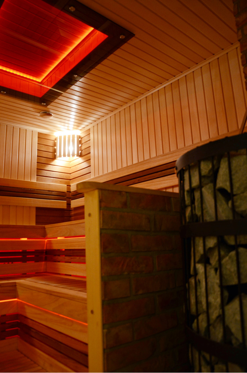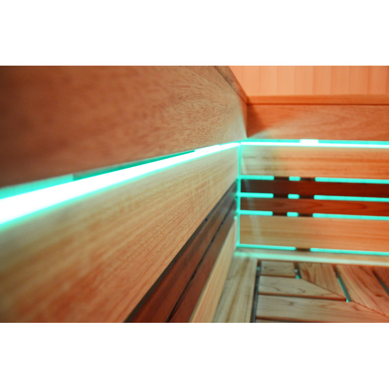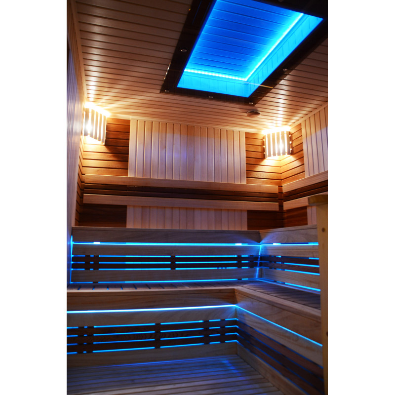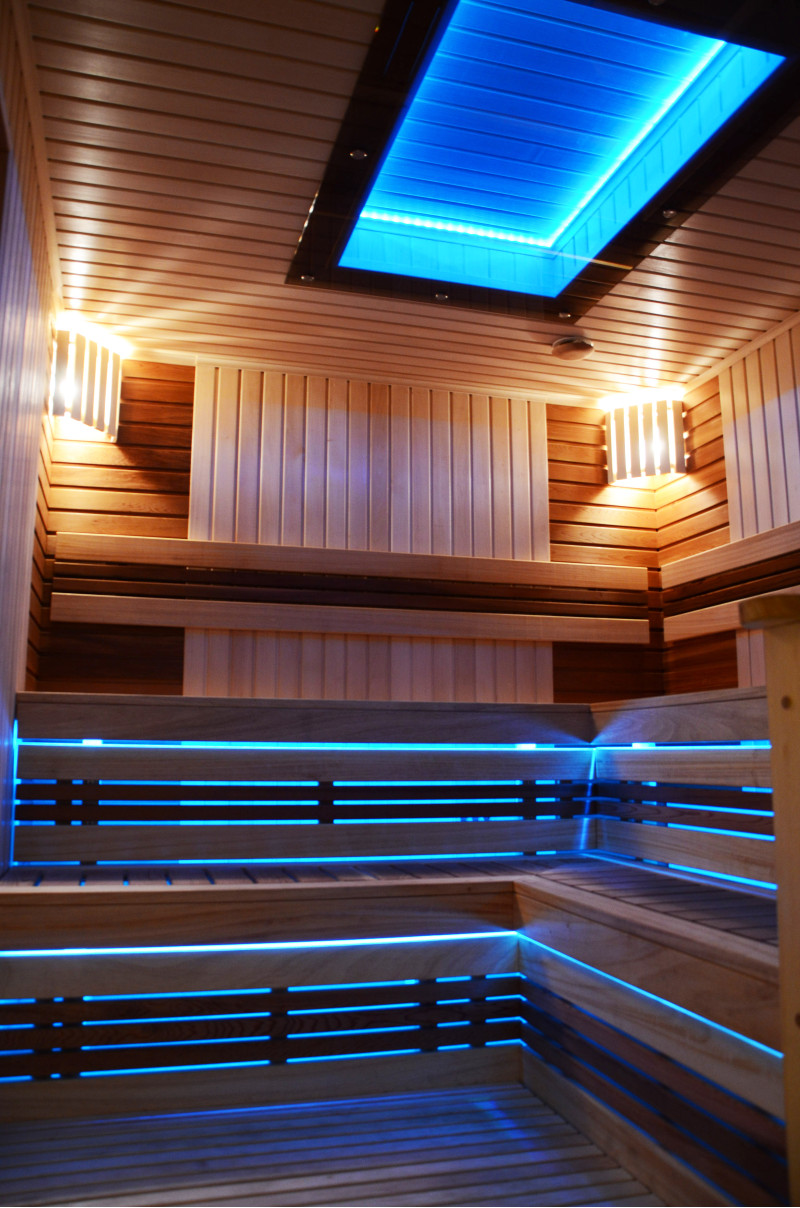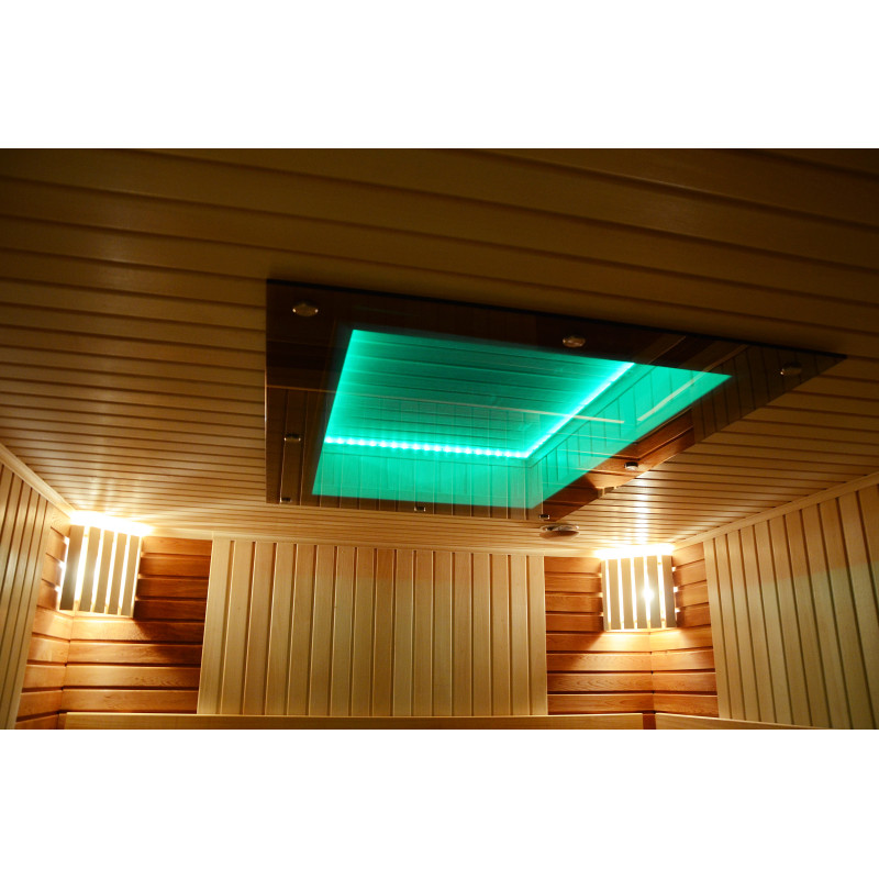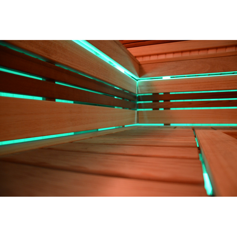 На тавана и под пейките - LED RGB цветно осветление, чиито цветове могат да се сменят за създаване на подходяща атмосфера и настроение. Стенно осветление - LED бели топъл цвят лампи с дървени капаци. Завивките помагат за затъмняване на светлината, добавят повече уют в сауната. Освен това предпазва осветителните тела от вода, пара и топлина.
