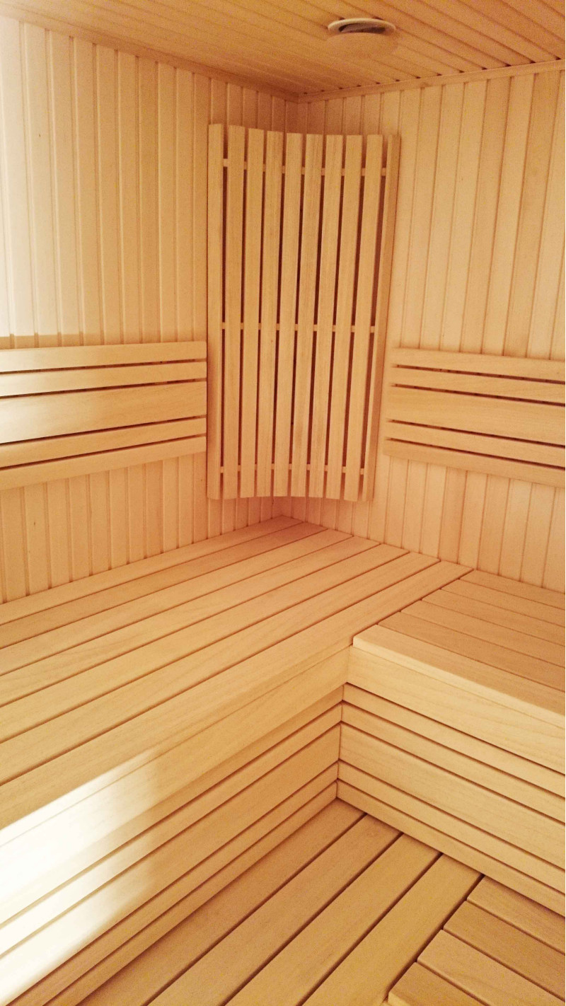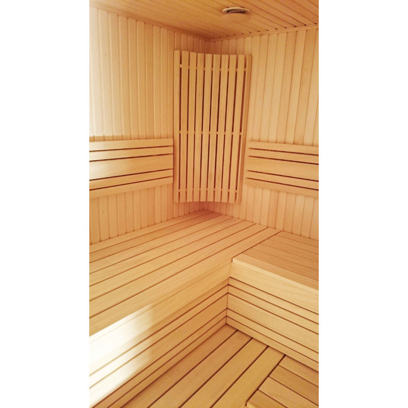 Таваните и стените на сауната са покрити с липов сайдинг, както и опорите, подовите решетки и нагревателните огради. Шезлонгите за сауна са от най-висококачественото дърво абачи. Дървото за легла, подпори и стени е импрегнирано и лакирано, смазано - специално подготвено за използване при топлина и влажност.