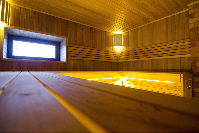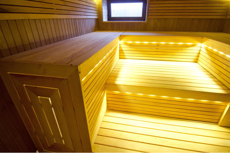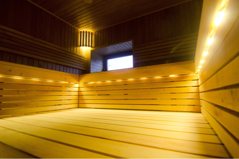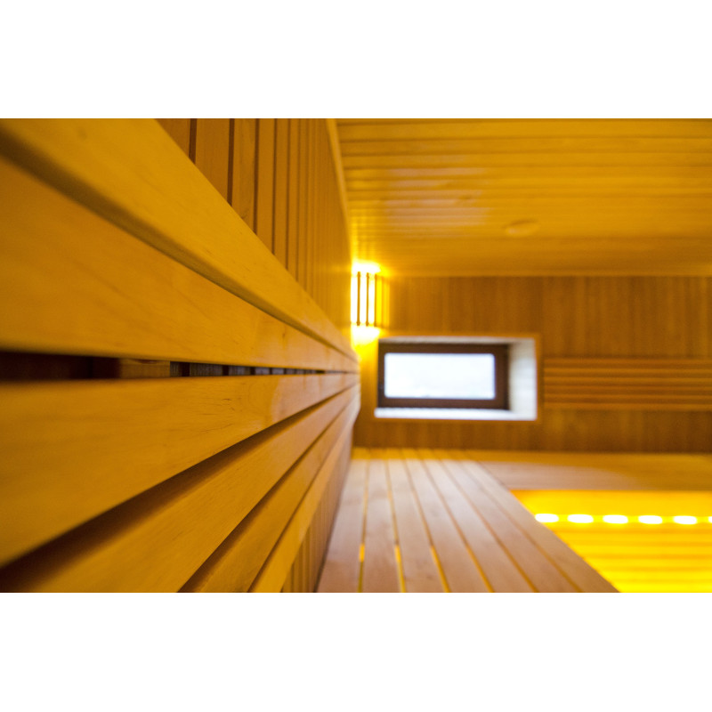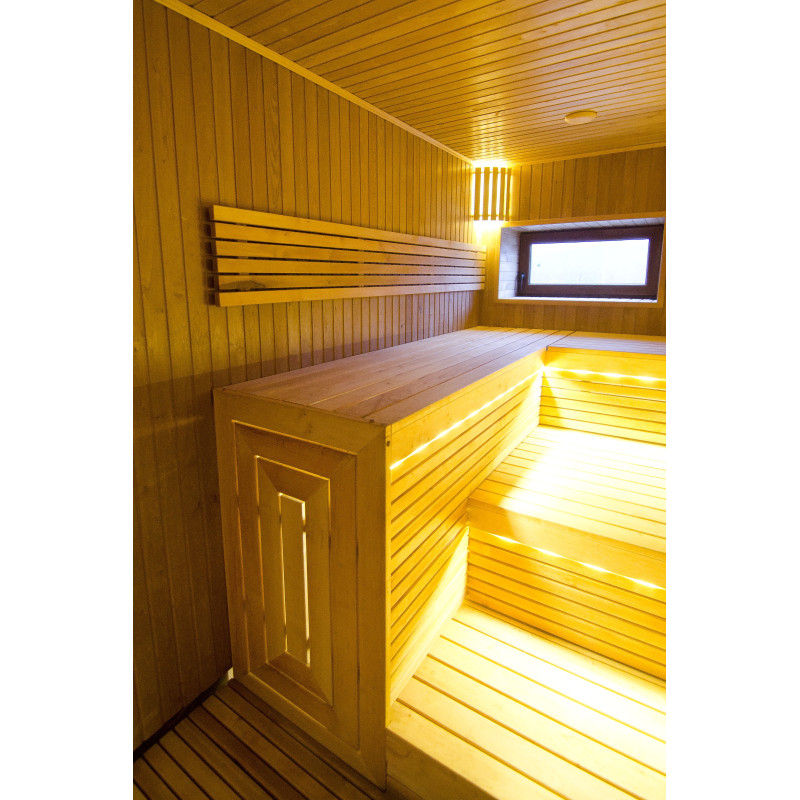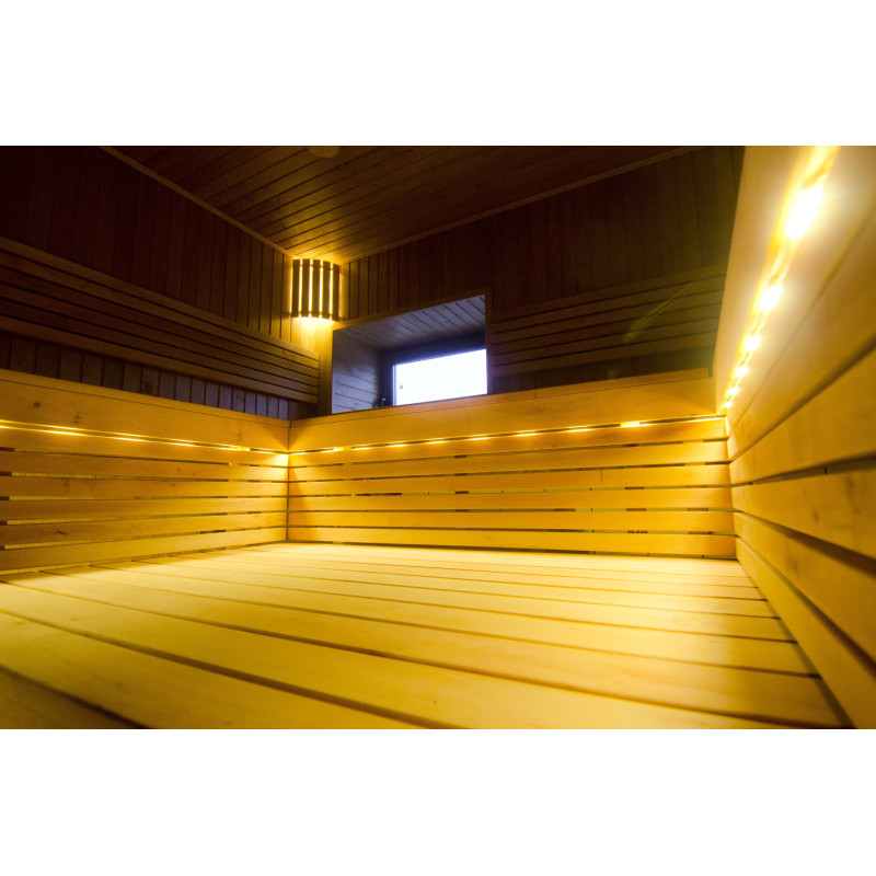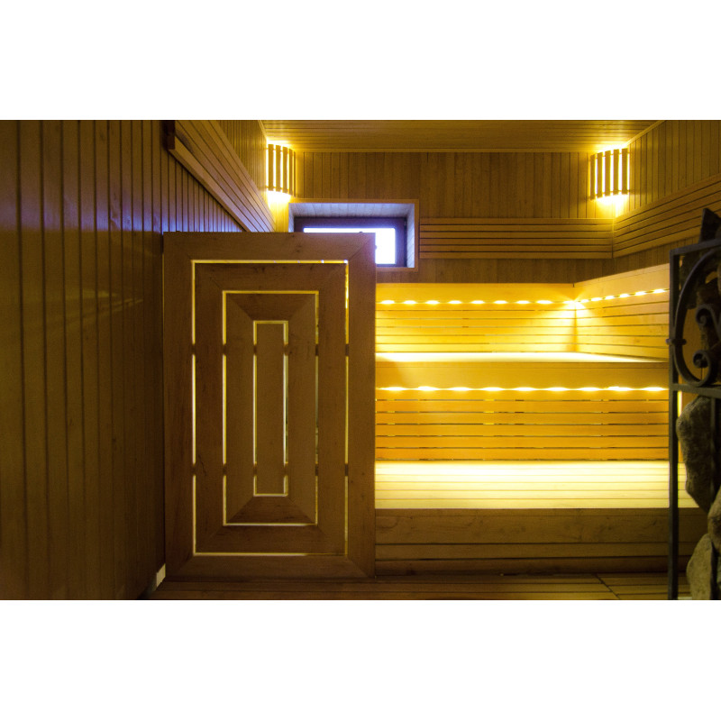 Сауната е оборудвана с LED осветление в топли цветове под шезлонгите и стенни лампи с дървени капаци.
