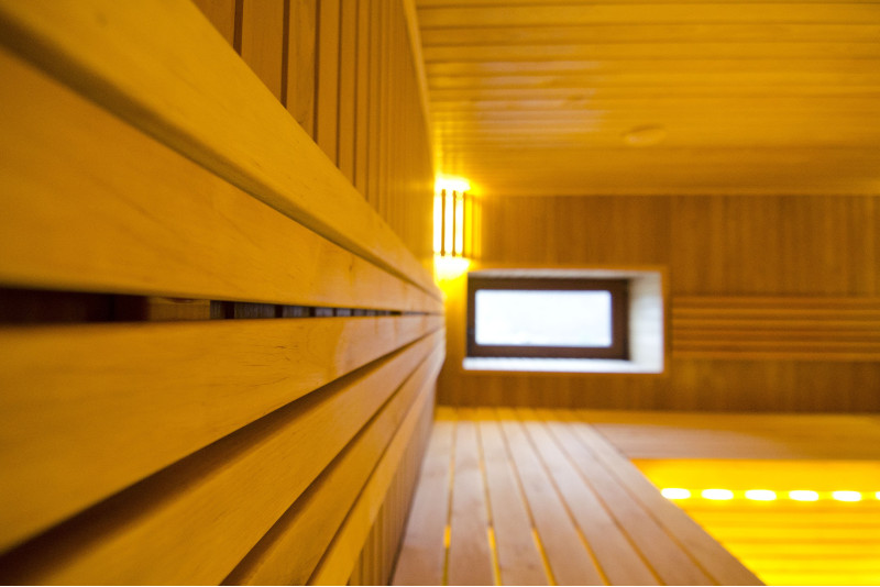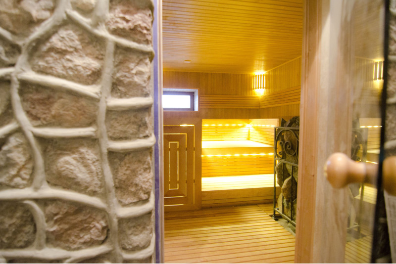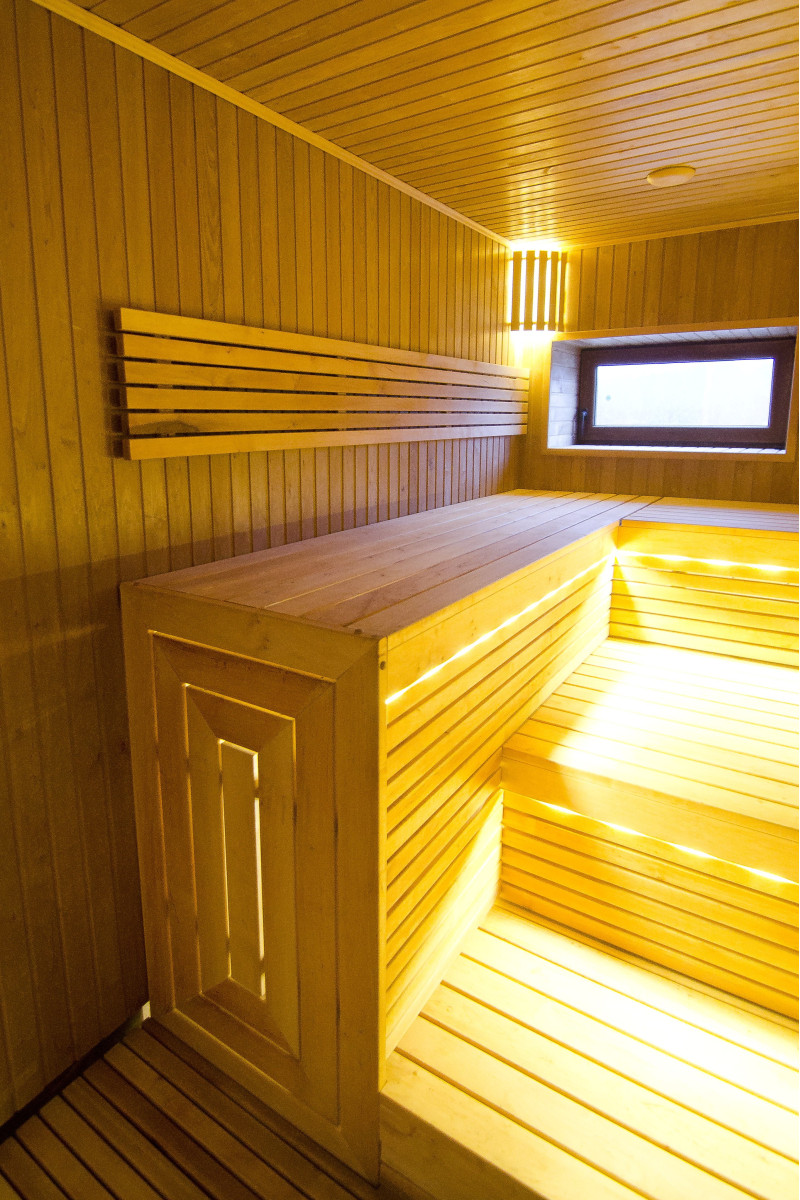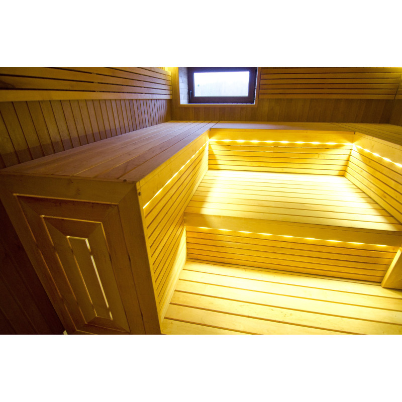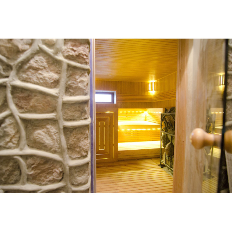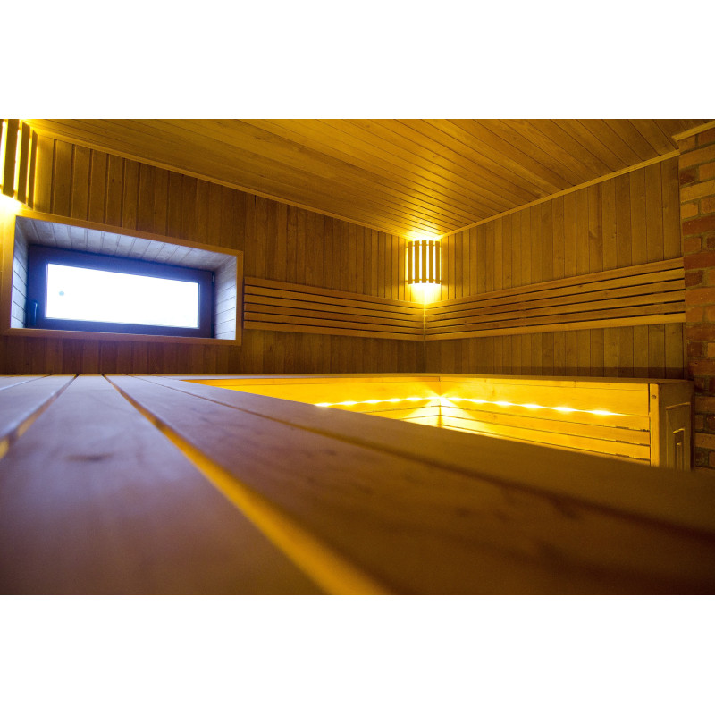 Сауната е оборудвана с LED осветление в топли цветове под шезлонгите и стенни лампи с дървени капаци.
