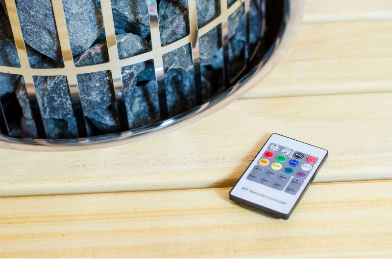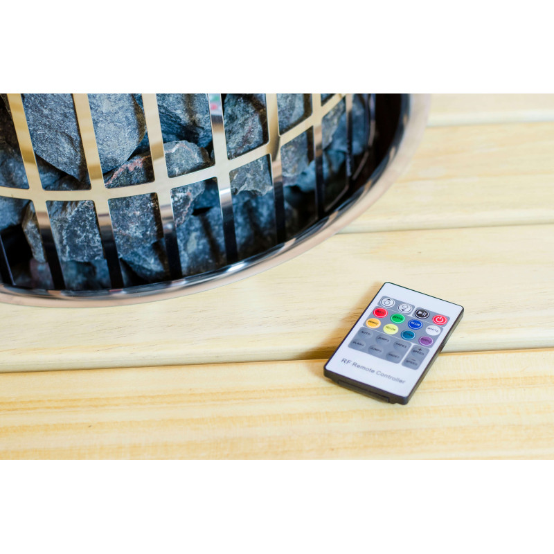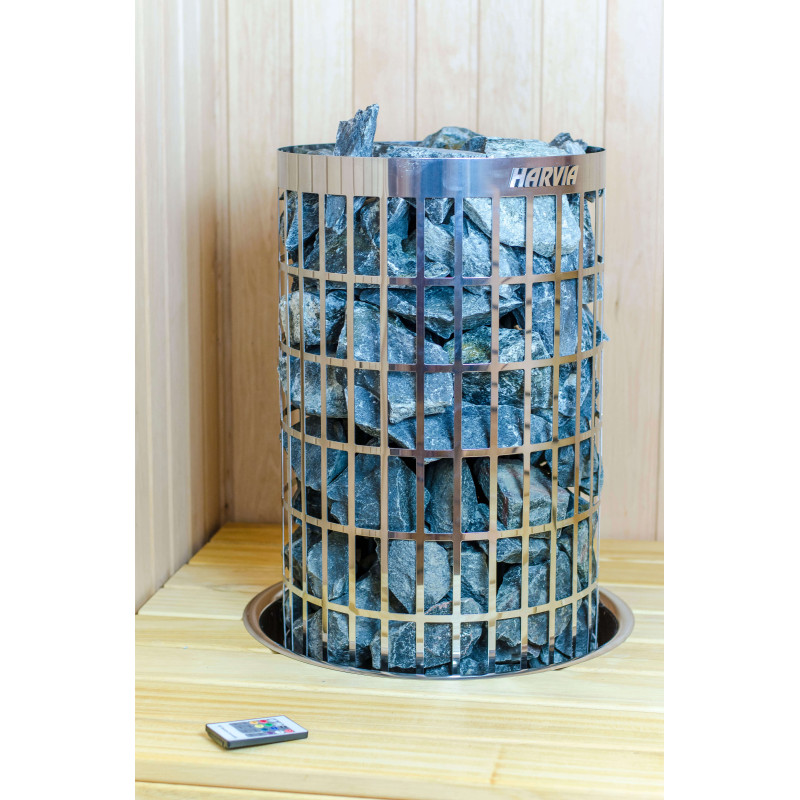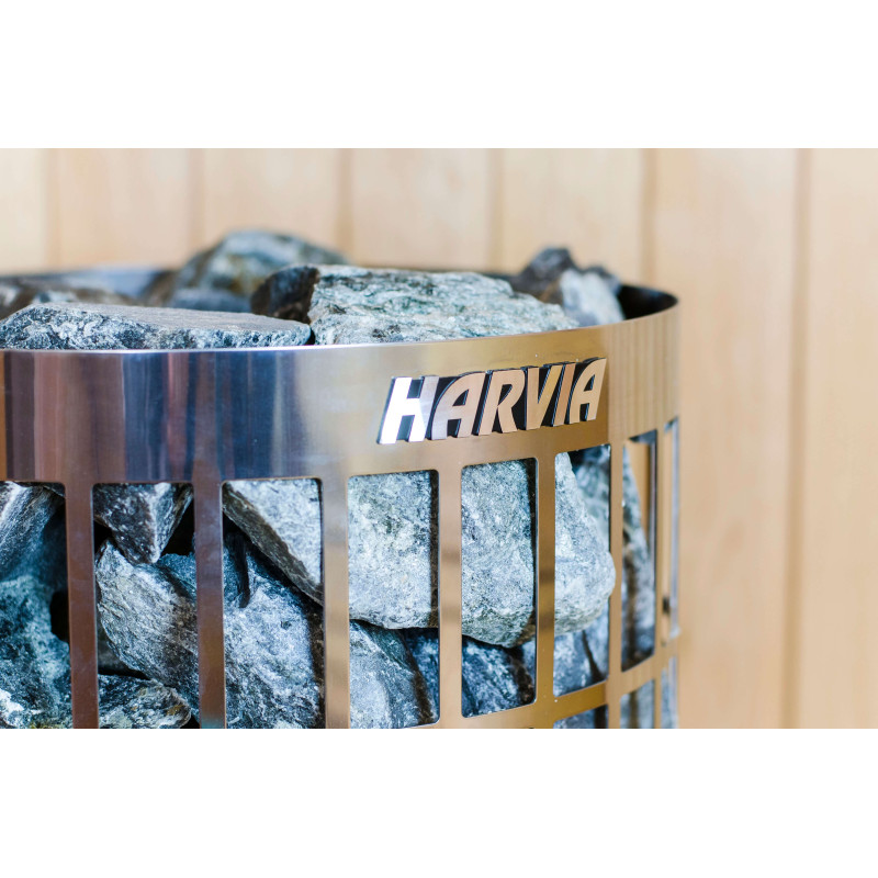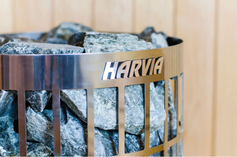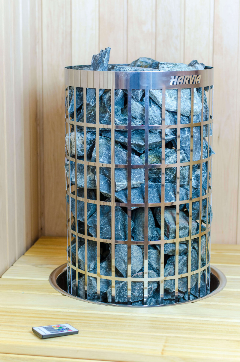 Нагревател - Harvia Cilindro с завършващ пръстен и пълни с габро диабазови камъни. Врати - закалено бронзово стъкло с рамка от черна елша.