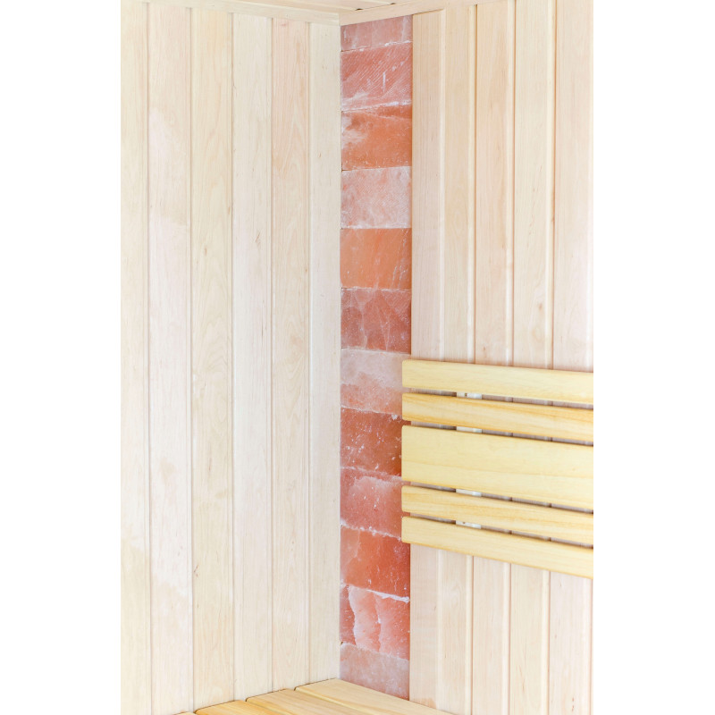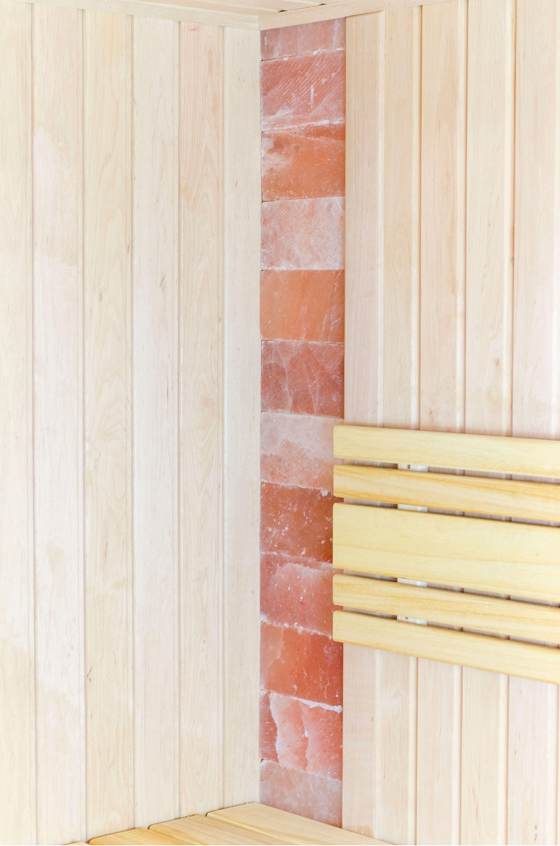 Хималайските солни тухли, избрани за декорация на сауната с вградено осветление, създават уютна среда и допълнително подобряват ефекта на сауната. Камъните от хималайска сол са естествен йонизатор, който ефективно подобрява качеството на въздуха, като излъчва отрицателни йони. Отрицателно йонизираният въздух подобрява здравето, помага за лечение на много заболявания като: бронхиална астма, белодробни и бронхиални заболявания, постинфаркт, хипертония, стомашно -чревни язви, гастрит, заболявания на щитовидната жлеза, дерматит, различни алергии, нервни заболявания, помага за преодоляване на инсулт. Ползите от провеждането на процедурите в такава сауна ще бъдат двойни.