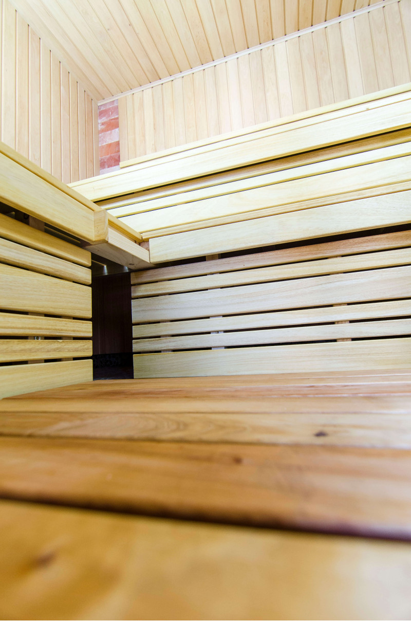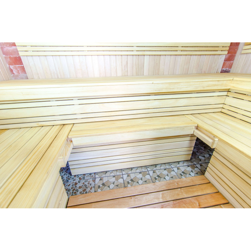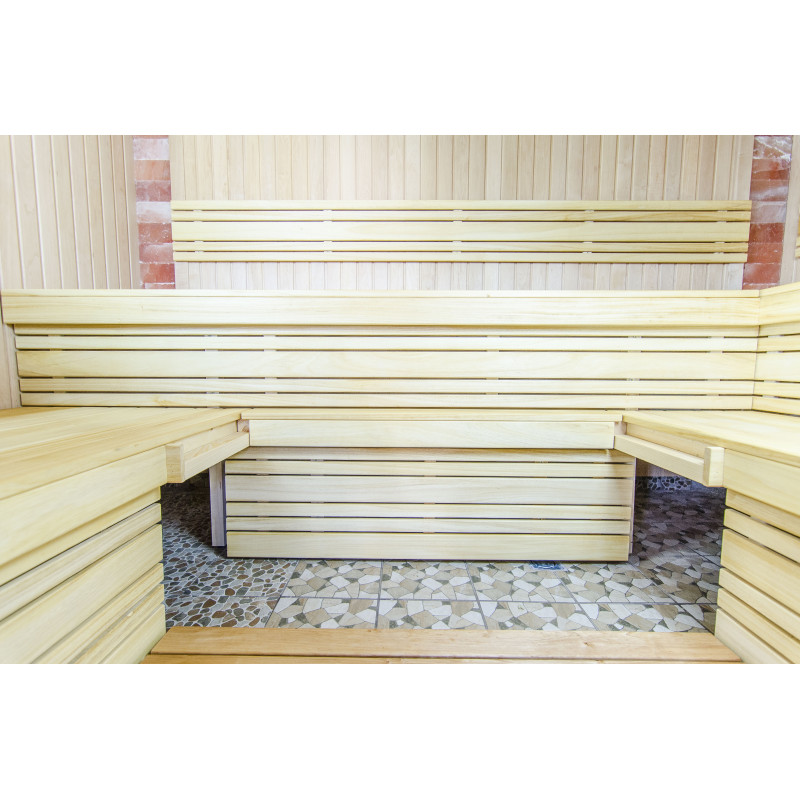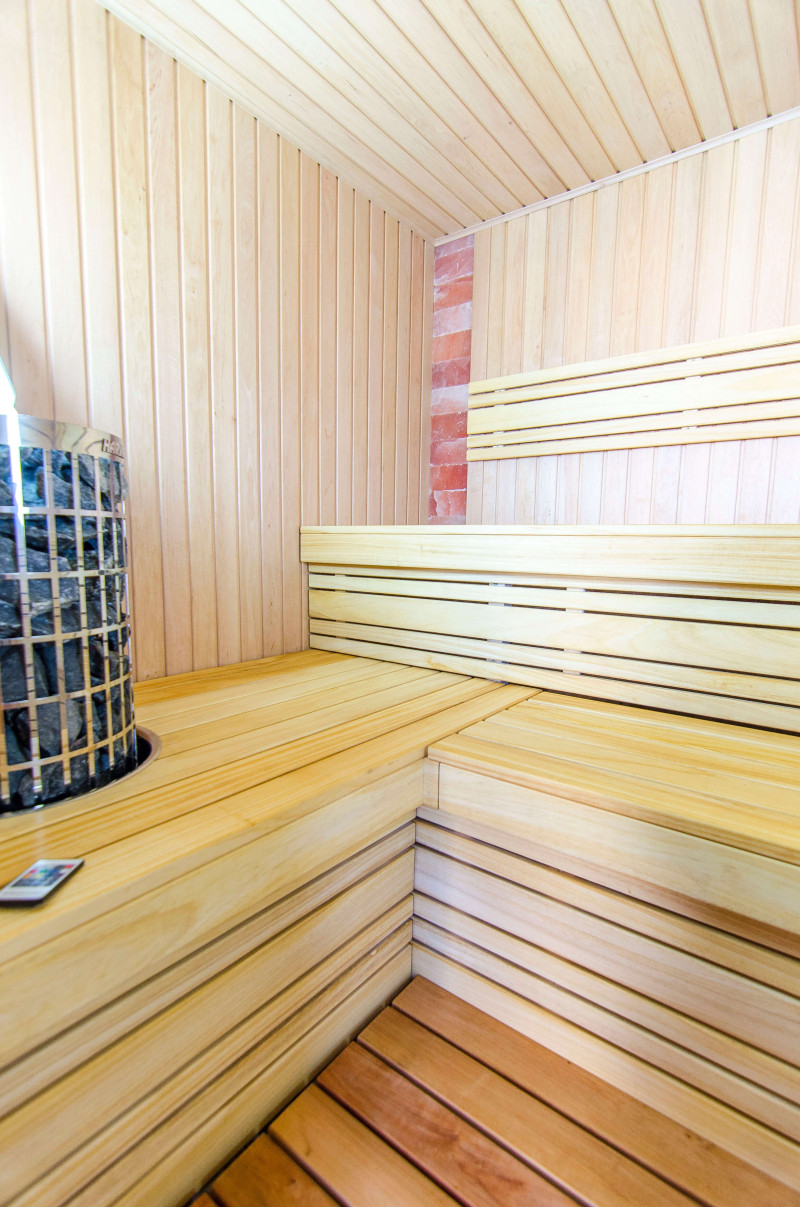 Пейки, облегалки, тавани, стени - от африканска неотопляема висок клас абачи, подови решетки - от черна елша. Облегалките и зад тухлите от хималайска сол разполагат с вградено цветно RGB осветление, управлявано от безжична конзола за промяна на цвета, която подчертава отличителния вид на хималайската сол.