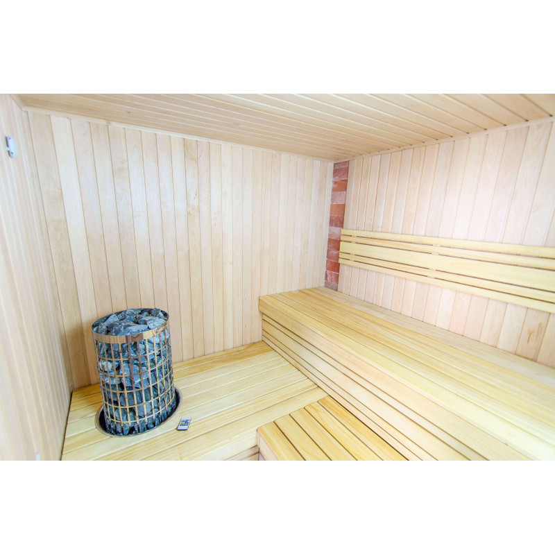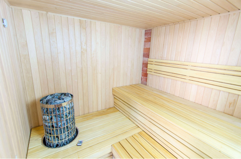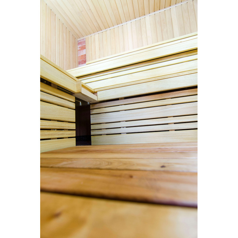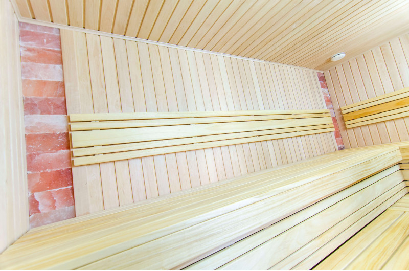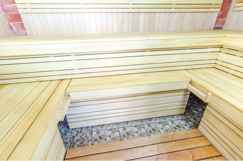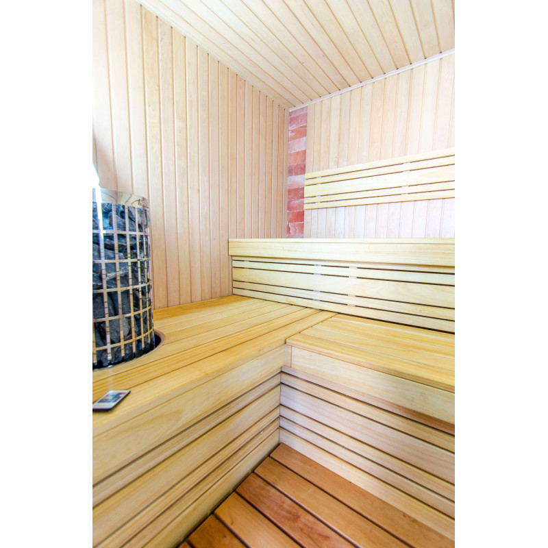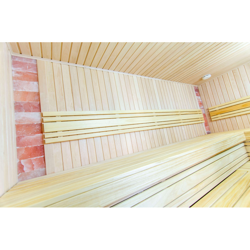 Пейки, облегалки, тавани, стени - от африканска неотопляема висок клас абачи, подови решетки - от черна елша. Облегалките и зад тухлите от хималайска сол разполагат с вградено цветно RGB осветление, управлявано от безжична конзола за промяна на цвета, която подчертава отличителния вид на хималайската сол.