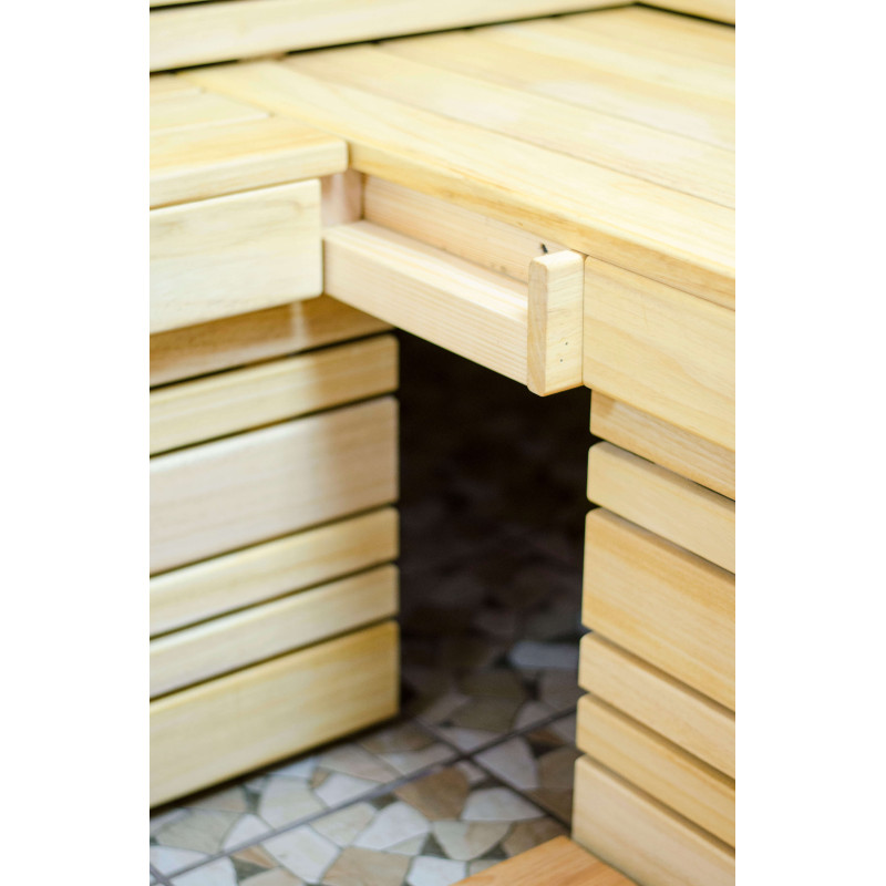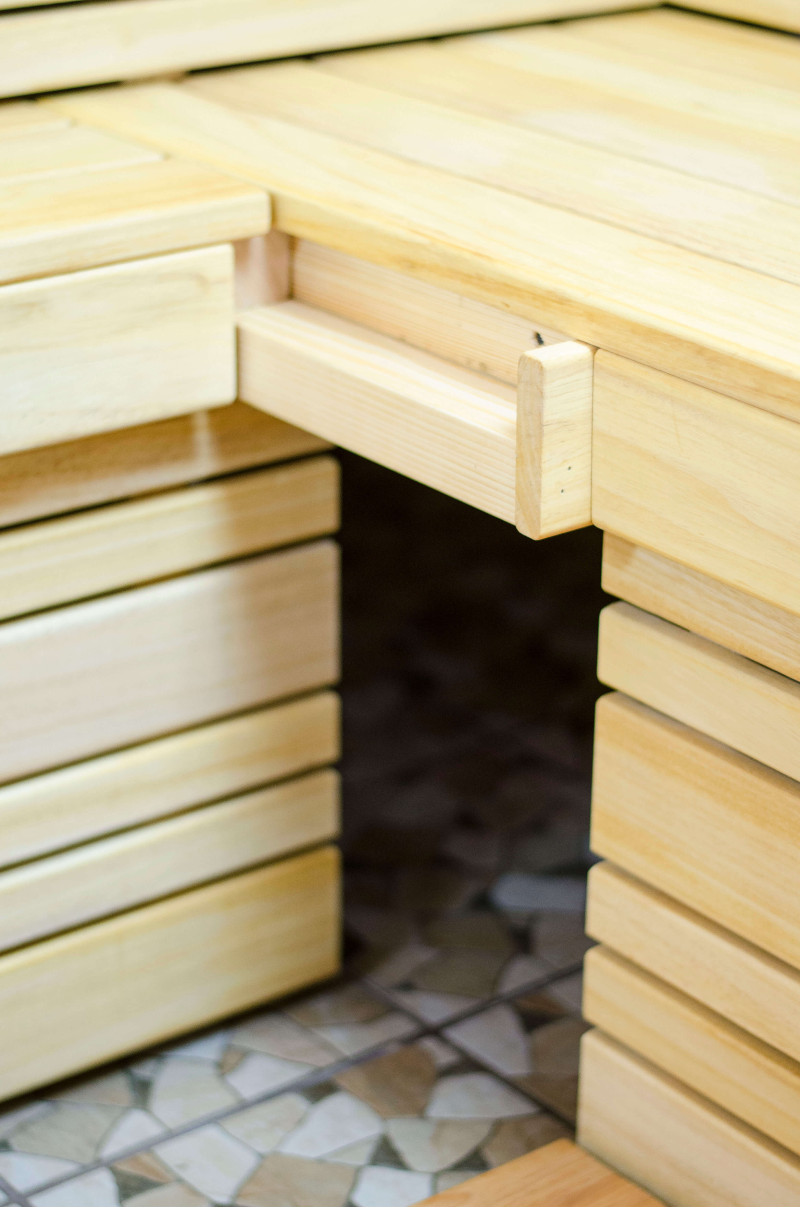 Най -голямото предимство на тази сауна е плъзгащата се долна пейка за удобно къпане. По желание на клиента, шезлонгите, които бяха достатъчно широки и с правилната височина, бяха проектирани да стоят удобно. По време на къпане шезлонгът се превръща в кът за сядане. Широкият шезлонг прави много по -удобно да се къпете, тъй като е възможно краката ви да стигнат там, където е по -топло.