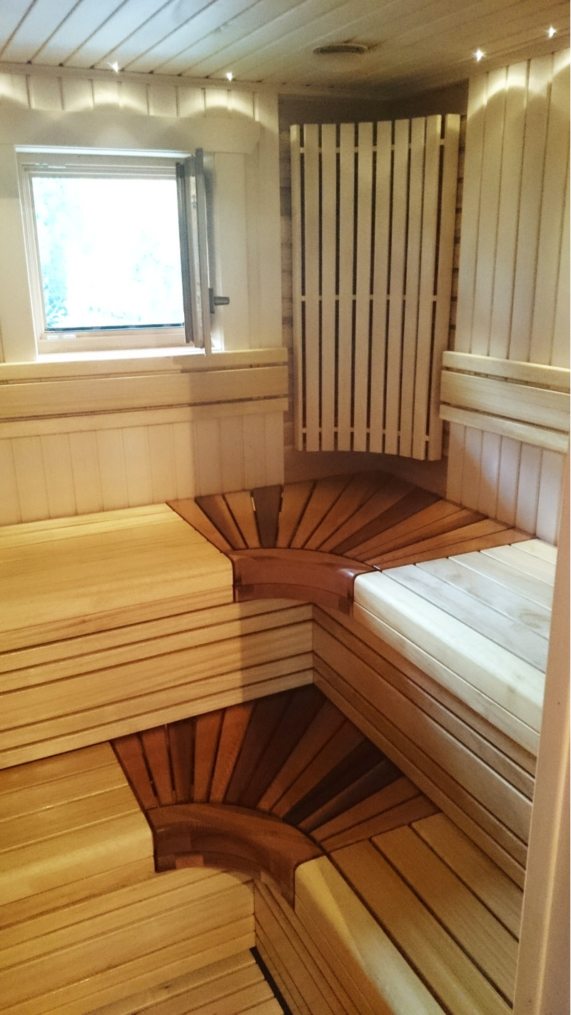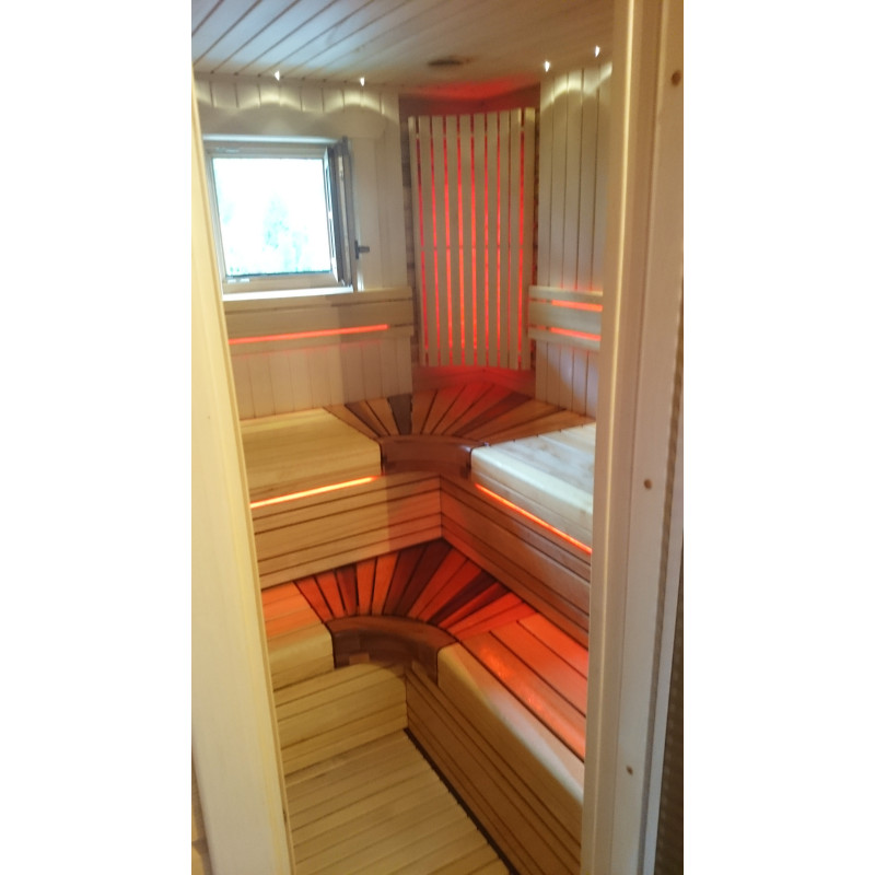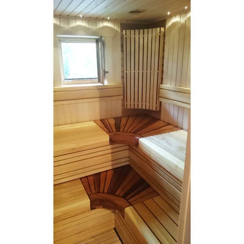 Интериорът на сауната е изработен от най-високо качество липа и кедър, пейките са от абахи и кедър. Това дърво е най-подходящо за пейки, тъй като загрява малко, безопасно и приятно е да се докосва до такова дърво.