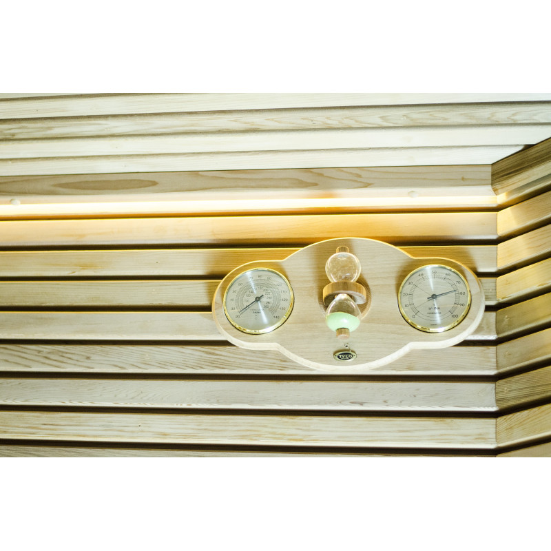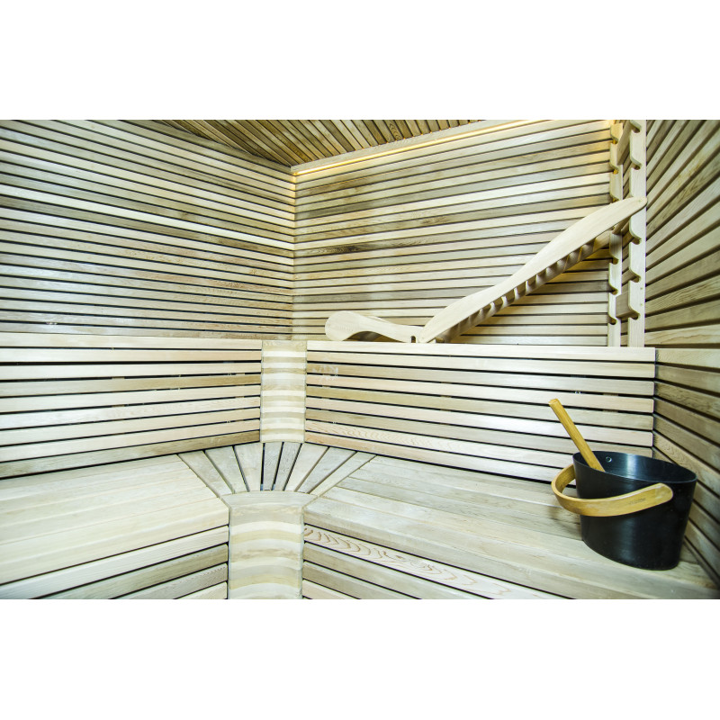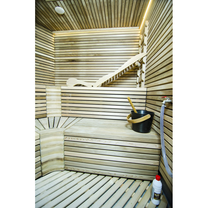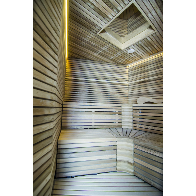 Осветление - топла бяла LED лента. Таванът е снабден с полиран лист от неръждаема стомана, който е оборудван с осветителна система "Звездно небе". Това е идеално решение за осветление за вашата сауна или друга тъмна стая.