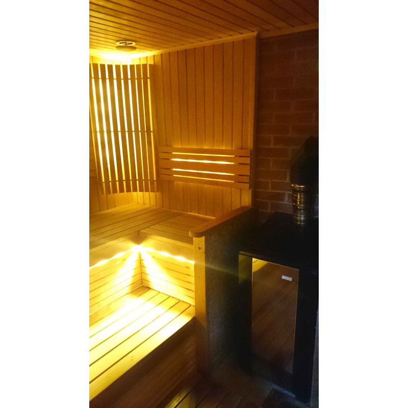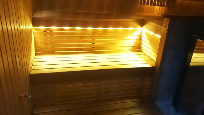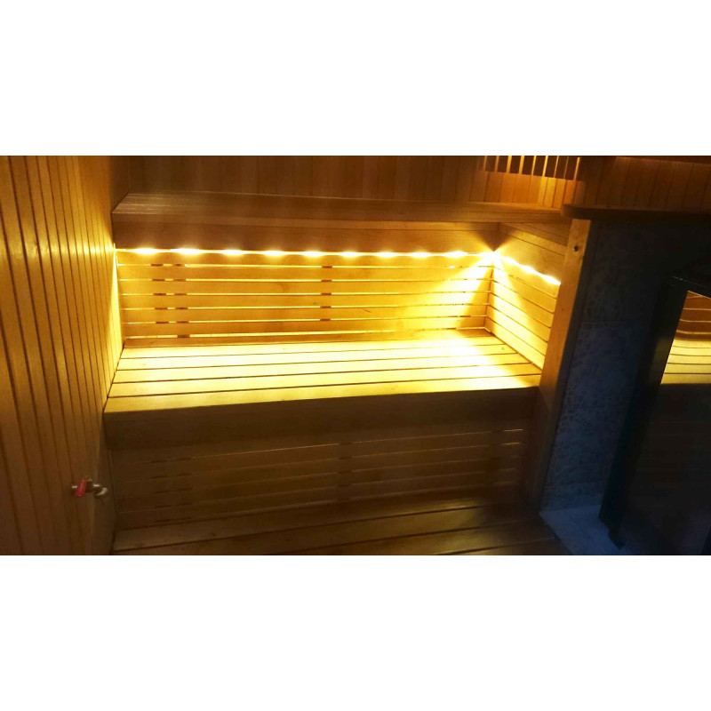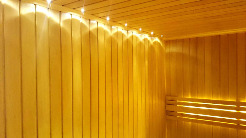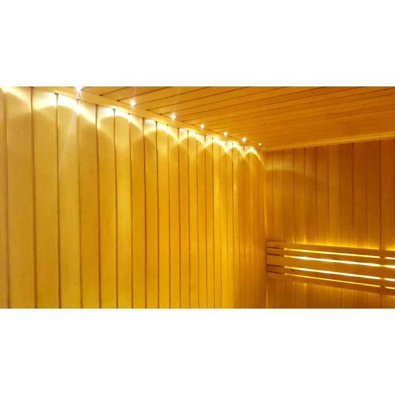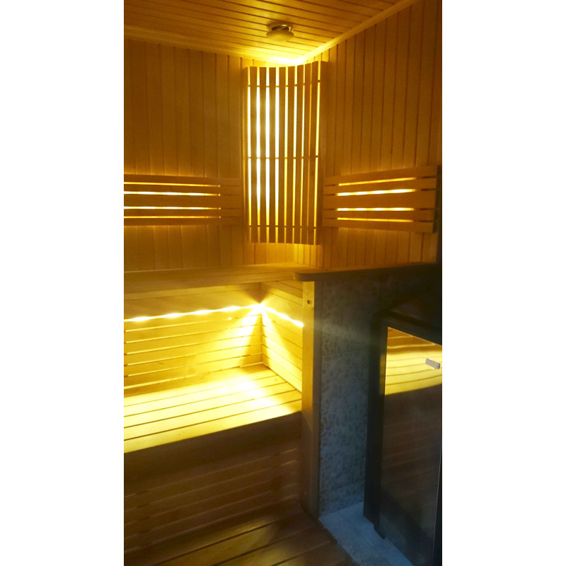 Осветлението на сауната е много важен елемент, защото именно осветлението осигурява част от релаксиращия ефект на сауната. Тази сауна е оборудвана с LED светлини на тавана, под шезлонгите и облегалките. Осветителните тела са устойчиви на влага и високи температури.