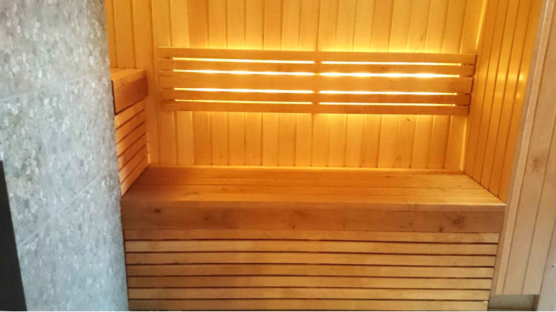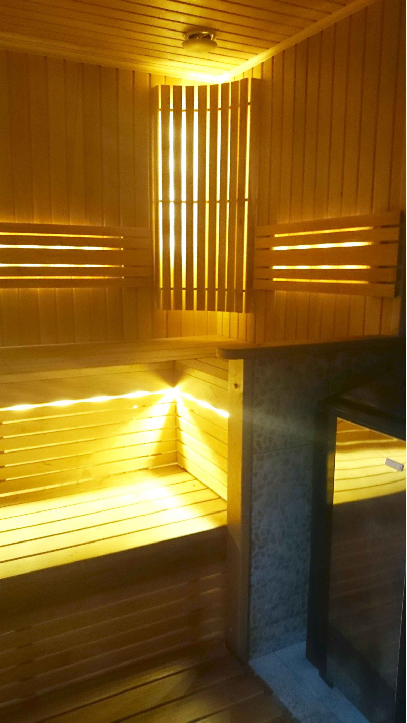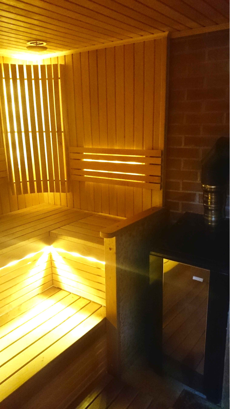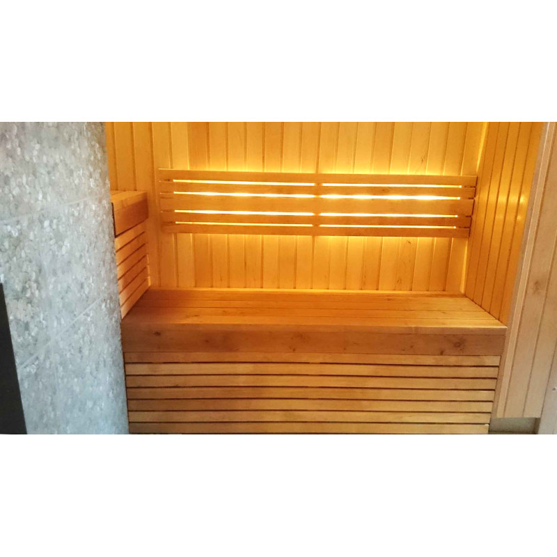 Осветлението на сауната е много важен елемент, защото именно осветлението осигурява част от релаксиращия ефект на сауната. Тази сауна е оборудвана с LED светлини на тавана, под шезлонгите и облегалките. Осветителните тела са устойчиви на влага и високи температури.