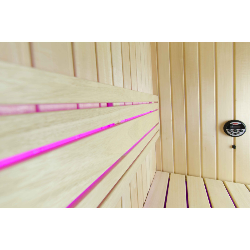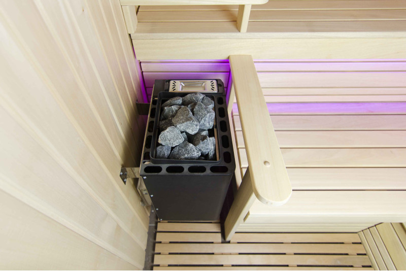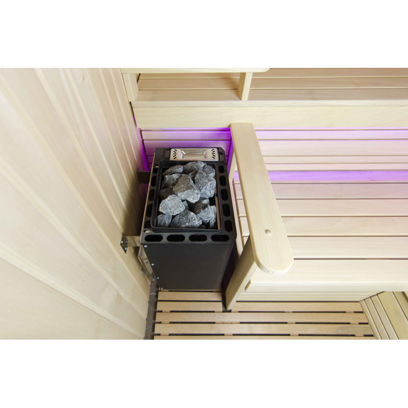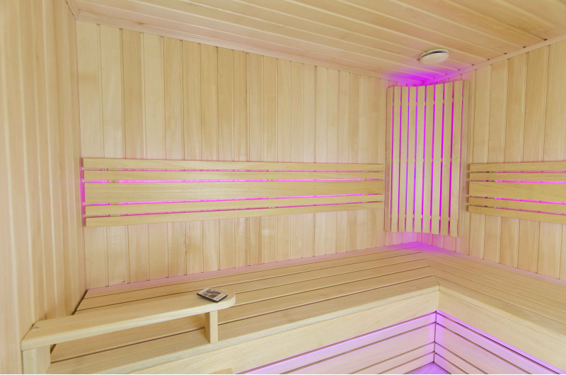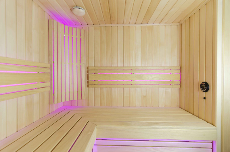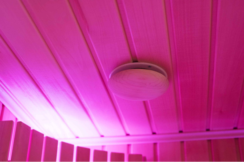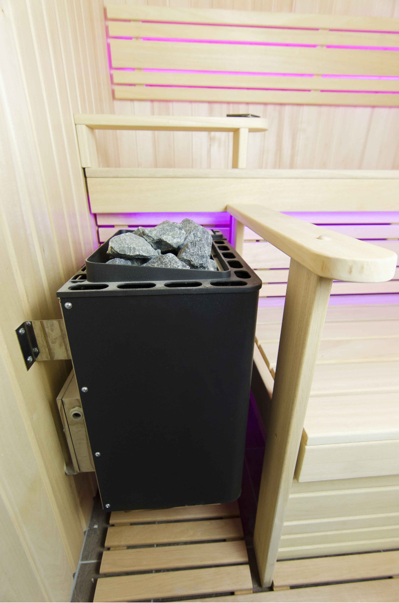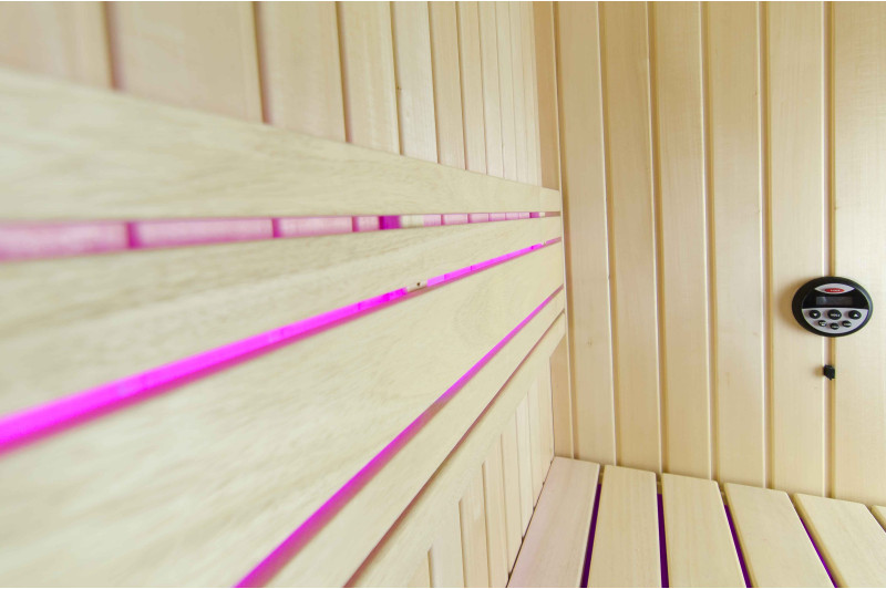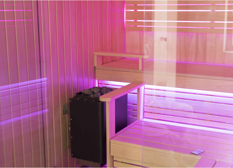 Интериорът на сауната е направен от най-висококачественото дърво от липа, шезлонгите са от дърво абачи - неотопляемо и идеално за сауната.