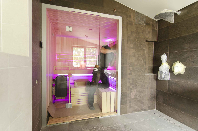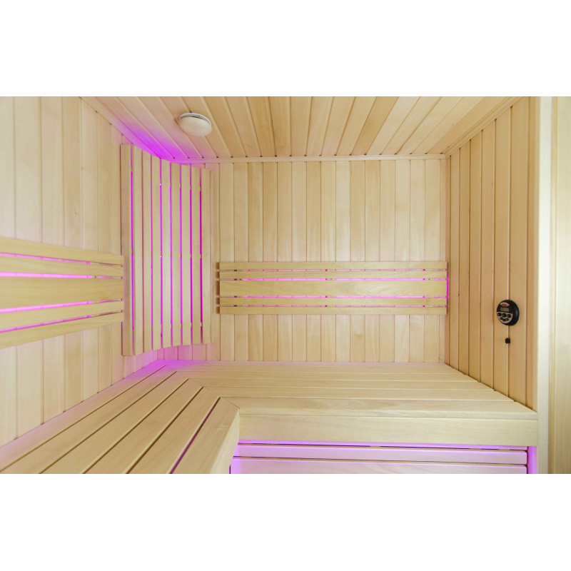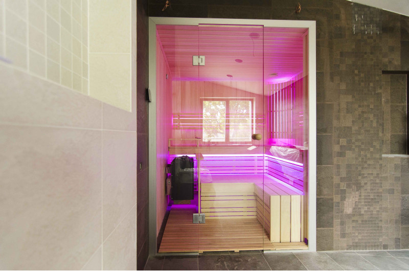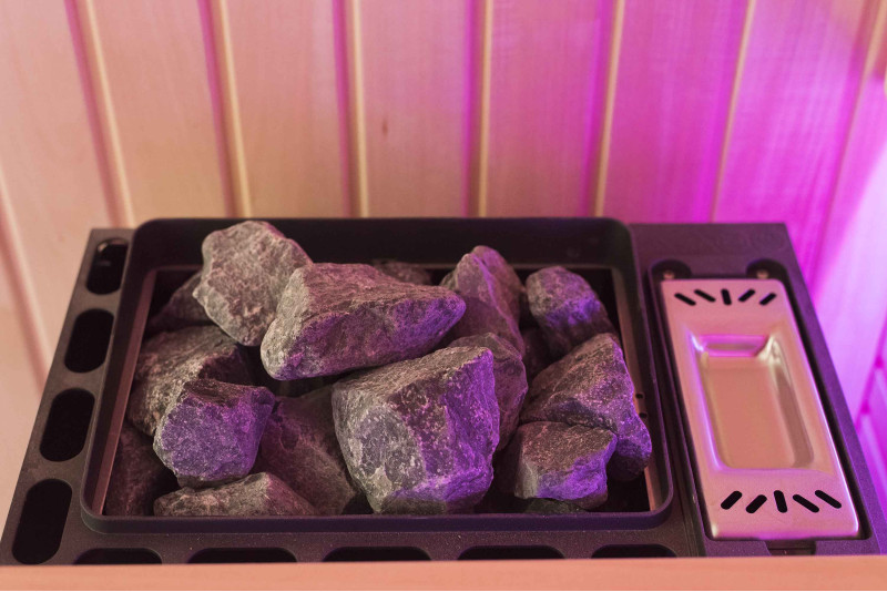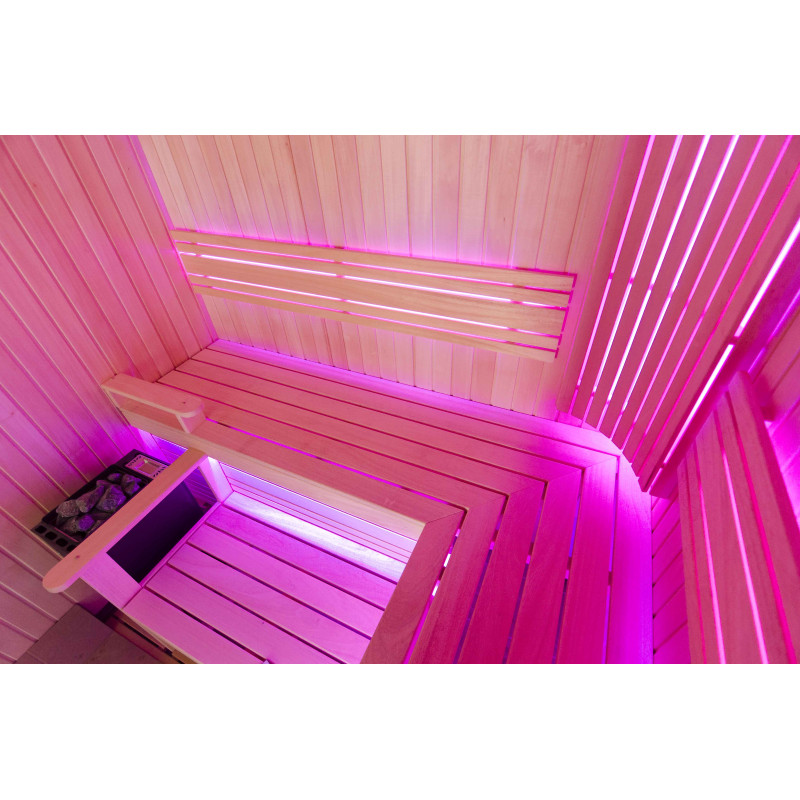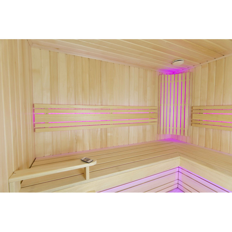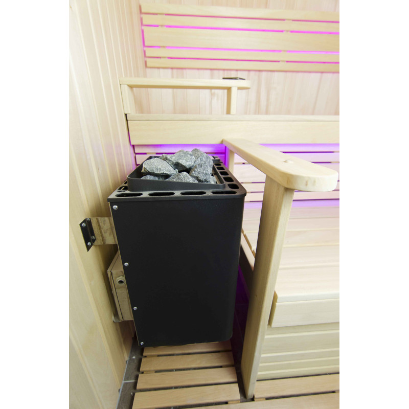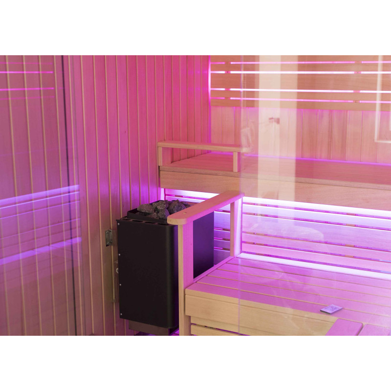 Интериорът на сауната е направен от най-висококачественото дърво от липа, шезлонгите са от дърво абачи - неотопляемо и идеално за сауната.