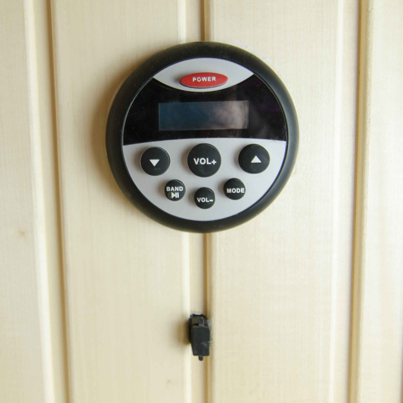 Модерен проект за сауна за частно ползване е реализиран в Мелнрадж. В пространството на банята имаше кът за удоволствията на семейна сауна. Големите прозорци на витрината на сауната се отварят към гледката към природата през прозореца на банята, осигурявайки постоянен източник на светлина и увеличавайки оптически пространството на не особено голямата стая за сауна. В допълнение към страхотната гледка, удоволствието от сауната се подобрява от вграденото в звука музикално оборудване. Мултимедийният плейър е специално пригоден за използване в гореща, влажна сауна. Има USB връзка, Bluetooth, радио, LCD екран, гумени бутони за управление. Високоговорителите също са устойчиви на влага в сауната, корозия и температура.