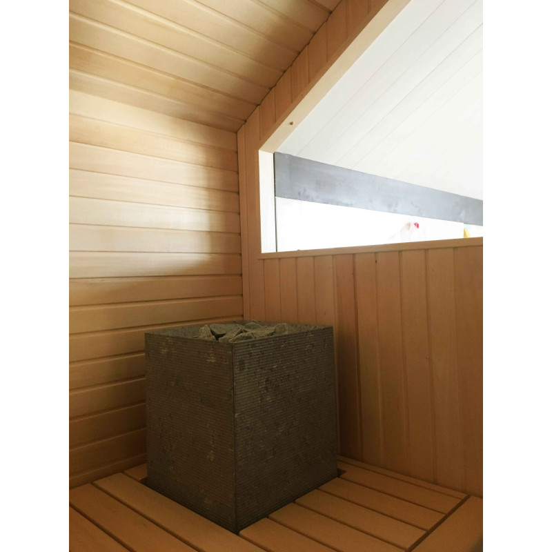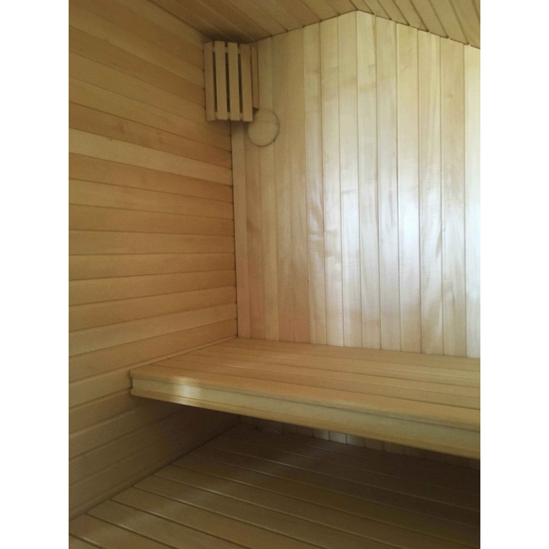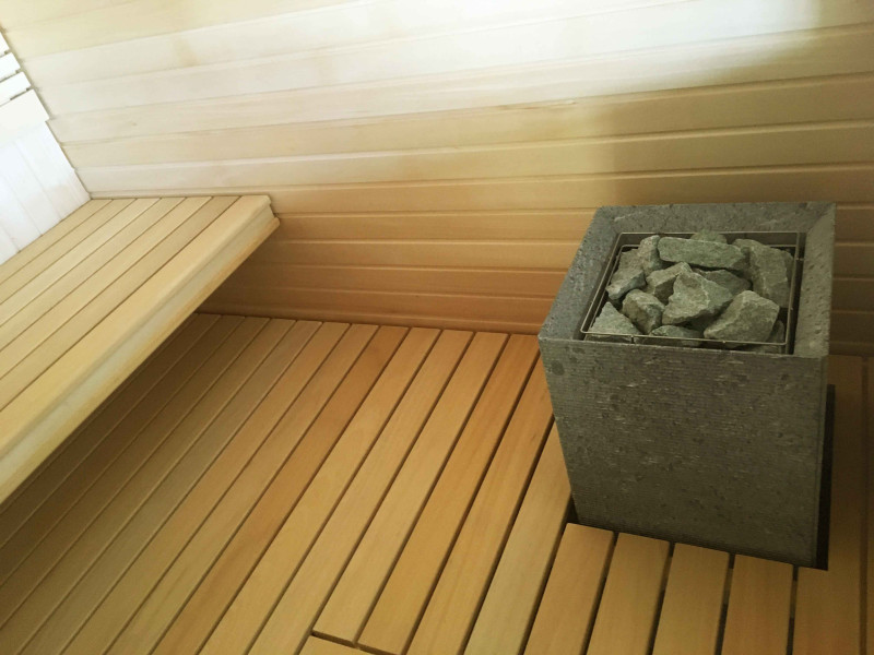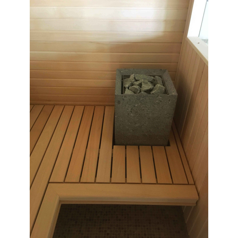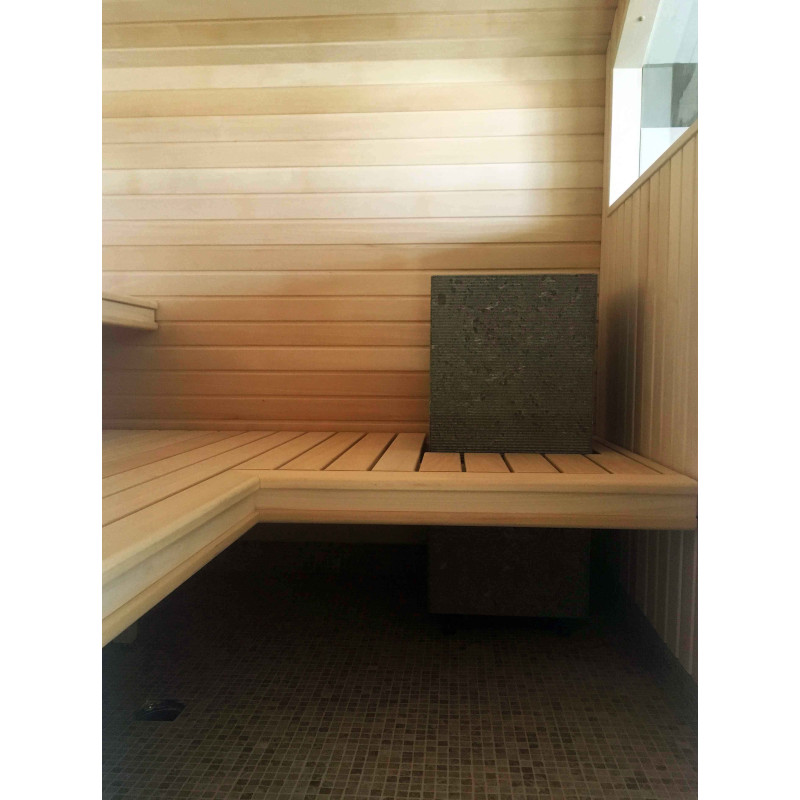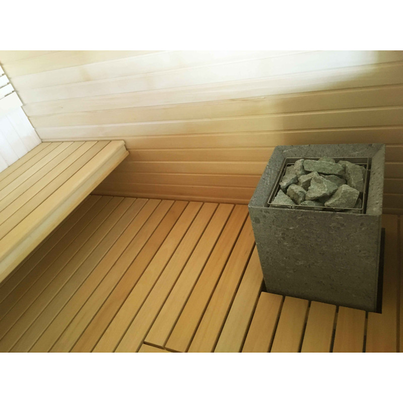 Стените и таваните на сауната са от липа. Сайдингът от липа дава на сауната повече светлина и излъчва приятна миризма на дърво. За пейките, облегалките и оградата около нагревателя е избрана висококачествена дървена ламперия абачи. Това меко и неотопляемо дърво е чудесен избор за пейки, опори, където дървото докосва кожата, без да я изгори. Това гарантира комфорт и страхотна почивка в сауната. Пейките, подпорите и стените са лакирани, напълно подготвени за дълготрайна употреба.