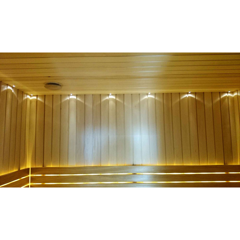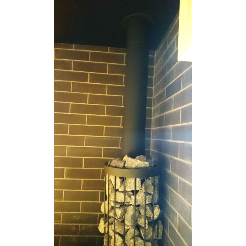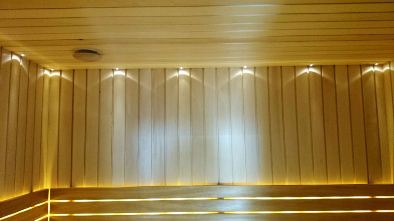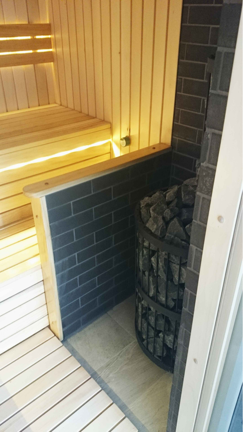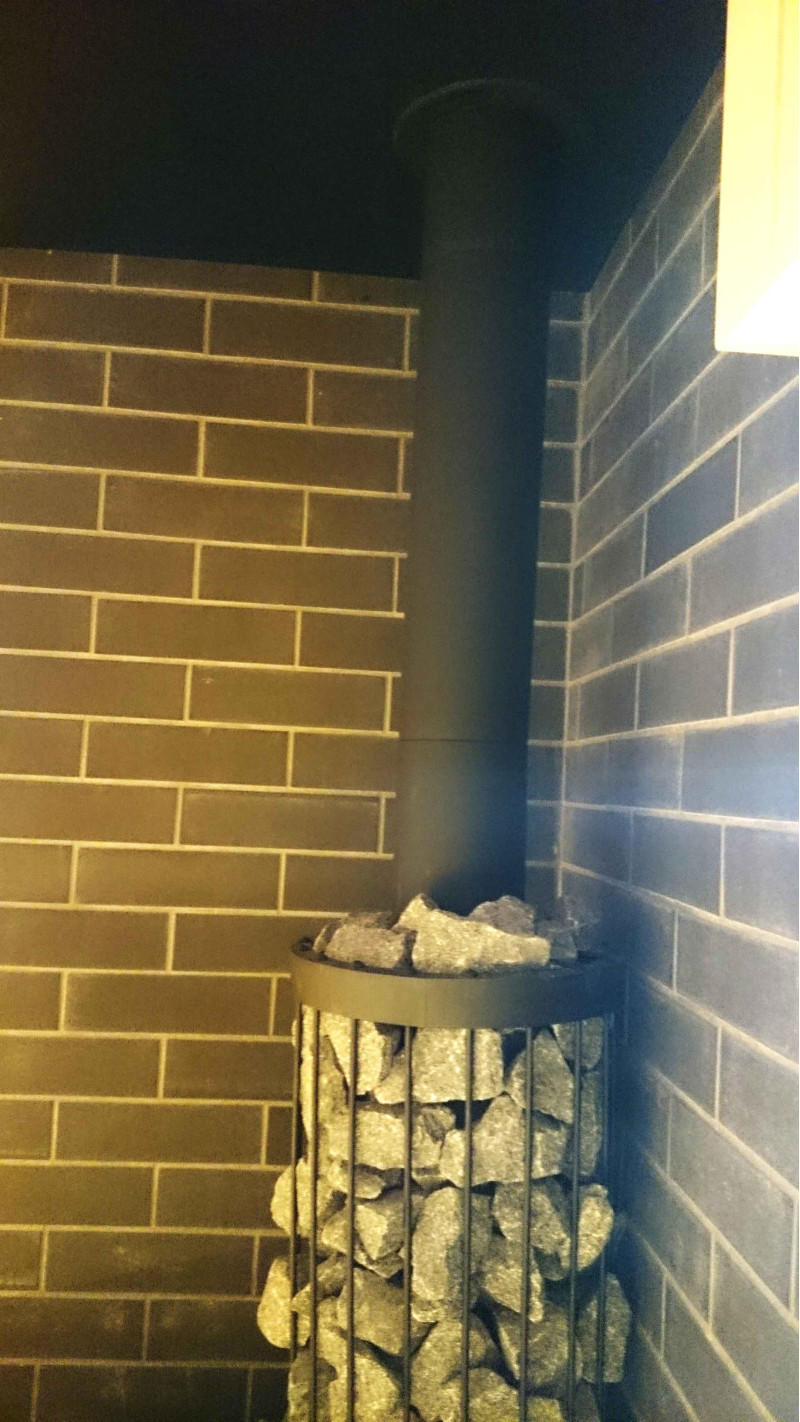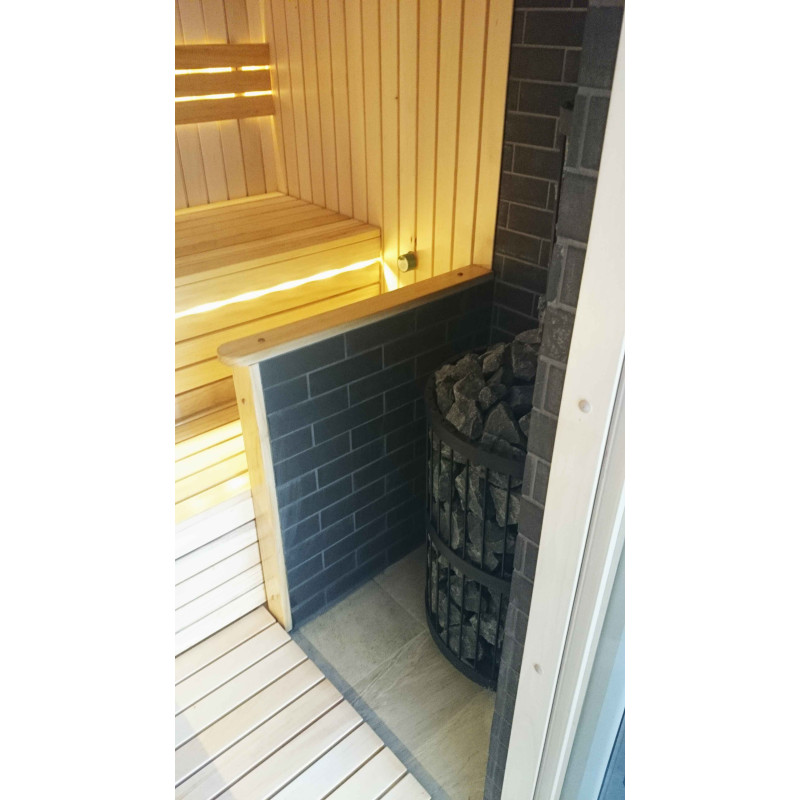 Този проект за сауна със защитна стена за нагревателя. Стената е изработена от топлоустойчива плоча Minerit, върху метална рамка.