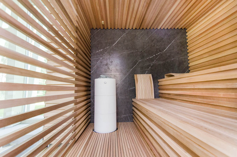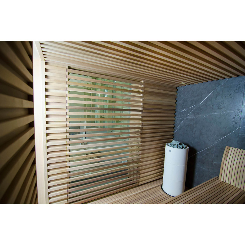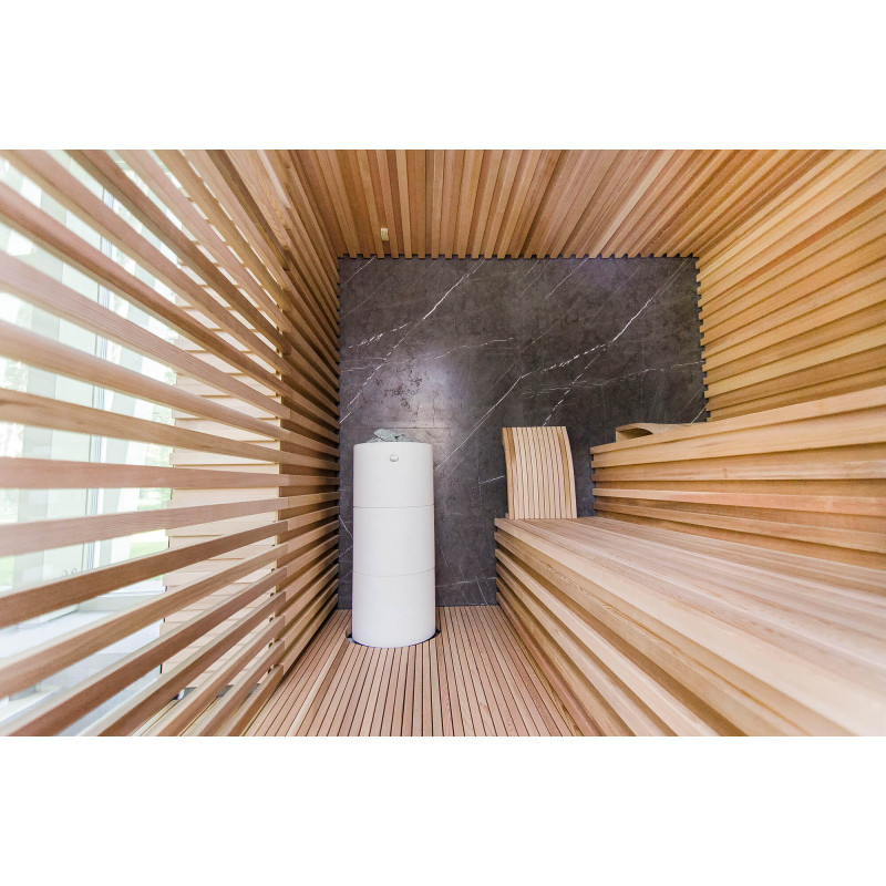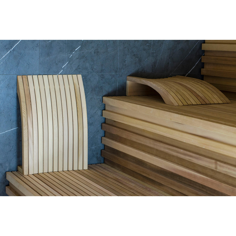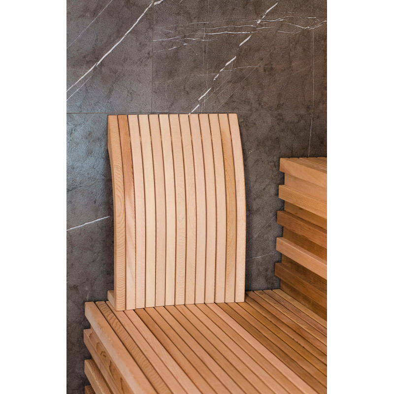 Стените и пейките на сауната са изработени от най-висококачествена кедрова дървесина, изработени по индивидуален профил. Облегалки-възглавници - ръчно изработено кедрово дърво. Това дърво е с високо качество, не се нагрява, така че е безопасно и приятно на допир, докато се наслаждавате на сауната.
