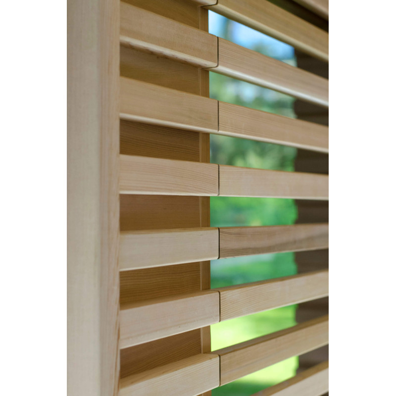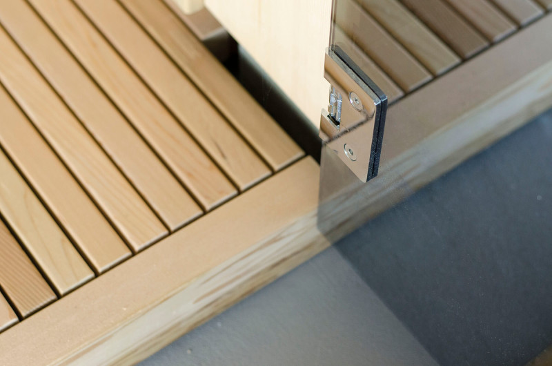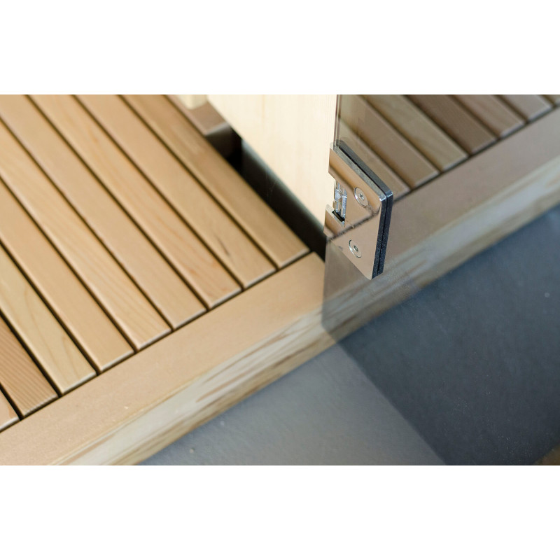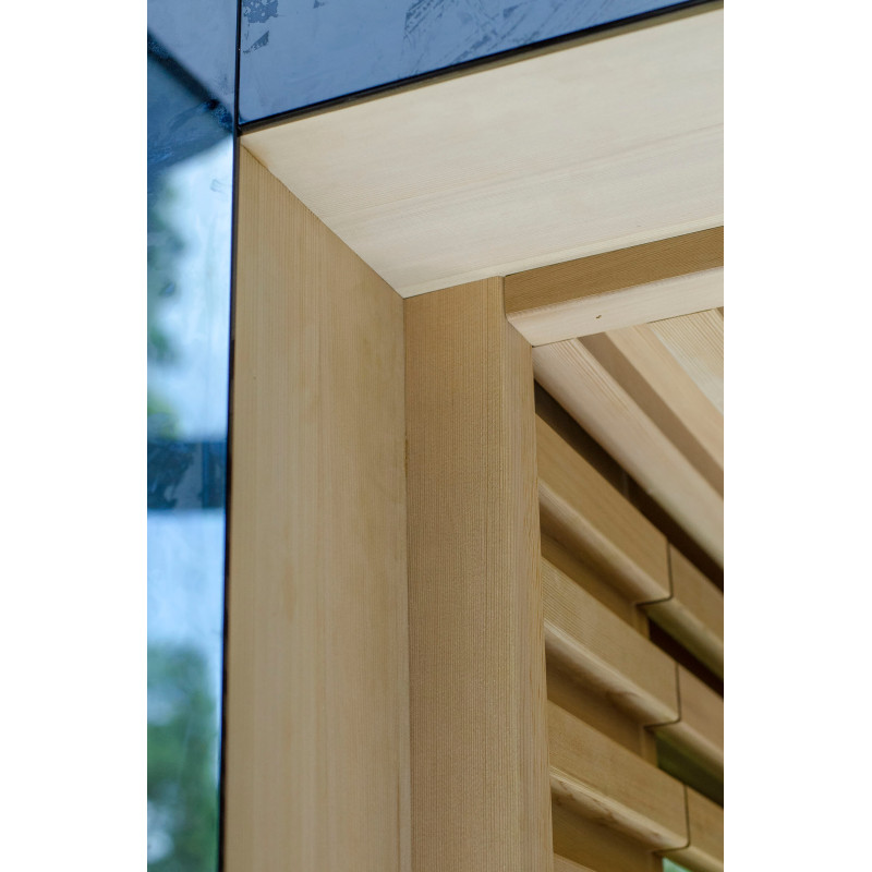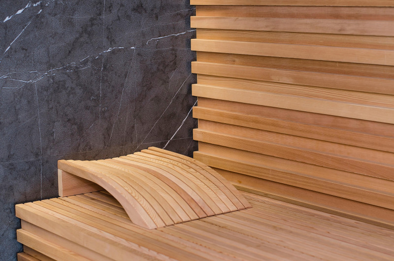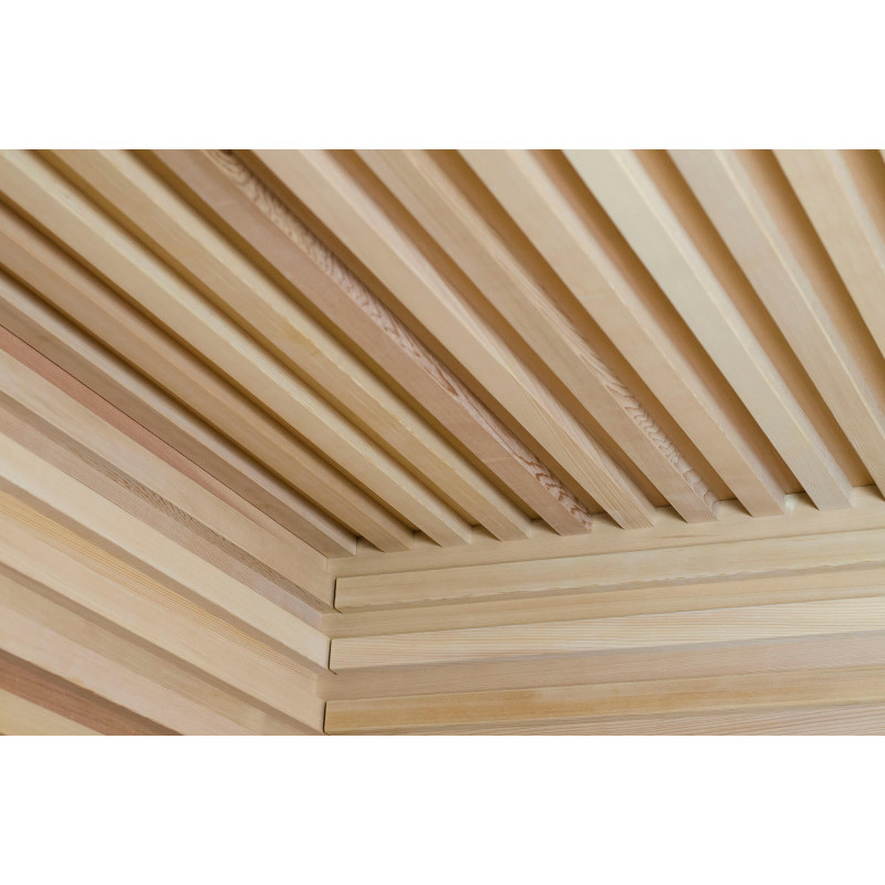 Стените и пейките на сауната са изработени от най-висококачествена кедрова дървесина, изработени по индивидуален профил. Облегалки-възглавници - ръчно изработено кедрово дърво. Това дърво е с високо качество, не се нагрява, така че е безопасно и приятно на допир, докато се наслаждавате на сауната.