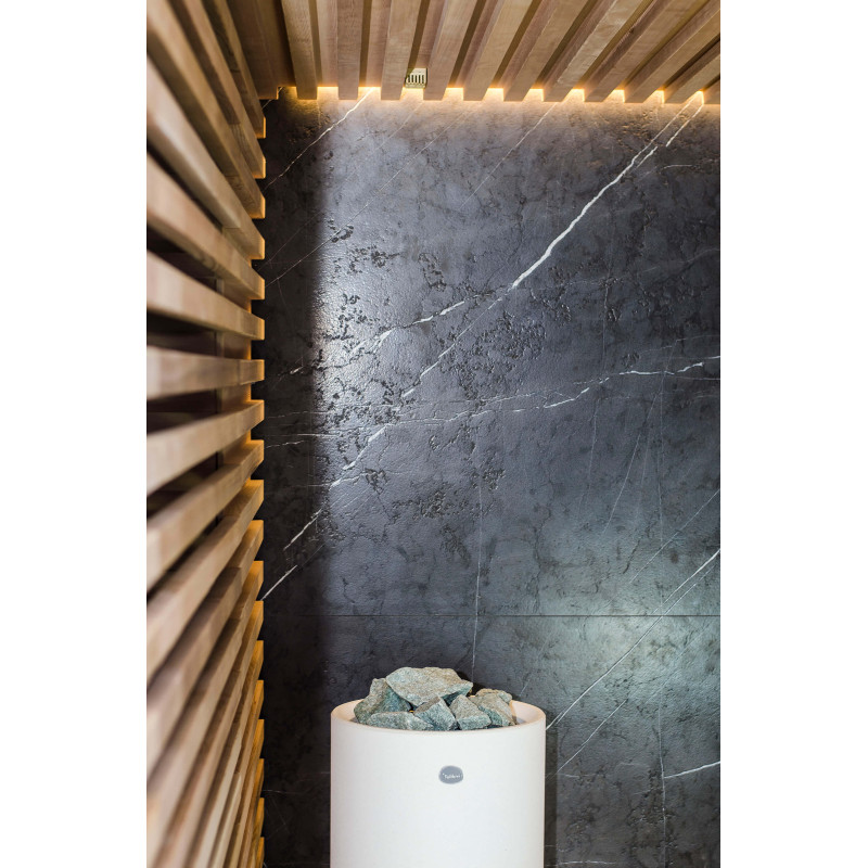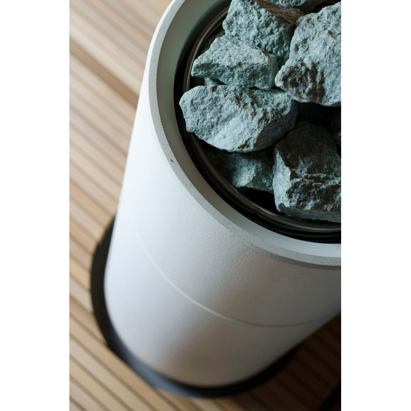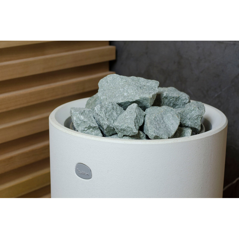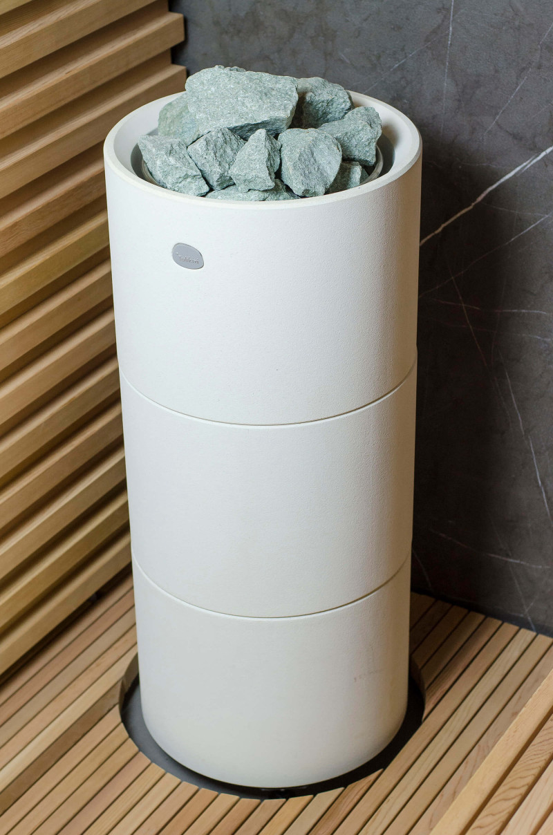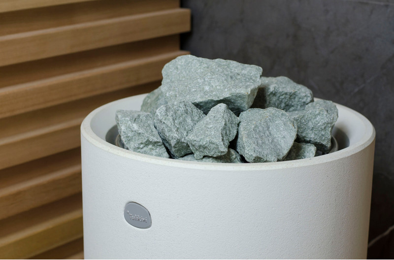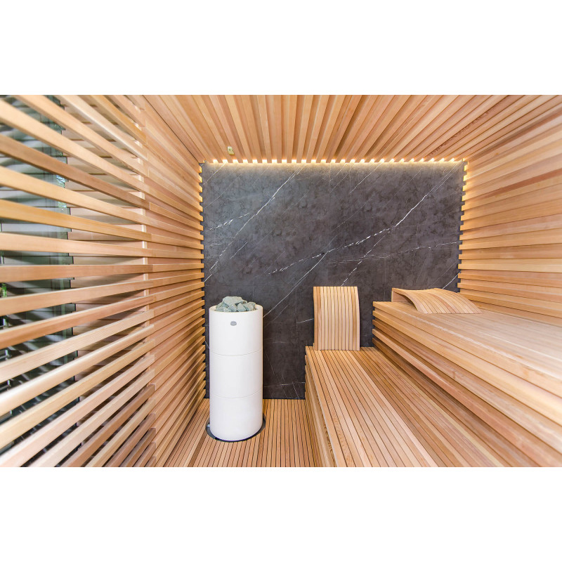 Източникът на топлина е нагревателя Tulikivi Kuura White, пълен с жадеитни камъни. Когато камъните от жадеит се нагряват, лечебните му свойства се засилват. Обливането на камъните с вода в сауната разпространява приятна миризма на чиста среда, което улеснява дишането. В нагревателя е въведена парна тръба от парогенератора на парната сауна, което позволява да се постигне много по-висока влажност в сауната. Това е чудесен избор, ако нямате условия да инсталирате парна баня и сауна. Една обща система за управление е голям стационарен LED монитор. Цялото оборудване също се управлява от смарт устройство от всяка точка на света.