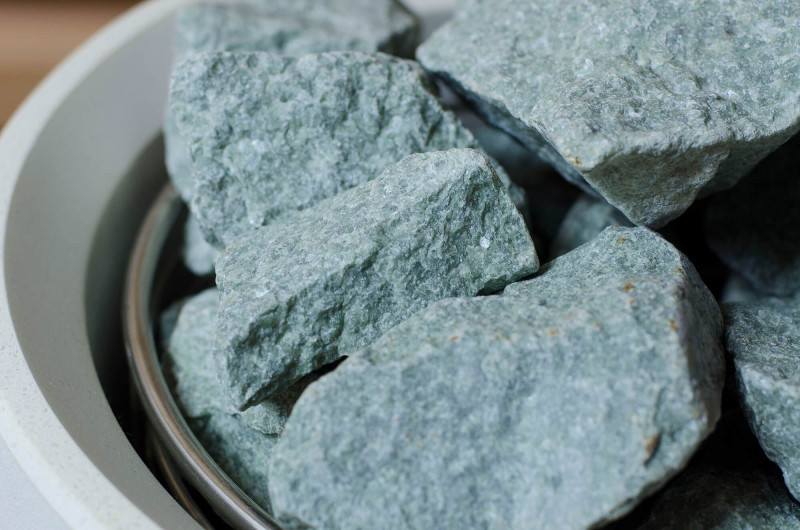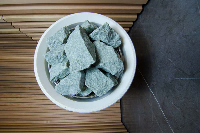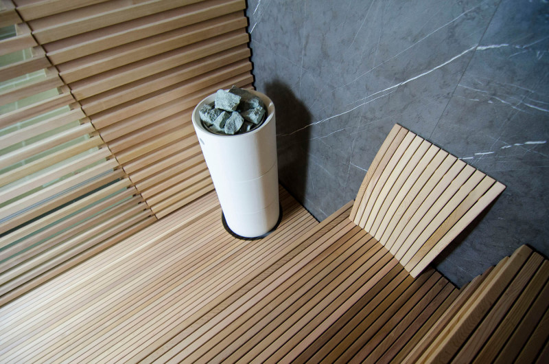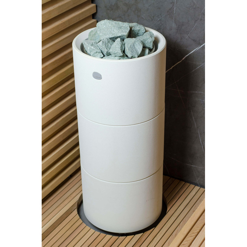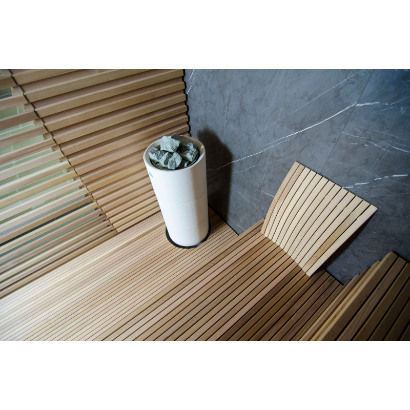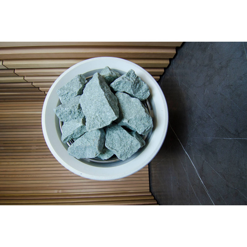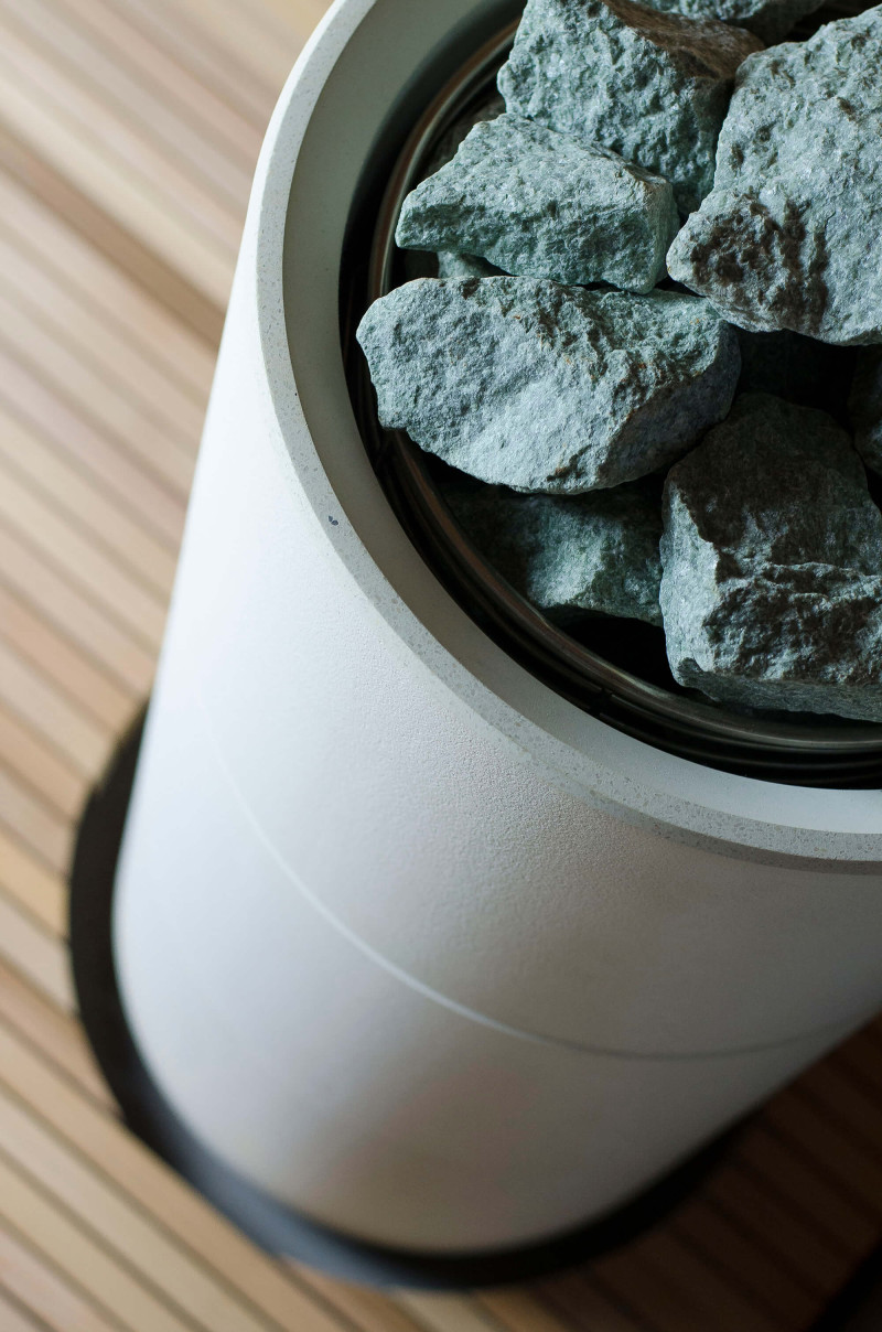 Източникът на топлина е нагревателя Tulikivi Kuura White, пълен с жадеитни камъни. Когато камъните от жадеит се нагряват, лечебните му свойства се засилват. Обливането на камъните с вода в сауната разпространява приятна миризма на чиста среда, което улеснява дишането. В нагревателя е въведена парна тръба от парогенератора на парната сауна, което позволява да се постигне много по-висока влажност в сауната. Това е чудесен избор, ако нямате условия да инсталирате парна баня и сауна. Една обща система за управление е голям стационарен LED монитор. Цялото оборудване също се управлява от смарт устройство от всяка точка на света.