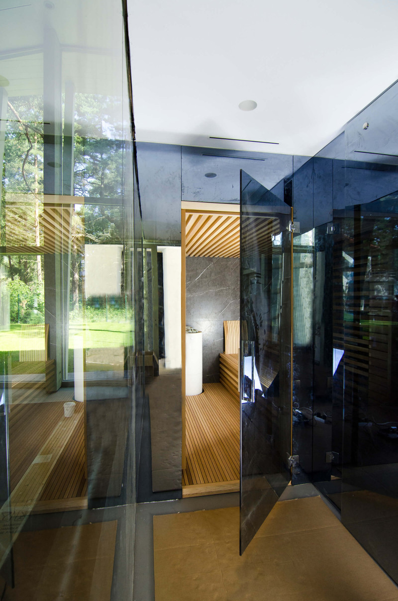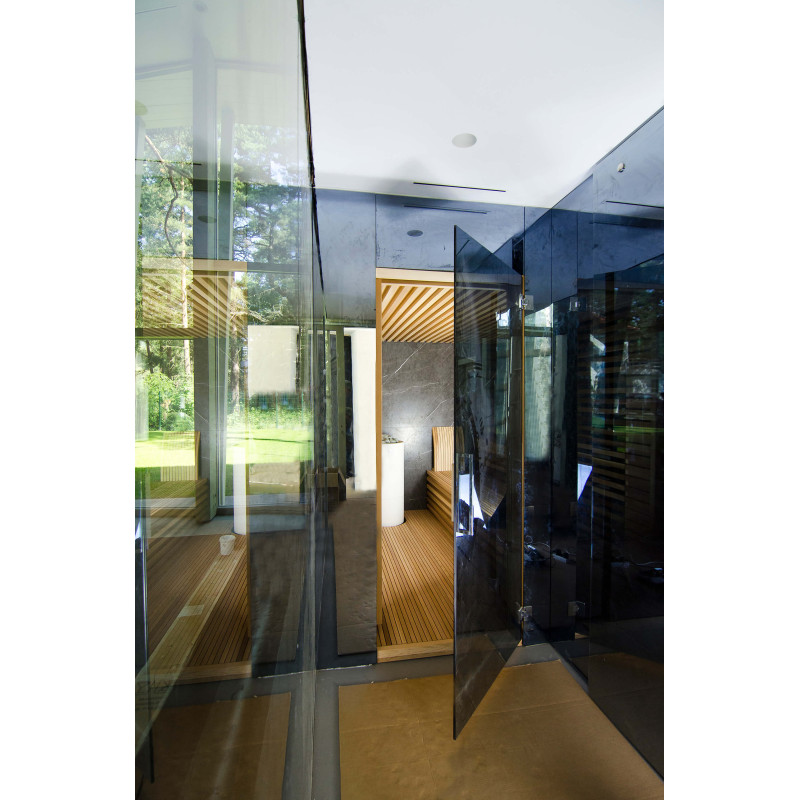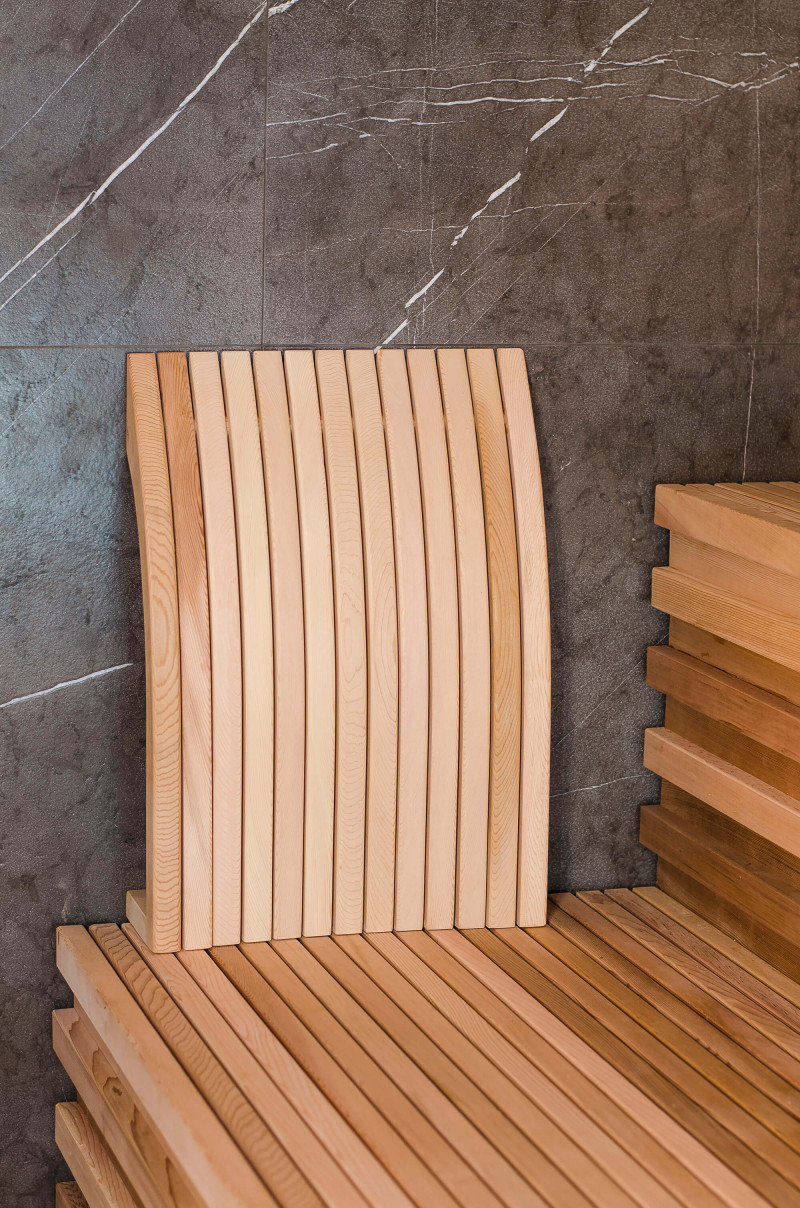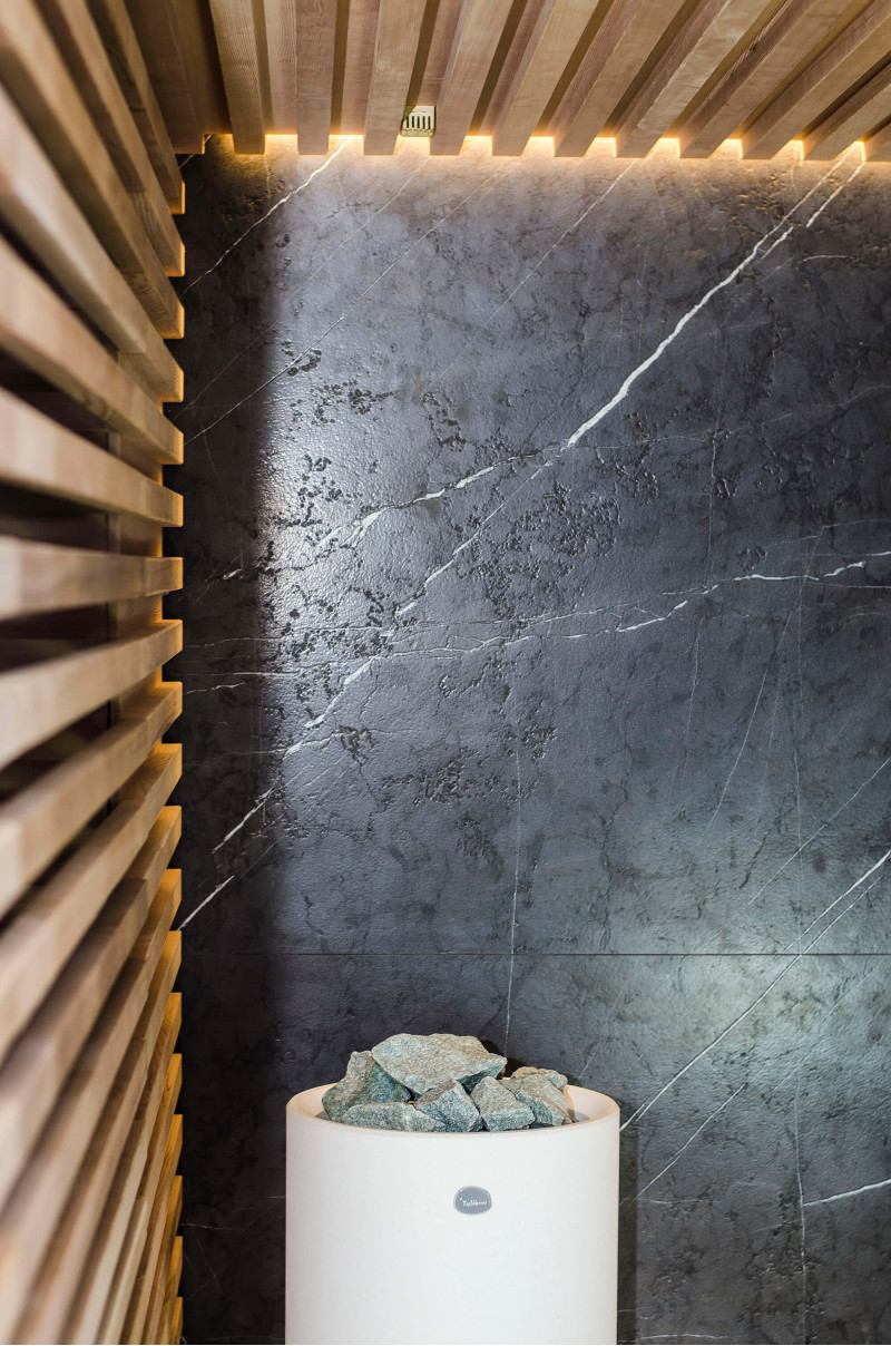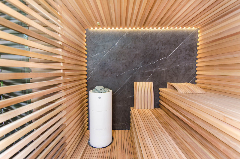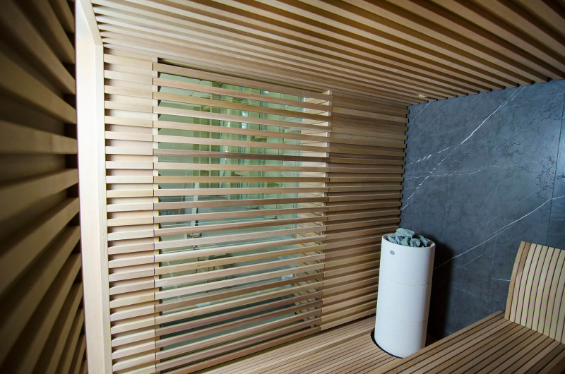 Декорацията на задната стена на сауната е с изключителен дизайн италиански мрамор, чиято красота се подчертава от LED осветлението, монтирано около нея. Украсата на страничната стена на сауната е стъклена витрина, която е покрита с подвижна ажурна решетка. Сауната е с изглед към СПА зоната, голям басейн. Осветлението на стените и тавана на сауната е с топла бяла херметична LED лента. Стъклени врати без рамки.
