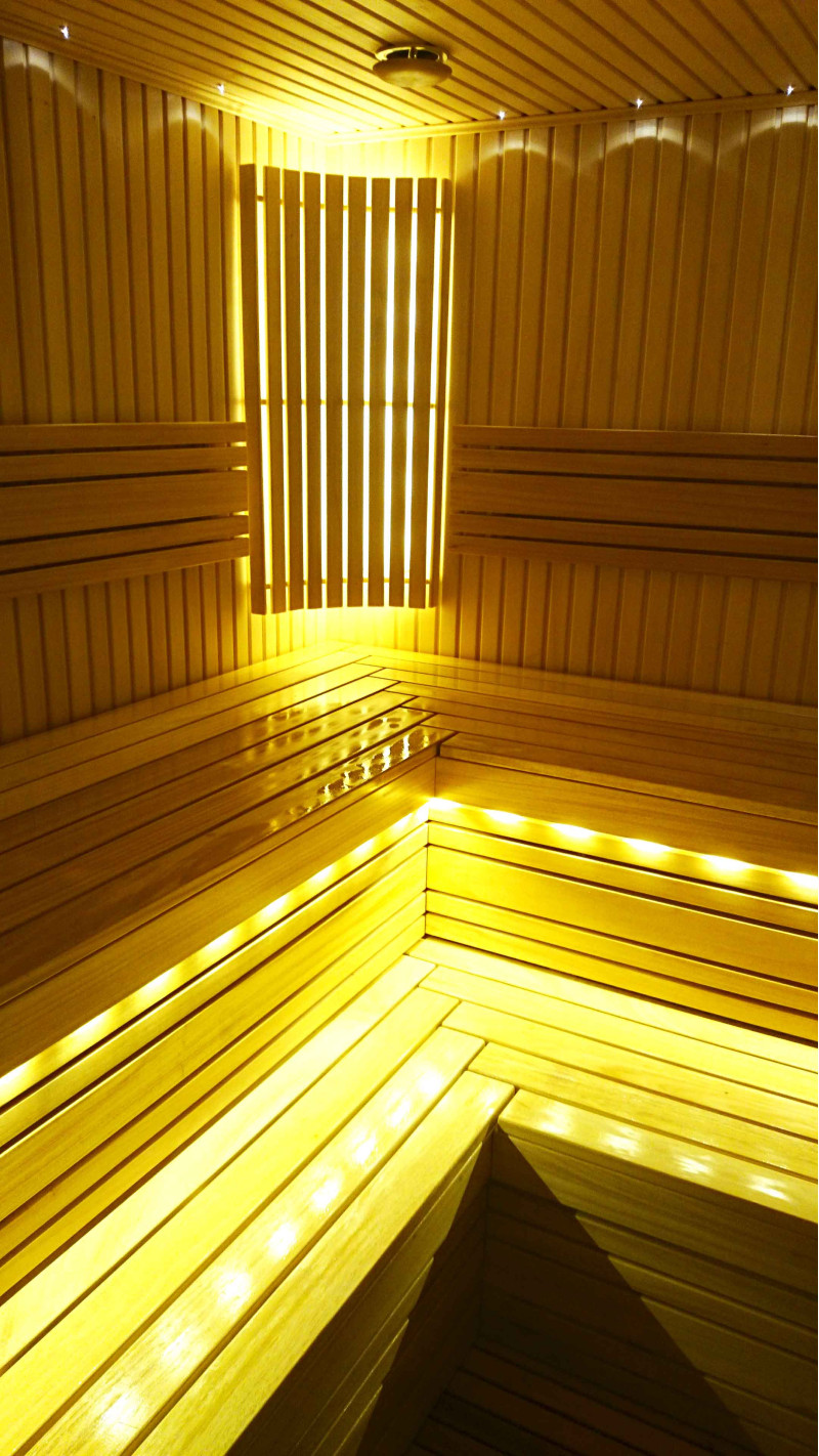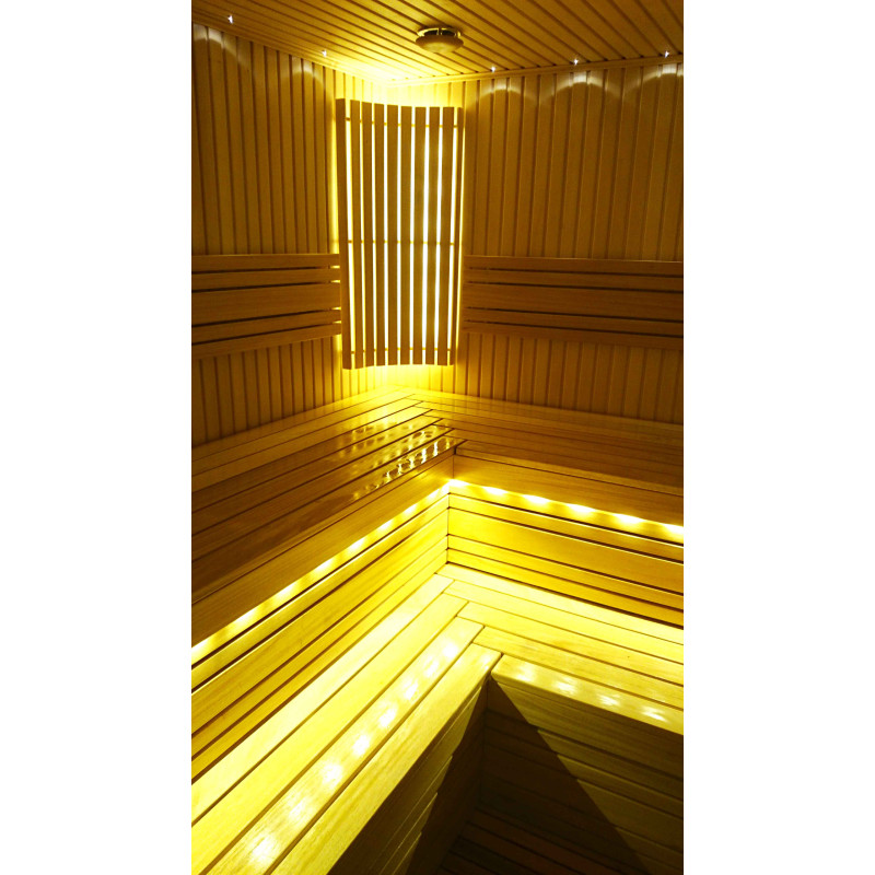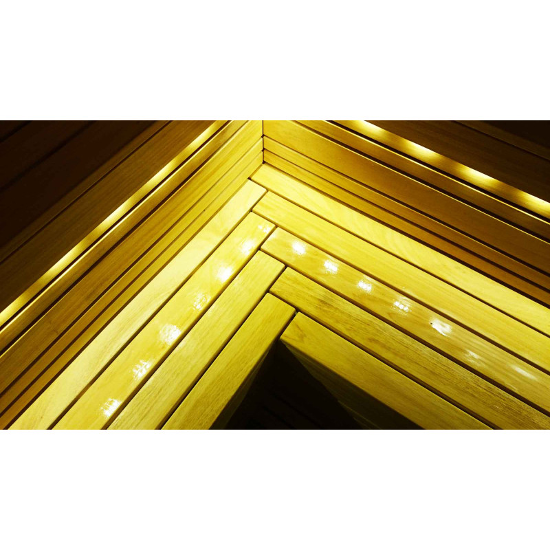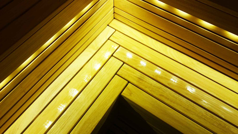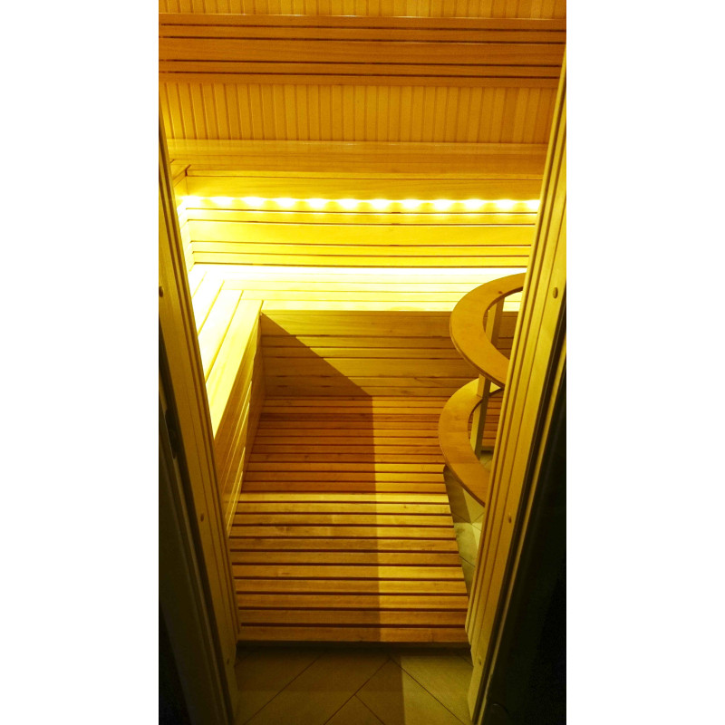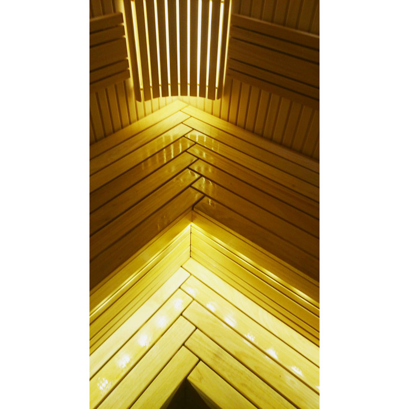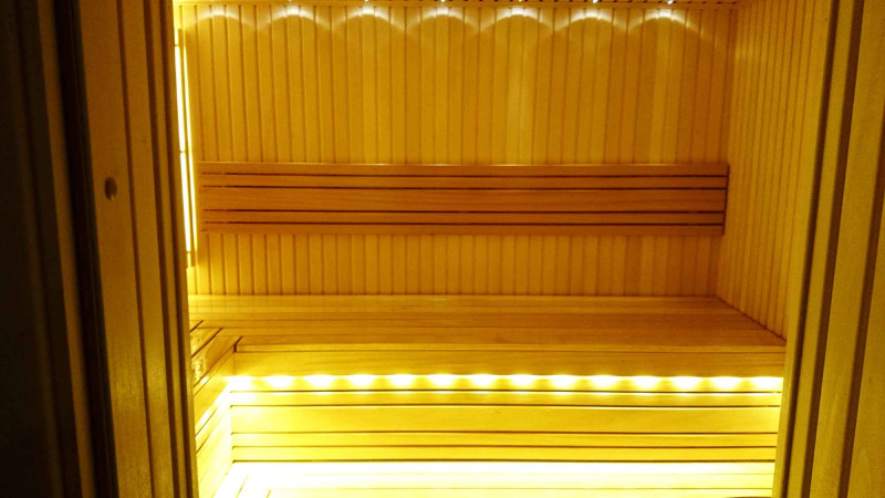 Основен акцент на сауната е модерно и ярко LED лентово осветление под пейките, лампа под ъгловата облегалка и отделни LED лампи, осветяващи тавана.