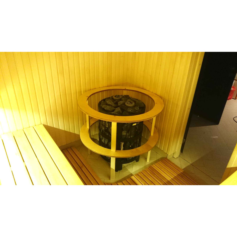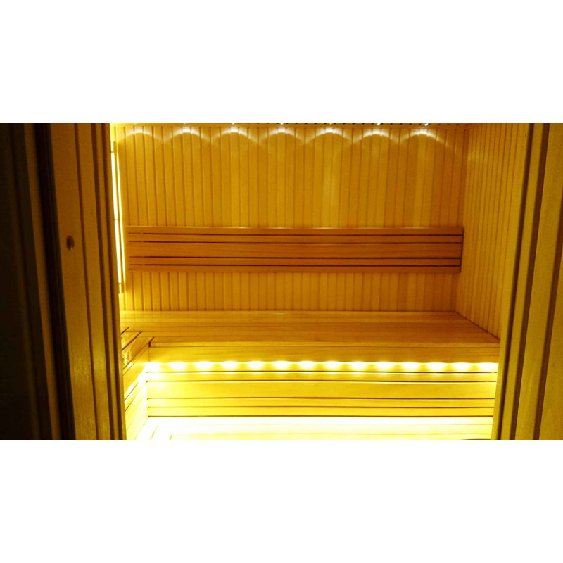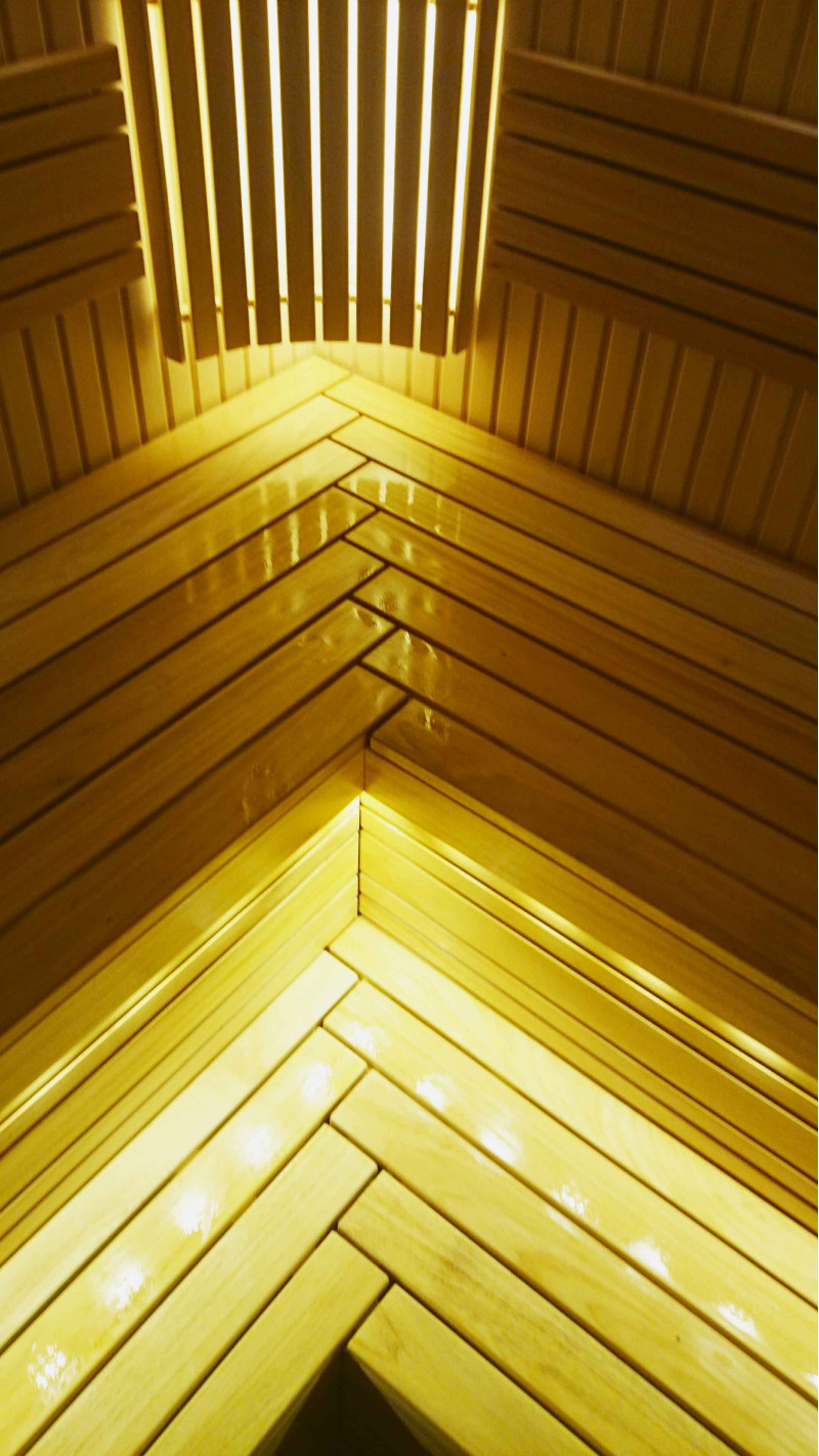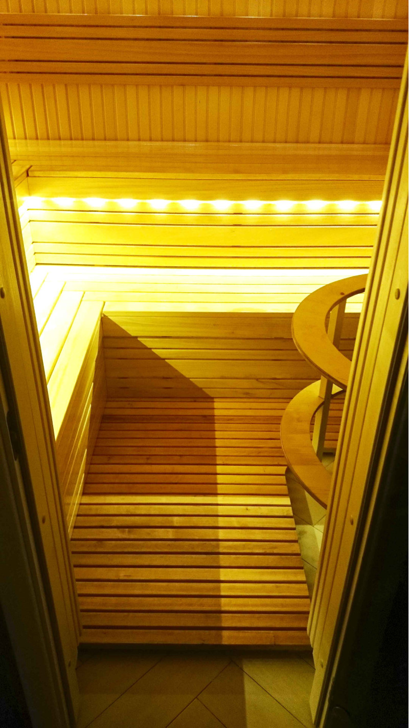 Основен акцент на сауната е модерно и ярко LED лентово осветление под пейките, лампа под ъгловата облегалка и отделни LED лампи, осветяващи тавана.