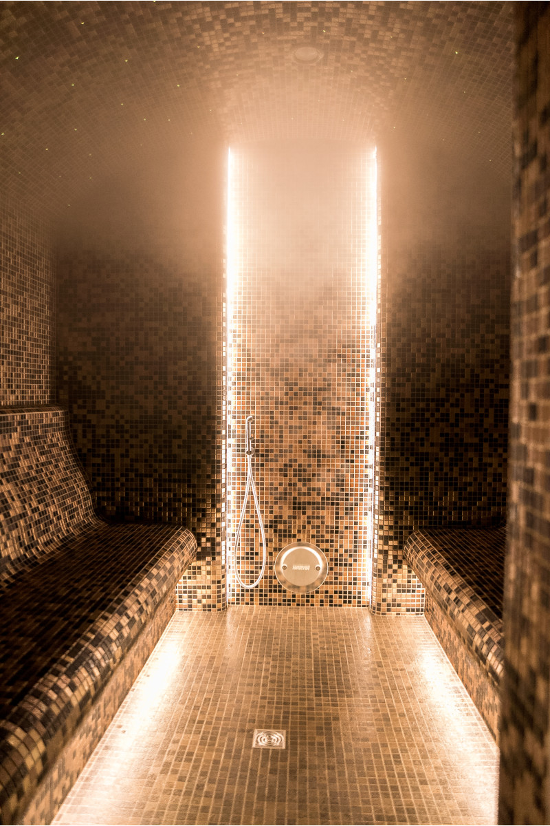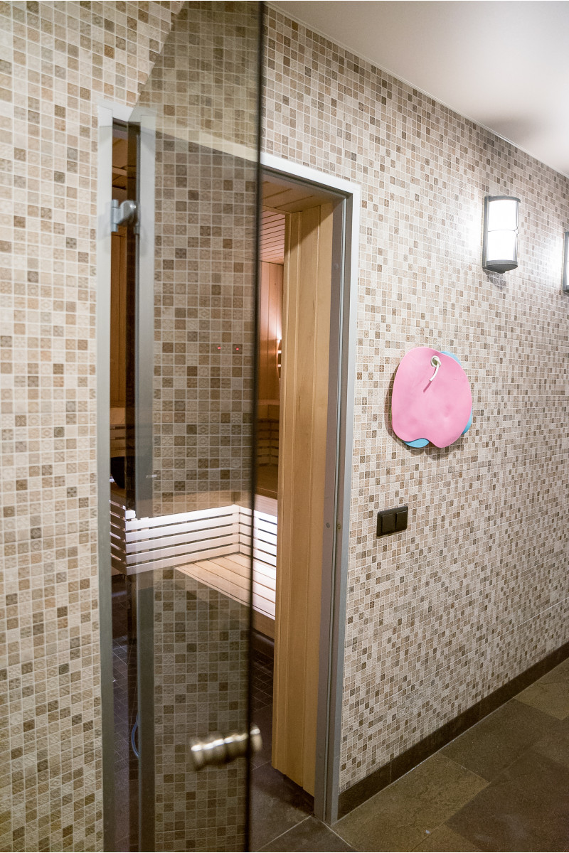 Пейки изработени по индивидуален проект, профил с облегалки. Таванът е сводеста форма, характерна за всички парни сауни.