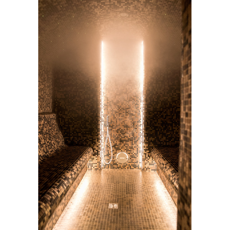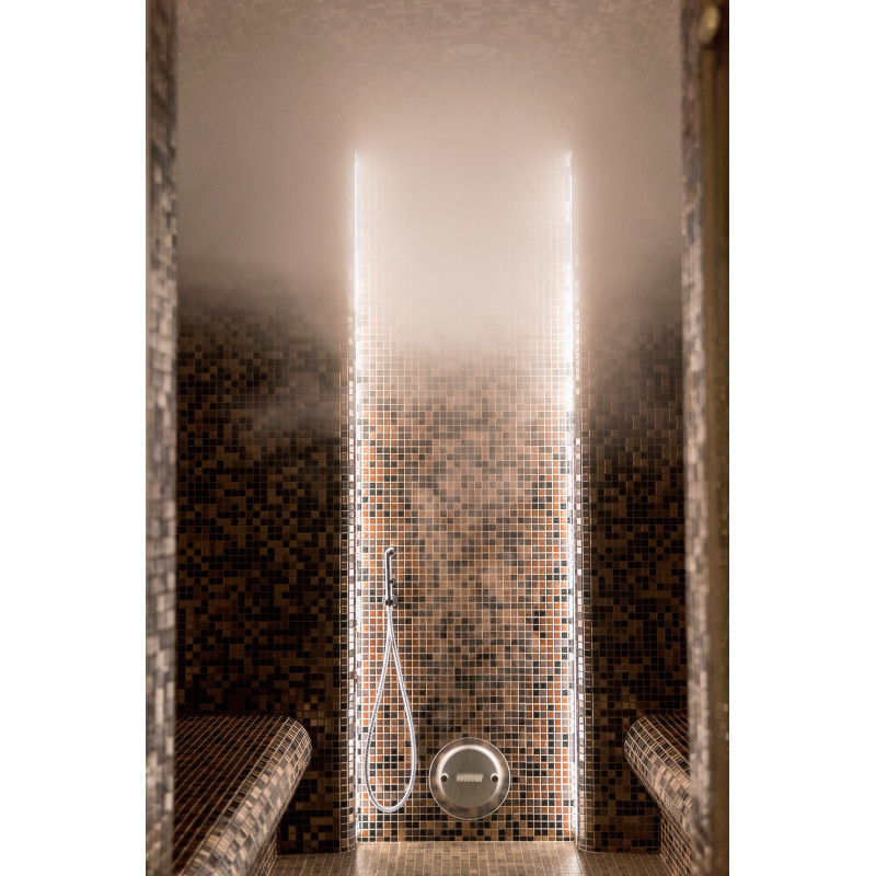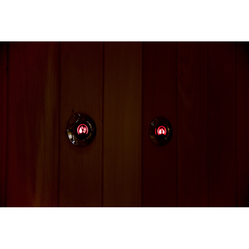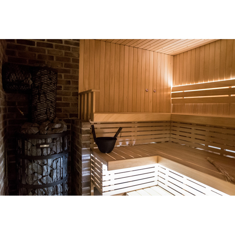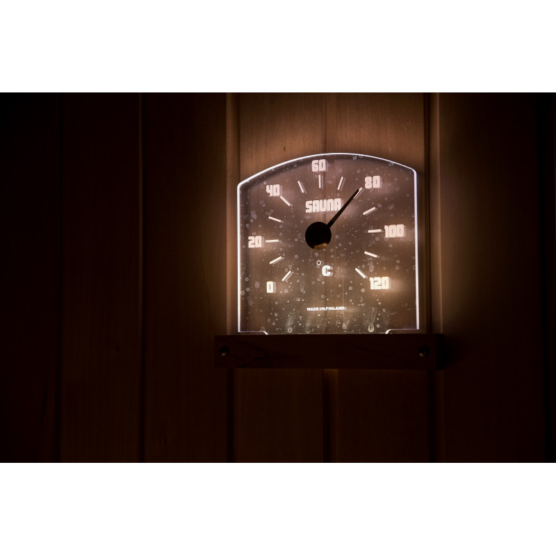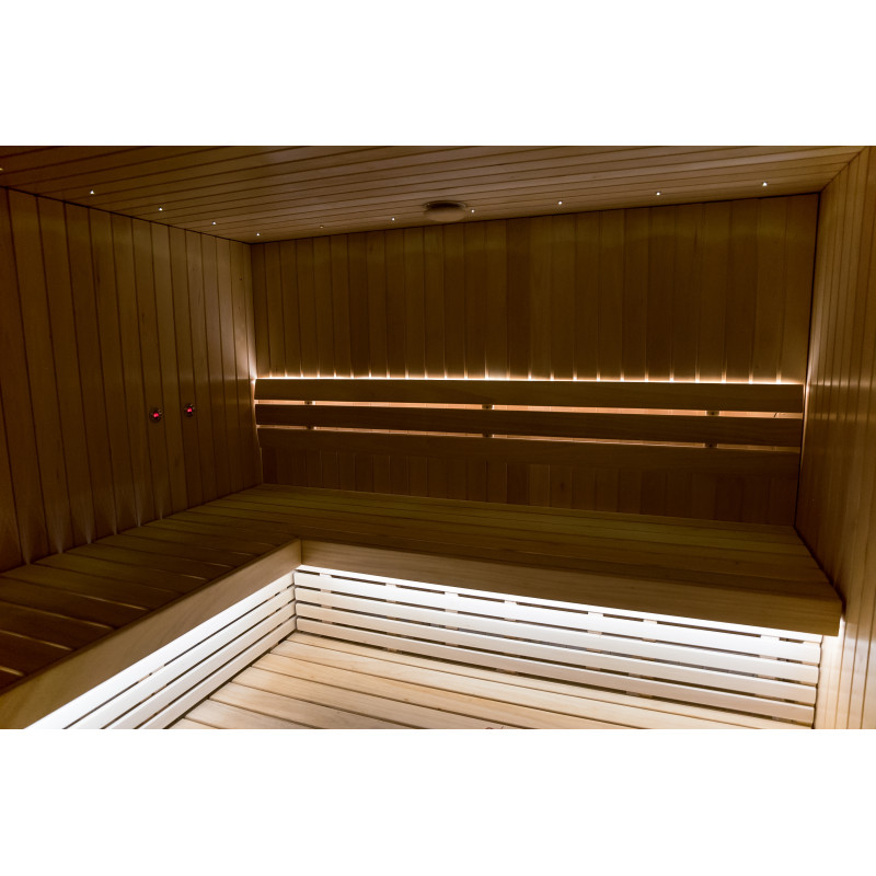 Оборудван с цветно RGB осветление под горните пейки и облегалките. Това осветление за сауна е устойчиво на влага и температура. Цветът на осветлението може да се променя според настроението ви.