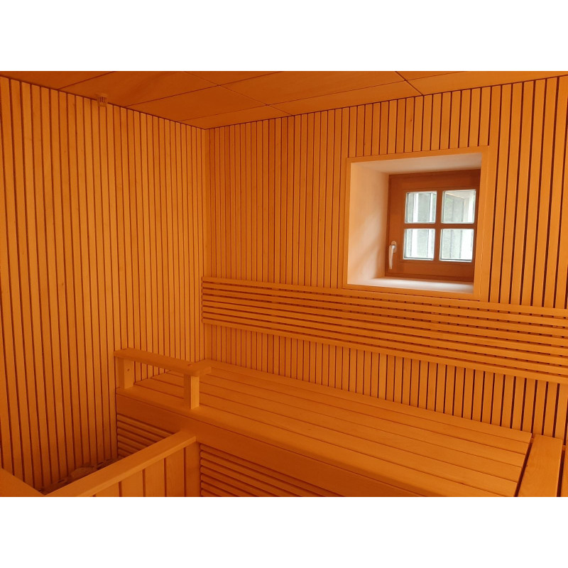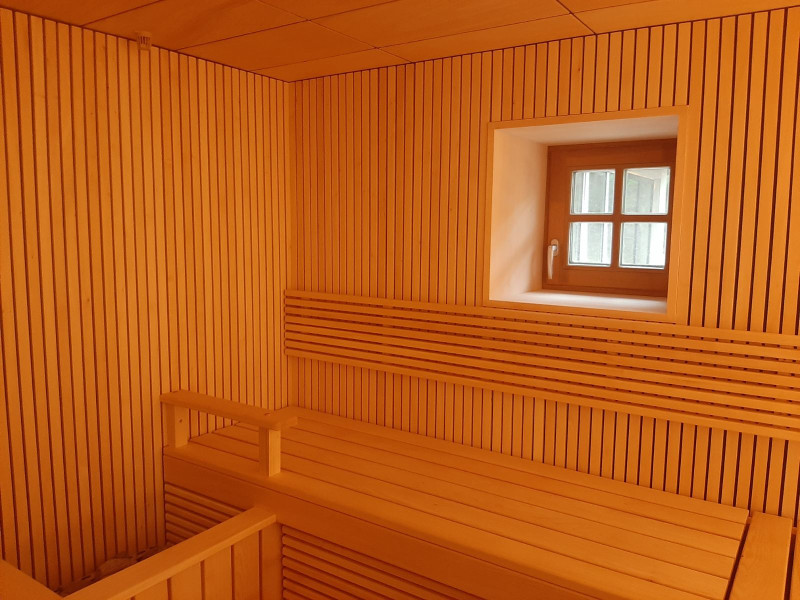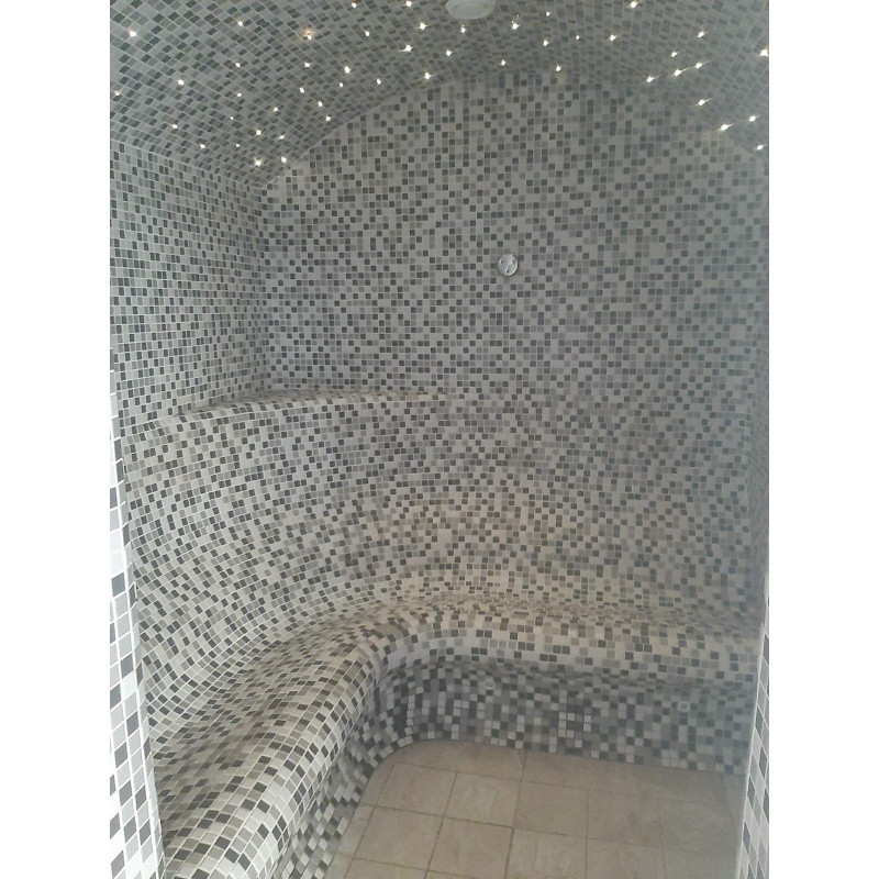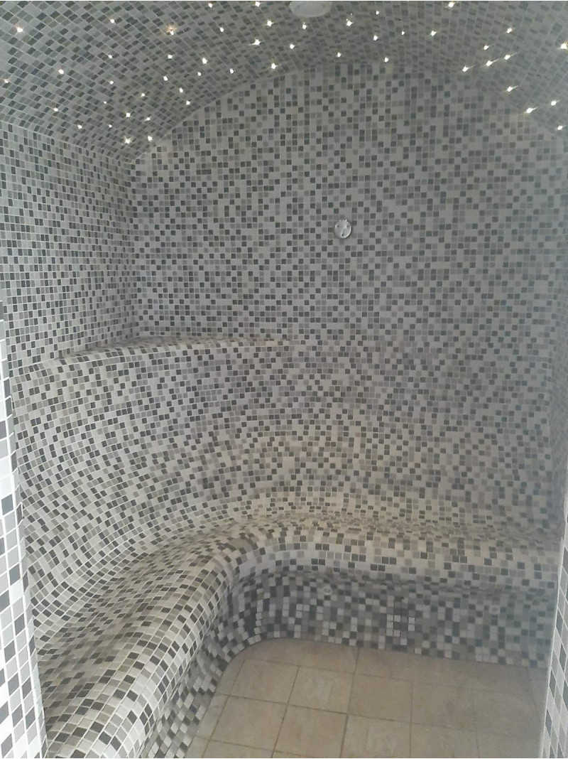 - Парна сауна – използвани материали, които издържат на изключително високи температури и много висока влажност. Таванът е тип арка, за да не капе кондензат от пара върху хората, които се наслаждават на сауната. За декорацията са избрани плочки и оптично осветление за тавана, създавайки ефект на звездно небе. Пейките са в особено удобна форма.