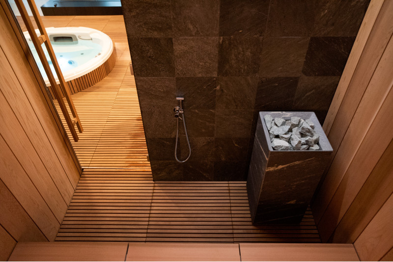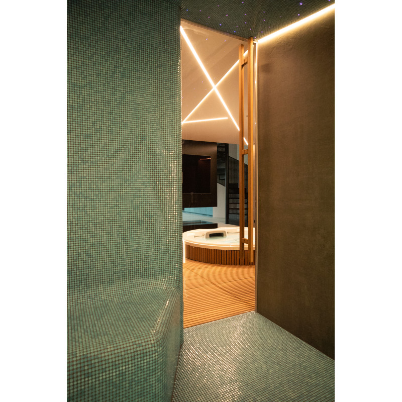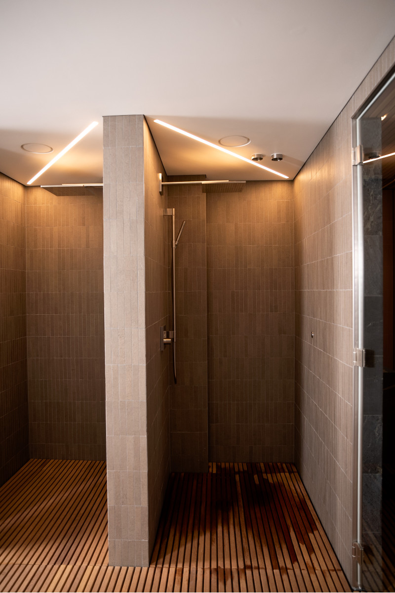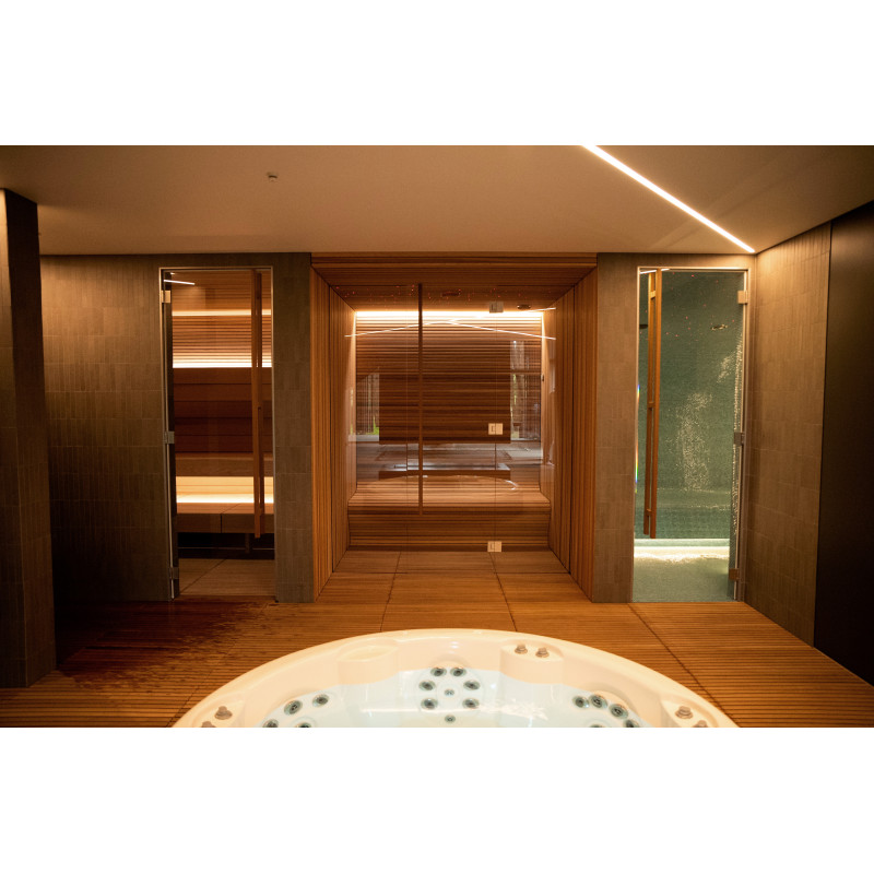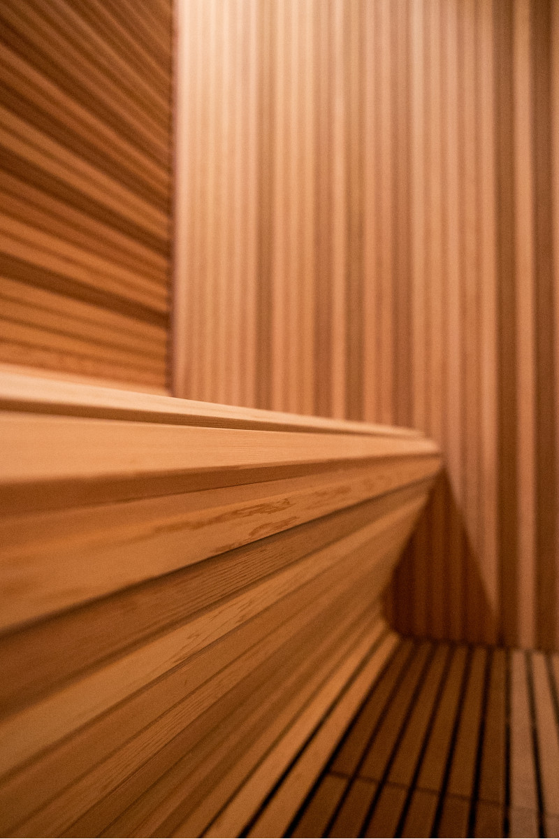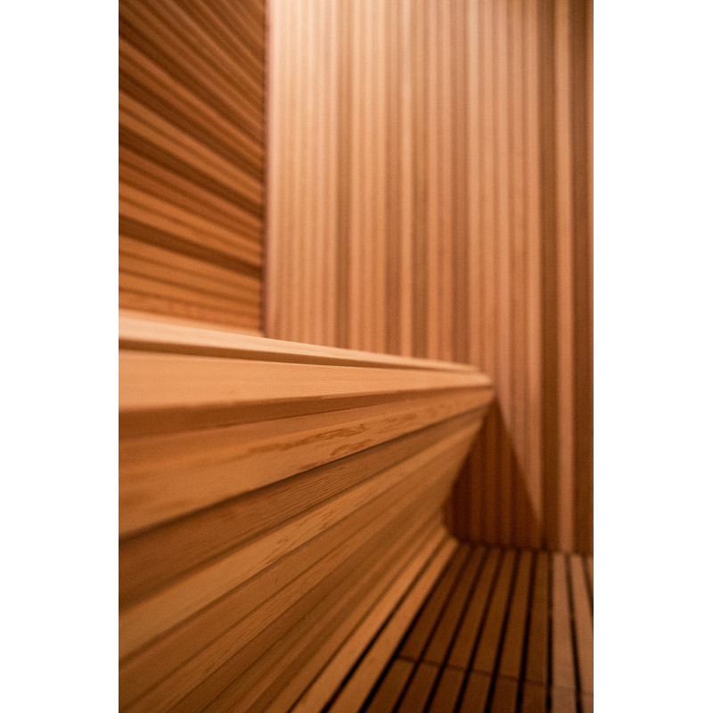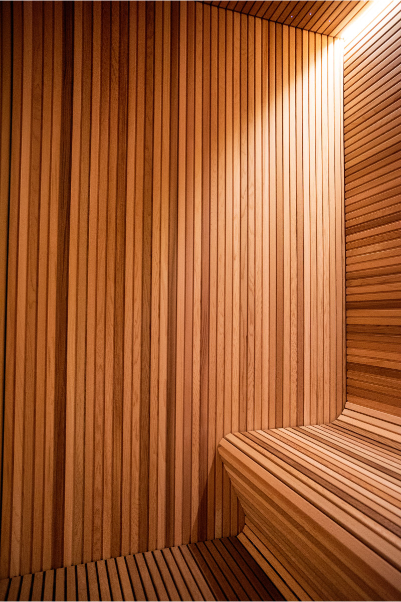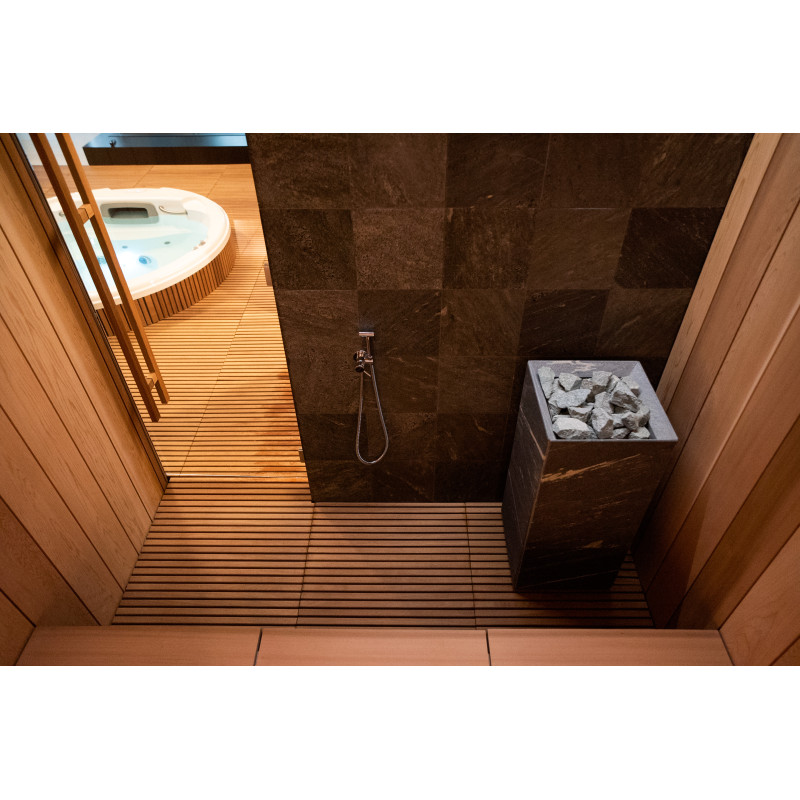 В цялата СПА зона подовите настилки са с естествени дървени решетки от ироко , предлагащи едновременно издръжливост и изискана естетика.