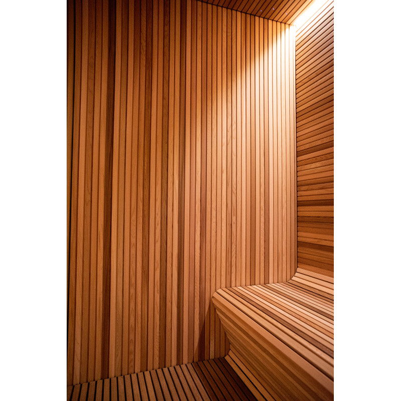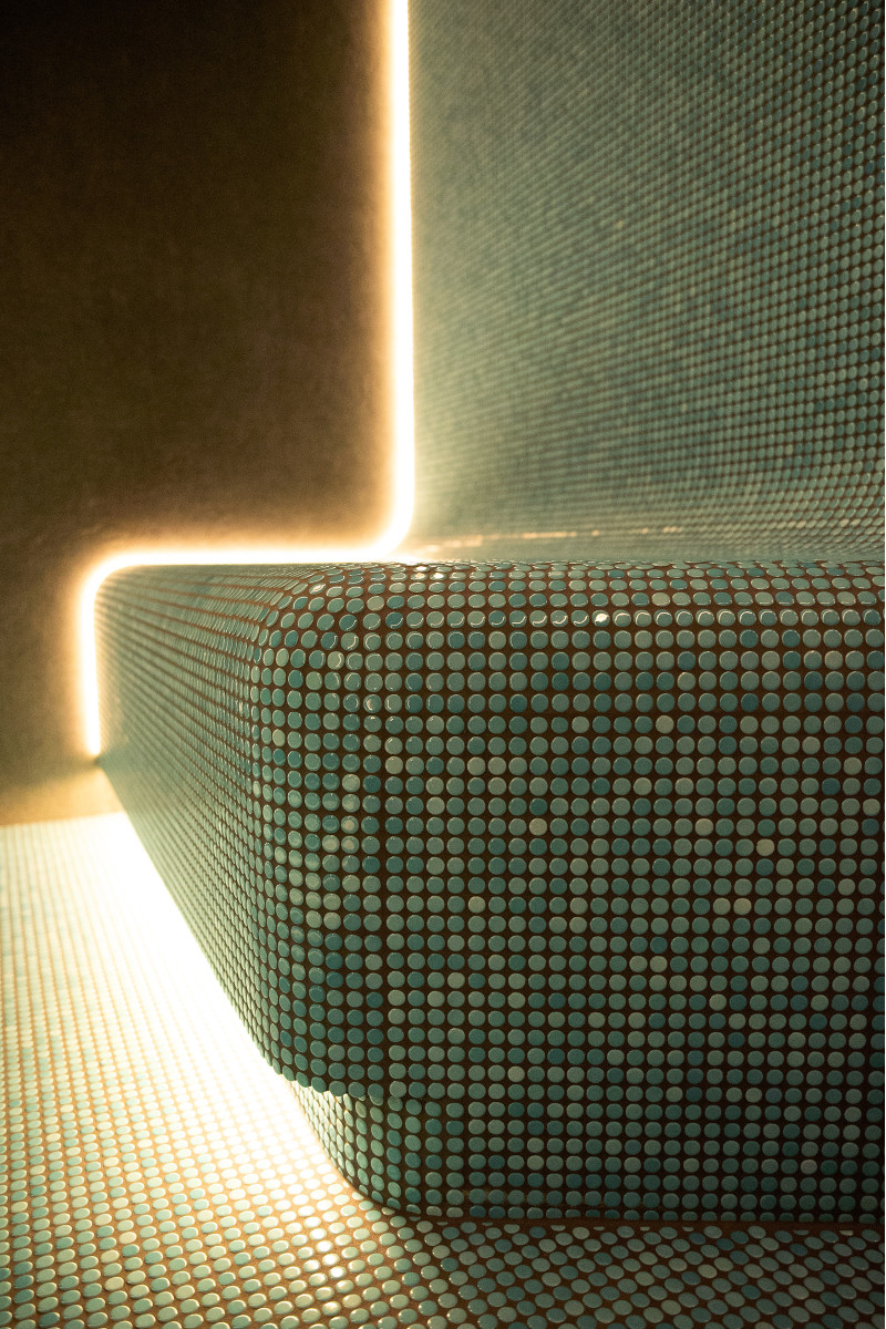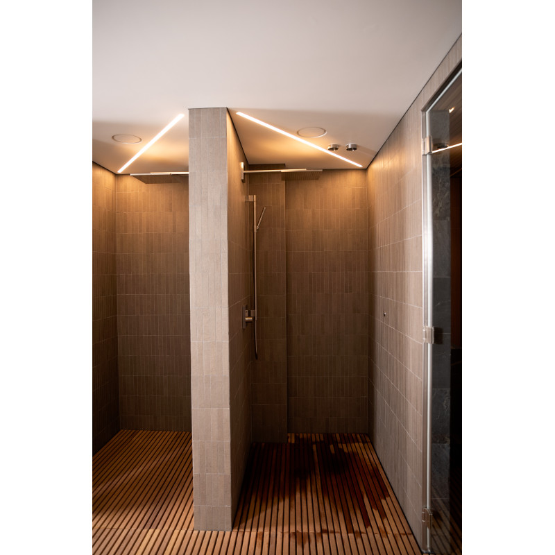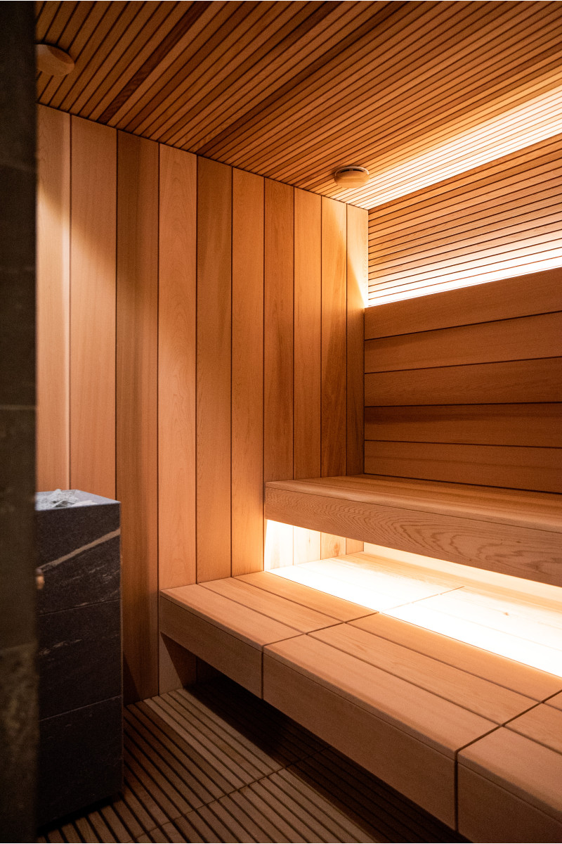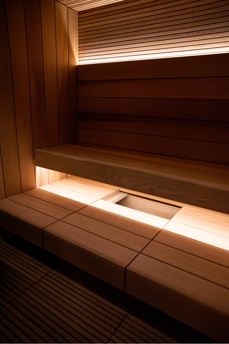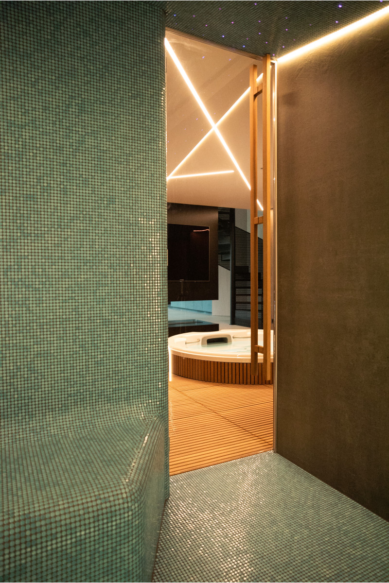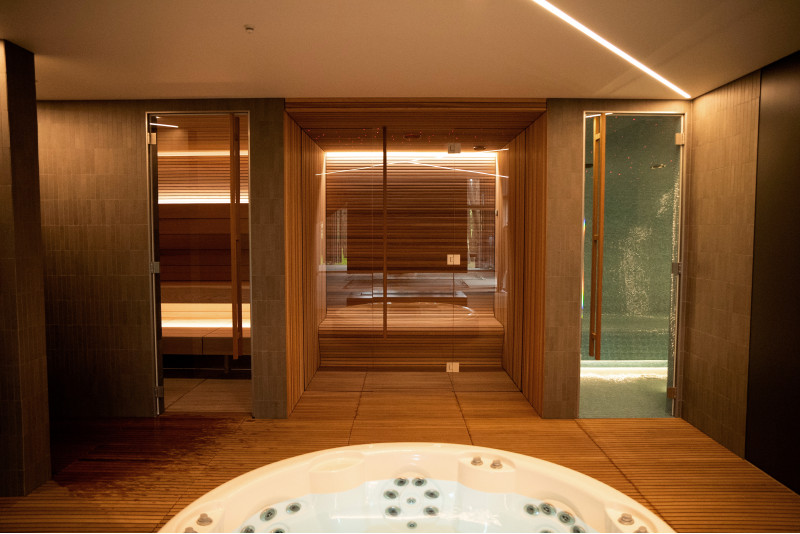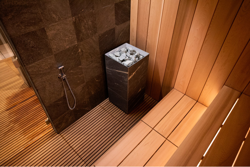 В цялата СПА зона подовите настилки са с естествени дървени решетки от ироко , предлагащи едновременно издръжливост и изискана естетика.