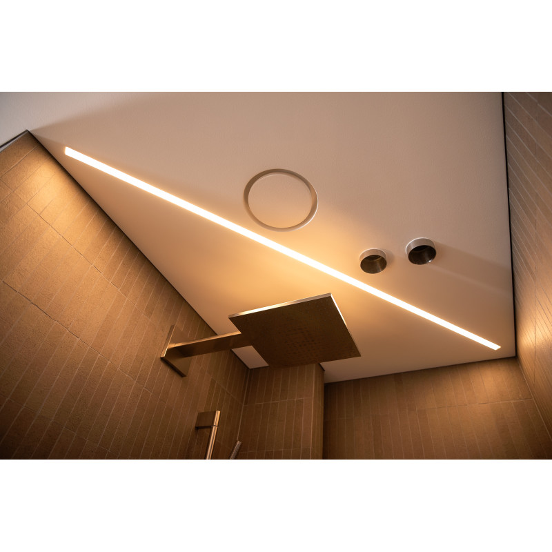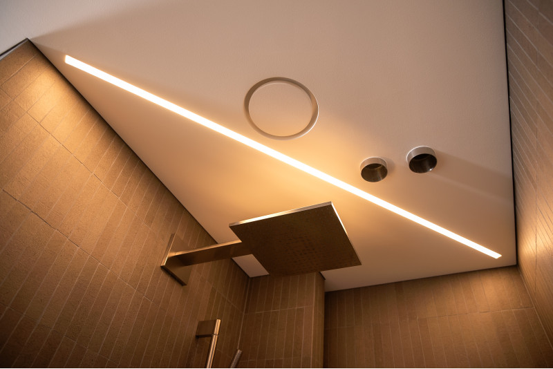 В зоната на душа е инсталирано професионално устройство за обливане, включващо резервоар от неръждаема стомана, изпускателни клапани, разпределителни клонове и пневматичен спусък.