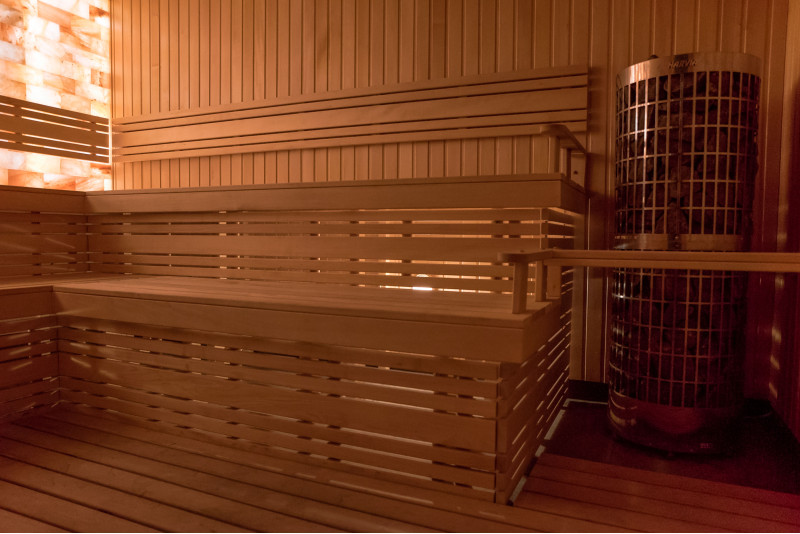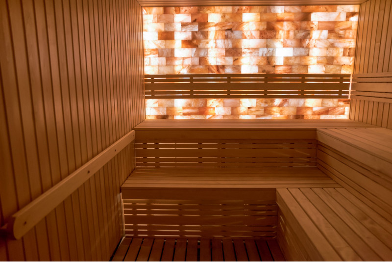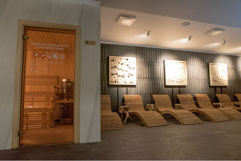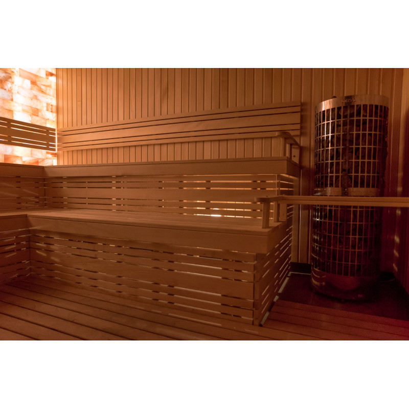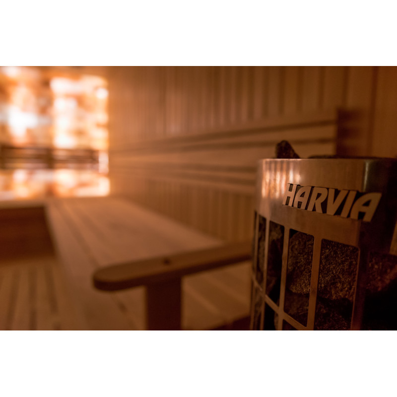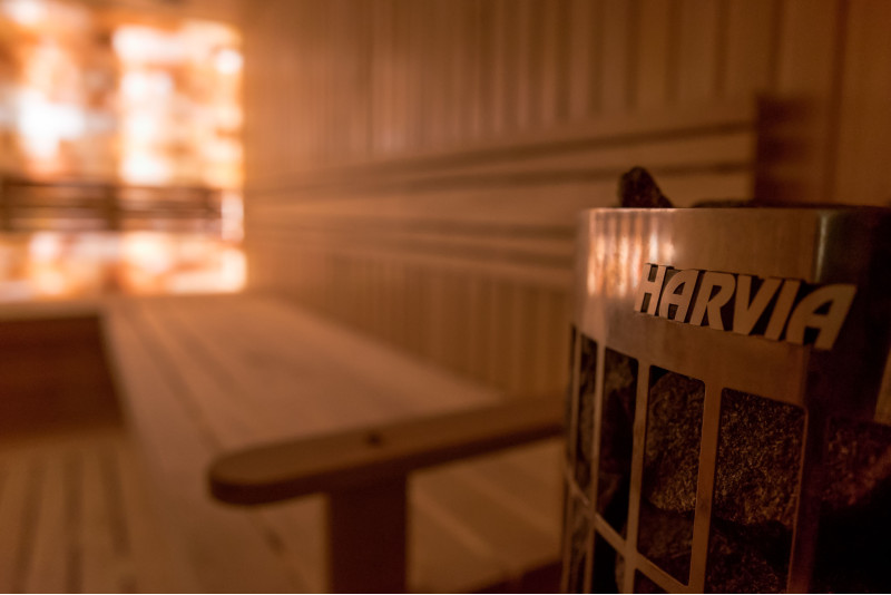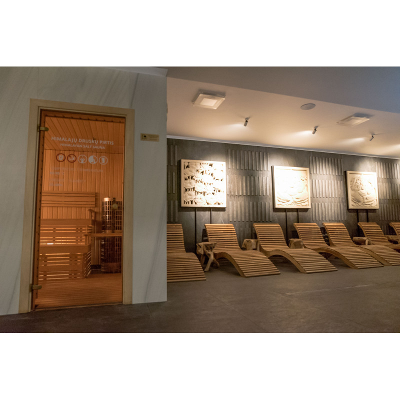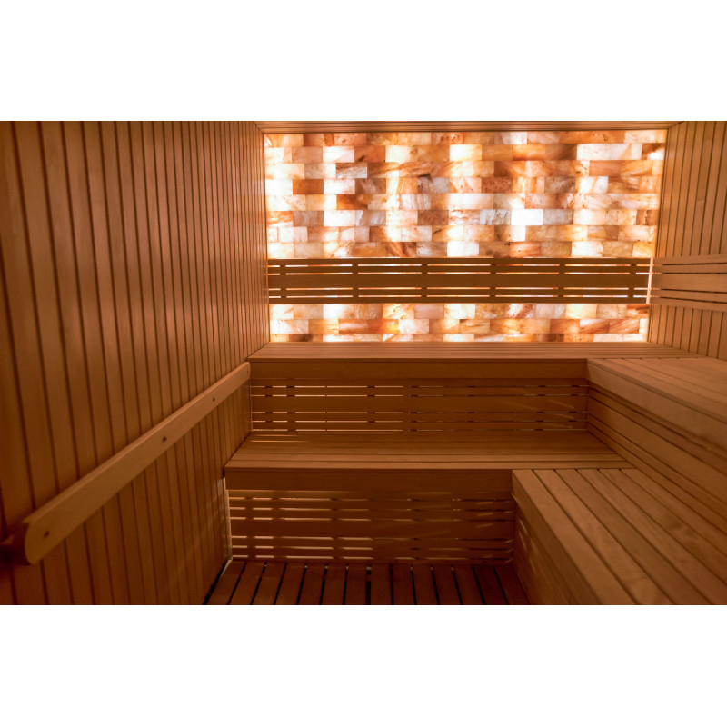 Основният акцент на сауната е впечатляващата и модерно изглеждаща тухлена стена от хималайска сол. Тази стена не само радва с външния си вид, придава на сауната уютна атмосфера, но също така е известно, че хималайската сол има много положителни свойства за човешкото здраве. Хималайската сол има положителен ефект при хора с алергии, бронхиална астма, заболявания на нервната система, укрепва имунната система, повишава настроението и дава енергия. Хималайската сол неутрализира електромагнитното лъчение, намалявайки статичното електричество във въздуха. Стената от хималайска сол е само допълнително подчертана и разкрасена от вграденото LED осветление под тухлите.
