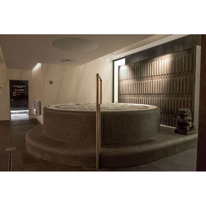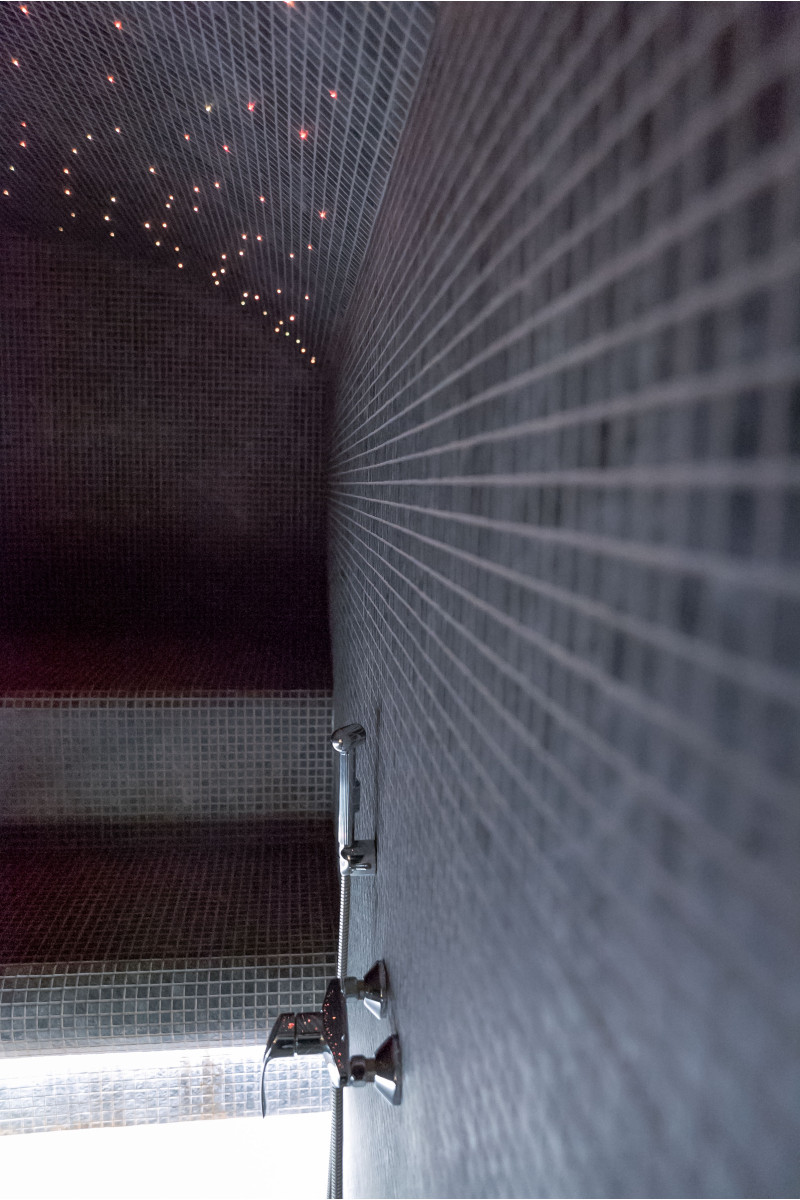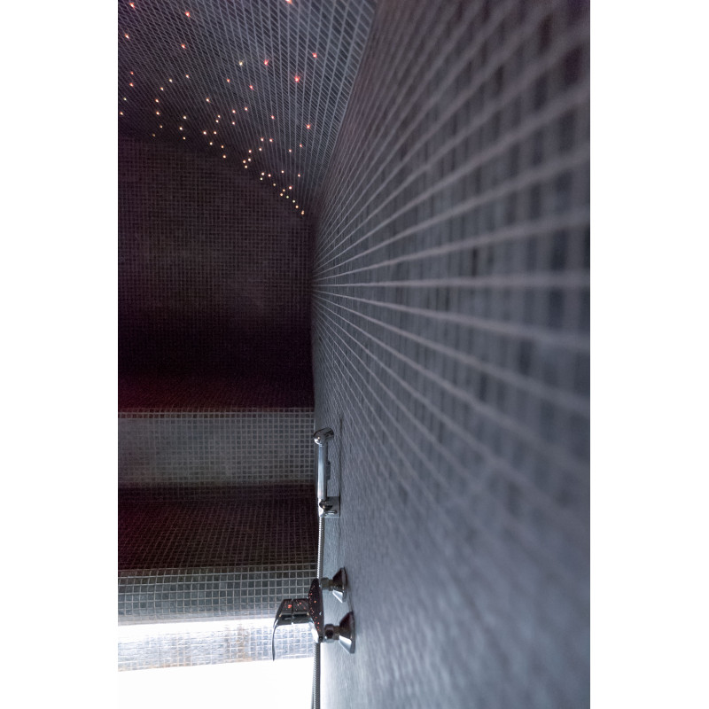 Цялата сауна е декорирана с малки мозаечни плочки, а два музикални колонки създават спокойна и уютна атмосфера.