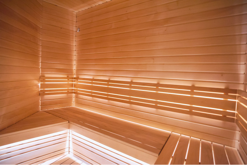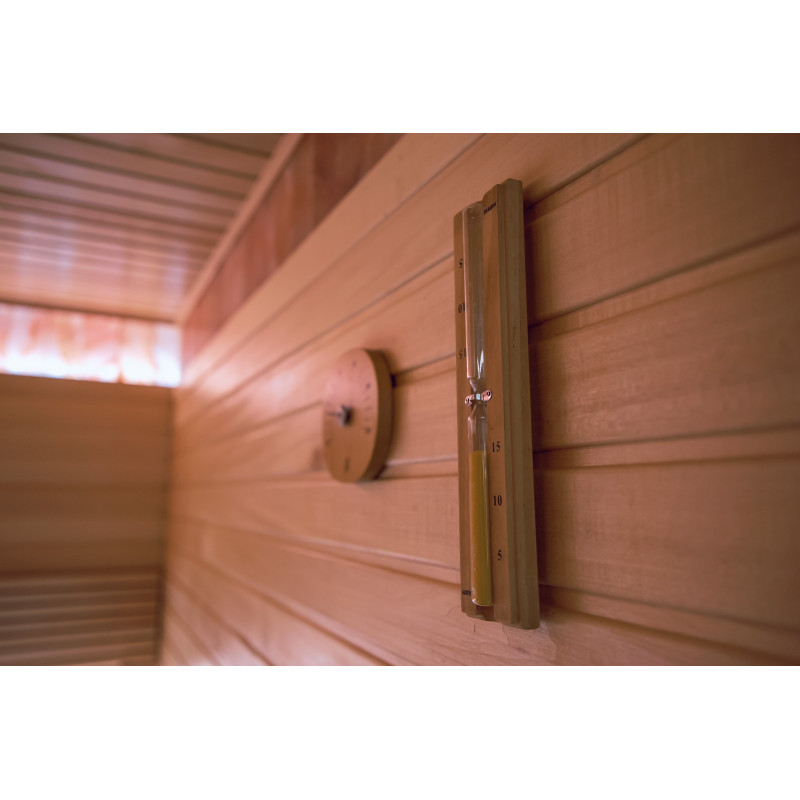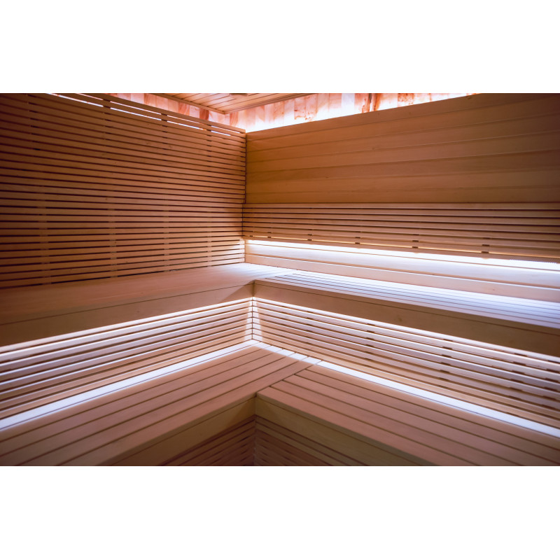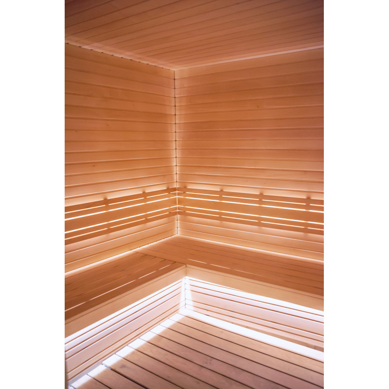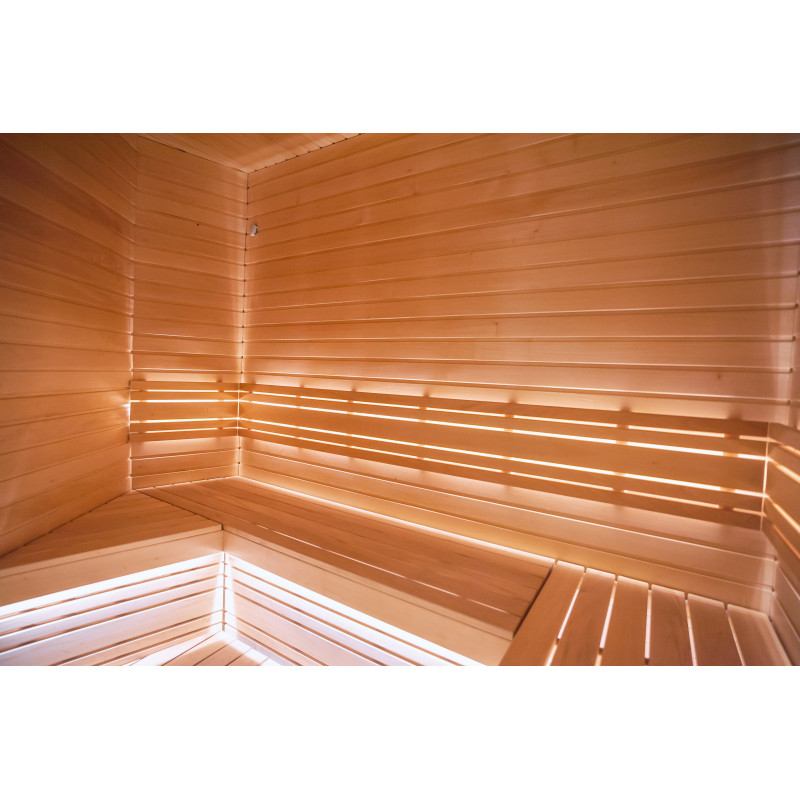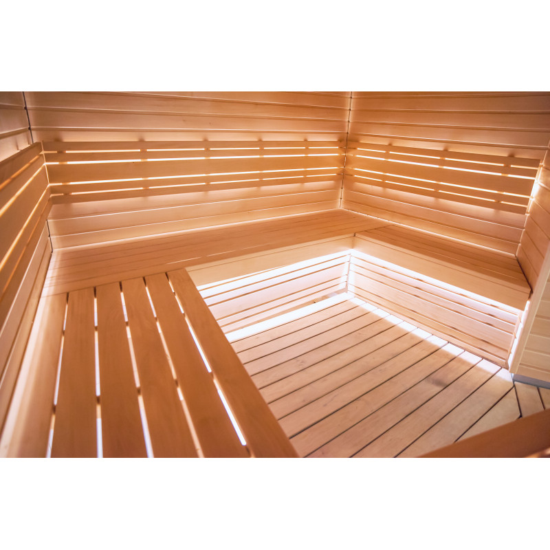 Сауната е оборудвана с вентилационно оборудване, LED осветление под горните легла и в задните опори.