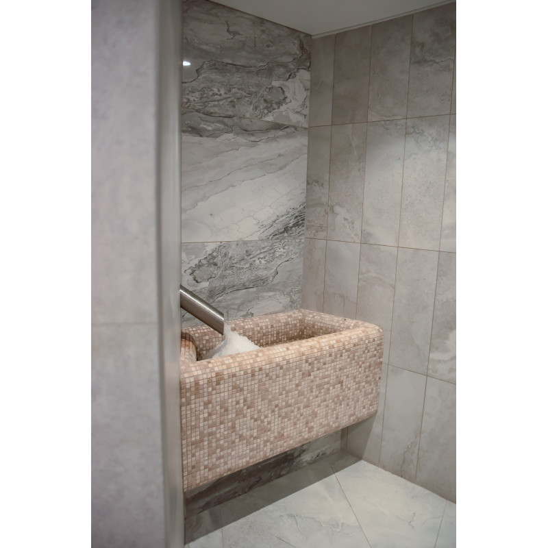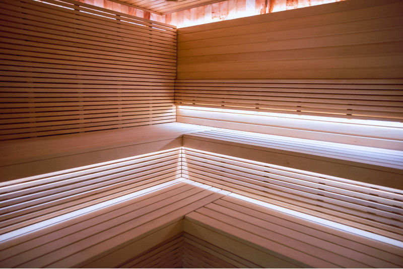 Стена от хималайска сол в модерна сауна е отлично решение както от гледна точка на естетика, така и от гледна точка на подобряване на здравето. На стената точно до тавана, по целия периметър на сауната, се оформя лента от хималайска сол с височина 20 см. Зад солните плочки е монтирано LED осветление.