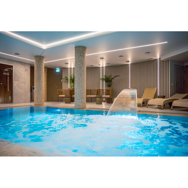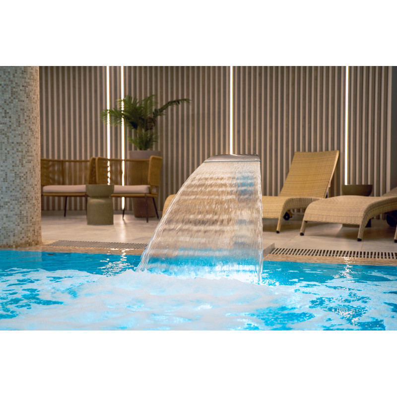 филтри, циркулационна помпа, масажна помпа, автоматична дозираща станция за химикали, бойлер, UV стерилизатор, LED подводен прожектор, двойни водно-въздушни дюзи, въздушни масажни дюзи, преливна решетка, покривало за басейн и др.