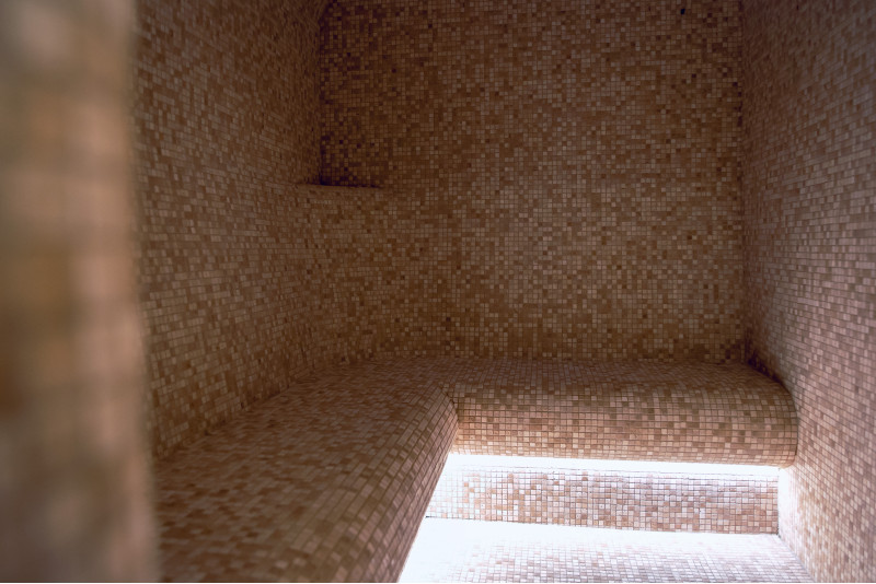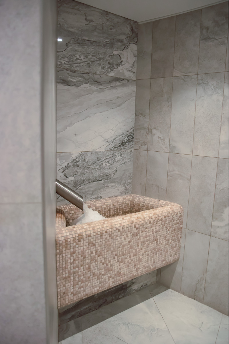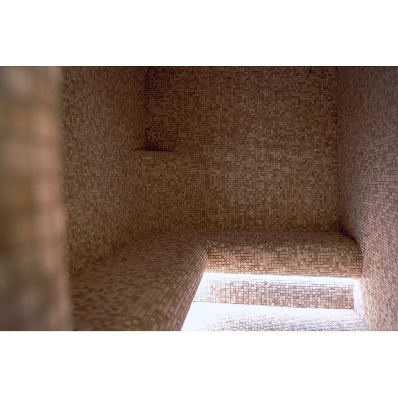 Вътрешните повърхности са формовани от експандиран полистирен с помощта на непрекъснато нарязан XPS стирол. Оформя се таванна арка. Положени мозаечни плочки. Инсталирана е вентилационна система.