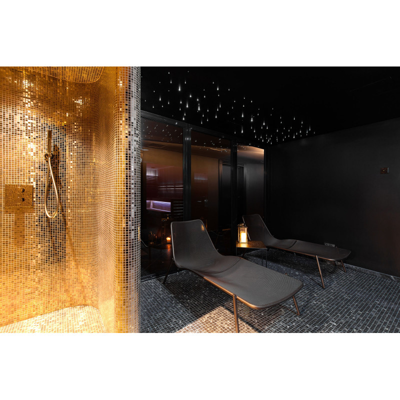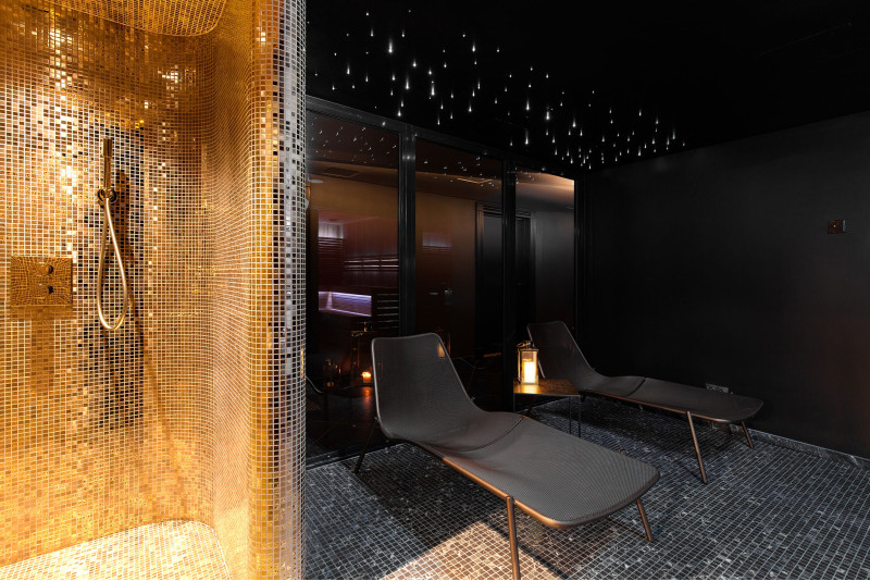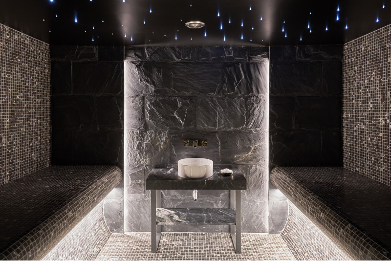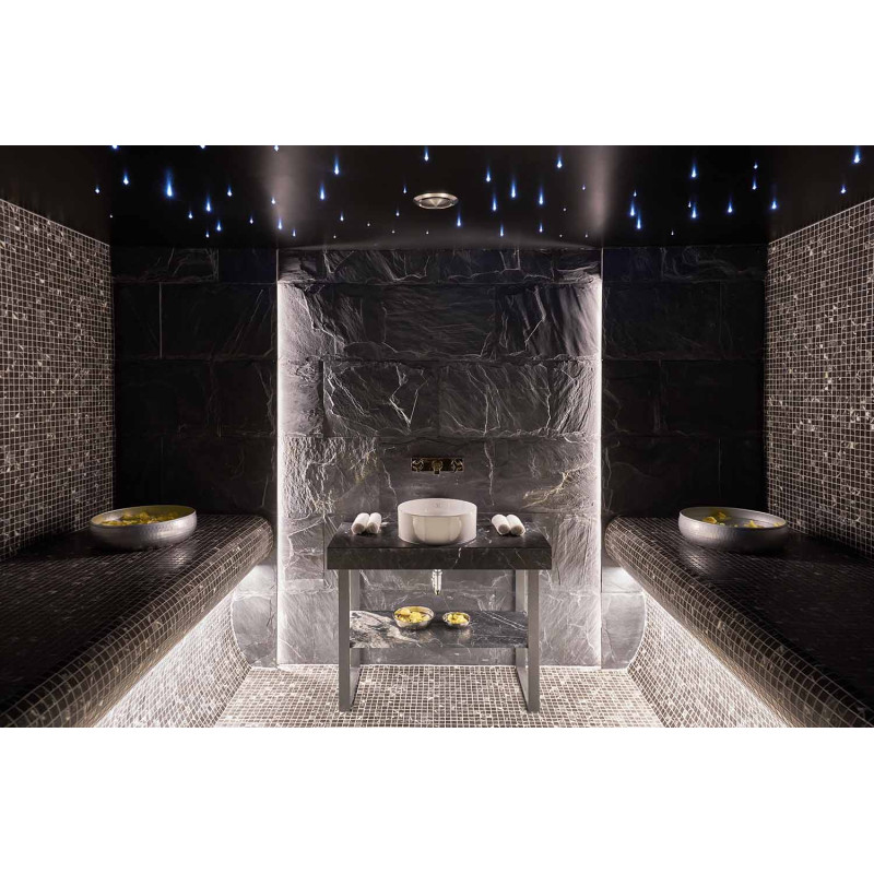 Създавайки безпроблемен стил, стъклена витрина беше избрана и за стаята с хамам. Вътрешните повърхности са оформени по индивидуален проект от експандиран полистирол с непрекъснато режещ EPS стирен. Стените, подовете и пейките на помещението се отопляват. Осветителната система използва LED RGB IP 67, 9м ленти и оптична система "Звездно небе". Лепени мозаечни плочки, адаптирани към кривината и изпълнени със сива хидроизолация Schonox.
